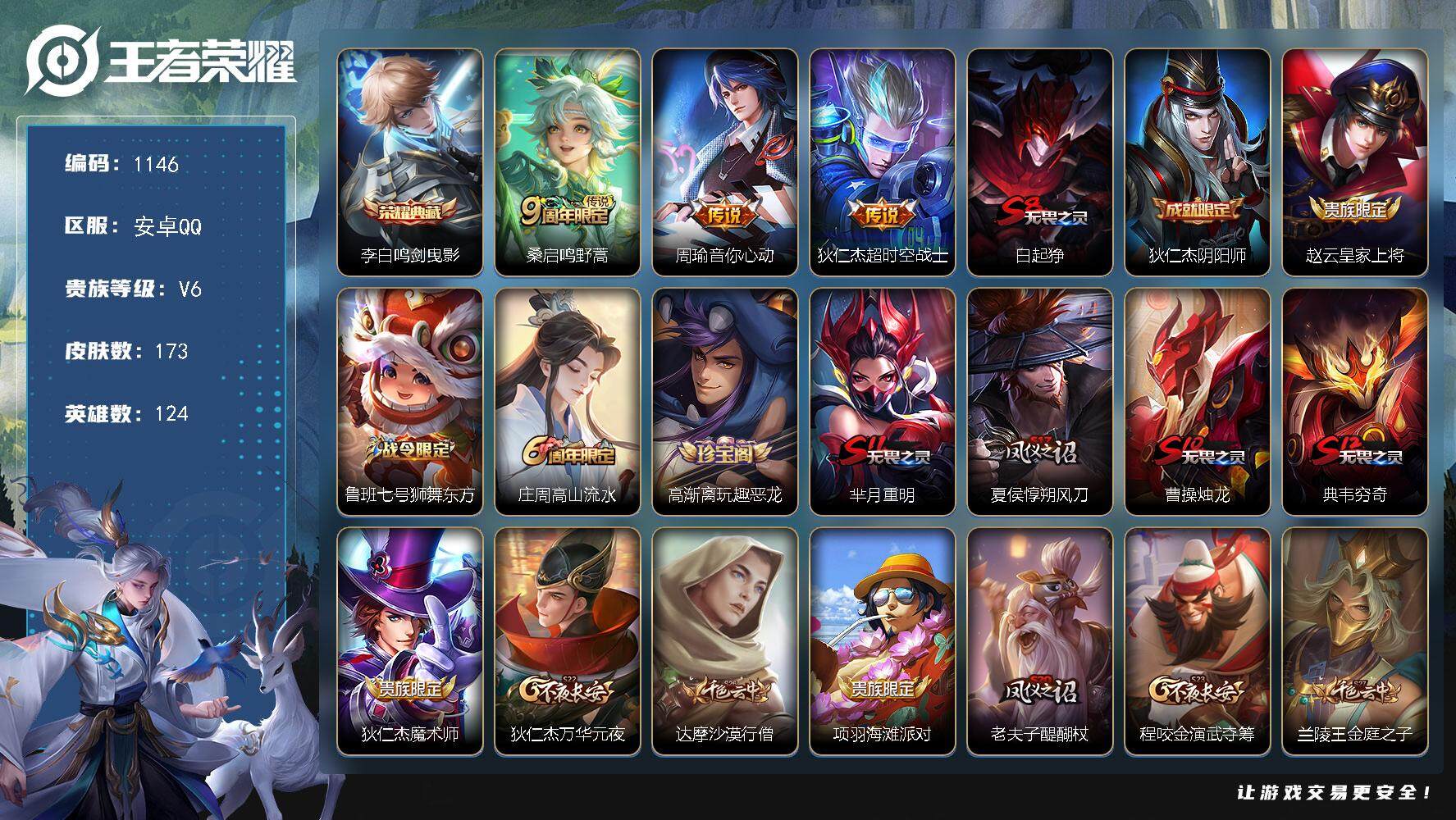 PX_2258920-【173皮1典藏3传说鸣剑曳影,至尊宝】安卓Q-V6-荣耀黄金I段位-124英雄-173皮肤-1典藏-0珍品无双-0无双-0珍品传说-3传说-36史诗 【荣耀典藏】:李白鸣剑曳影 【传说皮肤】:桑启鸣野蒿,周瑜音你心动,狄仁杰超时空战士 【限定皮肤】:白起狰,狄仁杰阴阳师,赵云皇家上将,鲁班七号狮舞东方,庄周高山流水,高渐离玩趣恶龙,芈月重明,夏侯惇朔风刀,曹操烛龙,典韦穷奇,狄仁杰魔术师,狄仁杰万华元夜,达摩沙漠行僧,项羽海滩派对,老夫子醍醐杖,程咬金演武夺筹,兰陵王金庭之子,孙悟空至尊宝,孙悟空大圣娶亲,牛魔御旌,李元芳云中旅人,钟馗神迹守卫,钟馗驱傩正仪,蔡文姬繁星吟游,太乙真人饕餮,鬼谷子原初探秘者,鬼谷子五谷丰年,苏烈千军破阵,百里玄策原初追逐者,弈星混沌棋,沈梦溪大漠名商,明世隐疑决卦,裴擒虎李小龙,裴擒虎擒涛扼浪,狂铁御狮,米莱狄御霄,盾山御銮,猪八戒猪悟能,上官婉儿梁祝,鲁班大师探海日志,桑启海盐诗旅,张良古海寻踪,鬼谷子天穹祈灯,姬小满妄想食味,刘邦剑破天穹 【赛季限定】:白起狰,芈月重明,夏侯惇朔风刀,曹操烛龙,典韦穷奇,狄仁杰万华元夜,达摩沙漠行僧,老夫子醍醐杖,程咬金演武夺筹,兰陵王金庭之子,张良古海寻踪,牛魔御旌,李元芳云中旅人,钟馗驱傩正仪,太乙真人饕餮,鬼谷子原初探秘者,苏烈千军破阵,百里玄策原初追逐者,弈星混沌棋,沈梦溪大漠名商,明世隐疑决卦,裴擒虎擒涛扼浪,狂铁御狮,米莱狄御霄,盾山御銮,鲁班大师探海日志,桑启海盐诗旅,鬼谷子天穹祈灯,刘邦剑破天穹 【战令限定】:鲁班七号狮舞东方,钟馗神迹守卫 【史诗皮肤】:项羽苍穹之光,赵云皇家上将,赵云未来纪元,貂蝉圣诞恋歌,甄姬冰雪圆舞曲,狄仁杰魔术师,廉颇地狱岩魂,宫本武藏鬼剑武藏,孙尚香水果甜心,妲己魅力维加斯,吕布圣诞狂欢,曹操幽灵船长,孙悟空至尊宝,花木兰水晶猎龙者,刘邦德古拉伯爵,小乔缤纷独角兽,亚瑟心灵战警,铠曙光守护者,李元芳逐浪之夏,程咬金功夫厨神,白起星夜王子,孙悟空大圣娶亲,伽罗箭羽风息,鲁班七号狮舞东方,狄仁杰鹰眼统帅,上官婉儿梁祝,蔡文姬繁星吟游,娜可露露晚萤,百里玄策原初追逐者,裴擒虎李小龙,猪八戒猪悟能,庄周高山流水,鬼谷子五谷丰年,刘禅电玩爆裂旋风,姬小满妄想食味,孙膑茶境仙 【其他皮肤】:项羽海滩派对,韩信教廷特使,露娜哥特玫瑰,阿轲爱心护理,达摩大发明家,赵云忍炎影,武则天东方不败,扁鹊化身博士,宫本武藏未来纪元,安琪拉玩偶对对碰,孙膑天使之翼,妲己少女阿狸,典韦黄金武士,亚瑟死亡骑士,达摩拳王,花木兰兔女郎,张飞五福同心,甄姬花好人间,刘备万事如意,宫本武藏万象初新,后羿阿尔法小队,狄仁杰阴阳师,刘备汉昭烈帝,关羽龙腾万里,墨子进击墨子号,白起狰,钟无艳海滩丽影,太乙真人饕餮,宫本武藏霸王丸,曹操烛龙,芈月重明,老夫子功夫老勺,孙尚香沉稳之力,典韦穷奇,诸葛亮掌控之力,李白敏锐之力,鬼谷子幻乐之宴,狂铁御狮,安琪拉如懿,苏烈坚韧之力,大乔守护之力,米莱狄御霄,明世隐虹云星官,张良幽兰居士,牛魔御旌,小乔丁香结,吕布野性能量,钟馗神迹守卫,盾山御銮,孙膑归虚梦演,高渐离玩趣恶龙,沈梦溪鲨炮海盗猫,姜子牙炽热元素使,夏侯惇朔风刀,弈星混沌棋,哪吒次元突破,鲁班七号黑桃队长,明世隐疑决卦,盾山圆桌骑士,老夫子醍醐杖,狂铁特工战影,鬼谷子原初探秘者,狄仁杰万华元夜,刘禅秘密基地,程咬金演武夺筹,张良缤纷绘卷,钟馗驱傩正仪,苏烈千军破阵,达摩沙漠行僧,程咬金无双福将,刘邦虎啸剑宗,兰陵王金庭之子,刘禅唤灵魔甲,沈梦溪大漠名商,蒙恬蔚蓝守将,李元芳云中旅人,桑启海盐诗旅,猪八戒潮玩探月行,赵怀真太极少年,裴擒虎擒涛扼浪,太乙真人劲辣红锅,鲁班大师探海日志,姬小满零食大作战,张良古海寻踪,鬼谷子天穹祈灯,廉颇功夫炙烤,刘邦剑破天穹,东皇太一噬灭天穹,干将莫邪雾都夜雨,苍苍林狼骑,太乙真人谧流熔炉,典韦铁骨偃魂,马超访茗客,西施雪境奇遇,姜子牙星梦巡礼,戈娅玫蓝誓约,白起死霸装,艾琳鹤鸣心笺,鲁班七号福禄兄弟,高渐离金属狂潮,程咬金华尔街大亨,王昭君精灵公主,曹操死神来了,张良一千零一夜,孙膑未来旅行,孙悟空西部大镖客,后羿精灵王,李白范海辛,李元芳特种部队,虞姬加勒比小姐,关羽天启骑士,夏侯惇战争骑士,雅典娜战争女神,马可波罗激情绿茵,哪吒三太子,东皇太一东海龙王,铠龙域领主,百里守约绝影神枪,梦奇美梦成真,公孙离花间舞,杨玉环霓裳曲,裴擒虎街头旋风,米莱狄精准探案法,盾山极冰防御线,沈梦溪棒球奇才,李信灼热之刃,猪八戒年年有余,蒙犽归虚梦演,阿古朵熊喵少女,澜孤猎,云缨赤焰之缨,金蝉前尘,桑启画中游 【内测皮肤】:高渐离玩趣恶龙,狂铁特工战影 【营地ID】:468049320