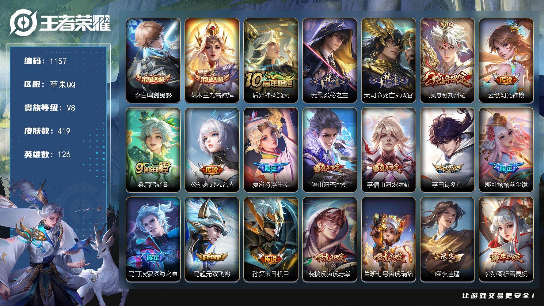 PX_2258959-【419皮2典藏29传说九霄神辉,鸣剑,诡秘之主,死亡执政官,浮生妄,祈雪灵祝】苹果Q-V8-最强王者段位-126英雄-419皮肤-2典藏-0珍品无双-0无双-0珍品传说-29传说-132史诗 【英雄全皮】:元歌全皮,刘邦全皮,孙权全皮,娜可露露全皮,鬼谷子全皮,苏烈全皮,狂铁全皮,猪八戒全皮,蒙恬全皮,镜全皮,夏洛特全皮,戈娅全皮,空空儿全皮,影全皮 【荣耀典藏】:李白鸣剑曳影,花木兰九霄神辉 【传说皮肤】:后羿神树通天,元歌诡秘之主,大司命死亡执政官,澜愿照九州拓,云缨幻光神枪,桑启鸣野蒿,公孙离记忆之芯,夏洛特浮生妄,曜山海苍雷引,李信山海炽霜斩,李白诗剑行,娜可露露前尘镜,马可波罗深海之息,马超无双飞将,孙策末日机甲,裴擒虎寅虎赤拳,鲁班七号寅虎瑞焰,曜李逍遥,,公孙离祈雪灵祝,镜炽阳神光,虞姬启明星使,关羽武圣,刘备时之恋人,百里玄策白虎志,后羿黄金射手座,杨戬永曜之星,孙尚香末日机甲,宫本武藏地狱之眼,狄仁杰超时空战士 【限定皮肤】:白起狰,蒙犽顽岩魄,虞姬夏日便利店,姜子牙天穹之誓,杨戬破阵退雄兵,李白谪仙醉月,狄仁杰阴阳师,虞姬凯尔特女王,廉颇寅虎御盾,赵云皇家上将,赵云引擎之心,墨子神迹守卫,嬴政优雅恋人,嬴政白昼王子,鲁班七号寅虎瑞焰,庄周云端筑梦师,庄周高山流水,高渐离死亡摇滚,阿轲迷踪丽影,钟无艳超时空战士,扁鹊炼金王,扁鹊奇幻香踪,白起夜都怪侠,芈月重明,芈月幻夜卜梦,吕布猎兽之王,元歌云间偶戏,元歌无心,夏侯惇朔风刀,甄姬游园惊梦,甄姬落雪兰心,曹操烛龙,典韦穷奇,典韦蓝屏警告,马可波罗暗影游猎,马可波罗深海之息,狄仁杰魔术师,狄仁杰万华元夜,达摩星际陆战队,达摩沙漠行僧,项羽海滩派对,老夫子醍醐杖,老夫子航海奇遇记,关羽冰锋战神,关羽武圣,程咬金演武夺筹,露娜一生所爱,刘邦夺宝奇兵,韩信傲雪梅枪,王昭君午后时光,兰陵王金庭之子,花木兰瑞麟志,娜可露露前尘镜,亚瑟潮玩骑士王,孙悟空大圣娶亲,孙悟空孙行者,牛魔御旌,后羿圣弓游侠,李元芳云中旅人,虞姬霸王别姬,虞姬启明星使,钟馗驱傩正仪,杨玉环遇见飞天,杨戬永曜之星,杨戬潮玩骑兵,女娲朔望之晖,干将莫邪冰霜恋舞曲,干将莫邪真爱魔法,雅典娜单词大作战,雅典娜黎明之约,蔡文姬繁星吟游,太乙真人饕餮,鬼谷子原初探秘者,鬼谷子五谷丰年,黄忠烈魂,黄忠火炮绅士,铠青龙志,苏烈玄武志,苏烈千军破阵,百里玄策白虎志,百里玄策原初追逐者,百里守约朱雀志,弈星混沌棋,梦奇顽趣,公孙离祈雪灵祝,沈梦溪大漠名商,明世隐疑决卦,明世隐吟游魔法,裴擒虎天狼狩猎者,裴擒虎李小龙,裴擒虎寅虎赤拳,裴擒虎擒涛扼浪,狂铁御狮,狂铁电玩高手,米莱狄御霄,米莱狄胡桃异想国,云中君纤云弄巧,云中君时之祈愿,李信山海炽霜斩,盾山御銮,猪八戒西部大镖客,猪八戒猪悟能,上官婉儿梁祝,嫦娥拒霜思,嫦娥暖冬兔眠,曜李逍遥,,曜山海苍雷引,西施玲珑珍味,蒙犽狂想玩偶喵,鲁班大师探海日志,镜匿光追影者,桑启海盐诗旅,夏洛特浮生妄,暃星界游侠,戈娅驭风魔法,艾琳女武神,艾琳流音漫舞,赵怀真鹤归松栖,司空震地狱燃心,阿古朵江河有灵,张良古海寻踪,蒙恬荣光圣徽,鬼谷子天穹祈灯,姬小满妄想食味,沈梦溪龙舞盛年,刘邦剑破天穹,程咬金群星魔术团,镜青焰无极,项羽苍威无极,周瑜熔金海岸 【年限皮肤】:百里玄策白虎志,百里守约朱雀志,花木兰瑞麟志,铠青龙志,苏烈玄武志,裴擒虎寅虎赤拳,鲁班七号寅虎瑞焰,廉颇寅虎御盾,杨戬永曜之星,公孙离祈雪灵祝,马超神威,关羽武圣,黄忠烈魂,李信山海炽霜斩,曜山海苍雷引 【赛季限定】:扁鹊炼金王,白起狰,芈月重明,夏侯惇朔风刀,曹操烛龙,典韦穷奇,狄仁杰万华元夜,达摩沙漠行僧,老夫子醍醐杖,程咬金演武夺筹,兰陵王金庭之子,张良古海寻踪,牛魔御旌,李元芳云中旅人,虞姬凯尔特女王,钟馗驱傩正仪,雅典娜黎明之约,太乙真人饕餮,鬼谷子原初探秘者,苏烈千军破阵,百里玄策原初追逐者,弈星混沌棋,梦奇顽趣,沈梦溪大漠名商,明世隐疑决卦,裴擒虎擒涛扼浪,狂铁御狮,米莱狄御霄,盾山御銮,鲁班大师探海日志,桑启海盐诗旅,鬼谷子天穹祈灯,蒙恬荣光圣徽,刘邦剑破天穹,姜子牙天穹之誓 【战令限定】:墨子神迹守卫,虞姬夏日便利店,嬴政白昼王子,阿轲迷踪丽影,钟无艳超时空战士,扁鹊奇幻香踪,白起夜都怪侠,芈月幻夜卜梦,吕布猎兽之王,元歌云间偶戏,甄姬落雪兰心,典韦蓝屏警告,马可波罗暗影游猎,达摩星际陆战队,老夫子航海奇遇记,刘邦夺宝奇兵,王昭君午后时光,艾琳流音漫舞,亚瑟潮玩骑士王,后羿圣弓游侠,杨戬潮玩骑兵,女娲朔望之晖,干将莫邪真爱魔法,雅典娜单词大作战,黄忠火炮绅士,明世隐吟游魔法,狂铁电玩高手,米莱狄胡桃异想国,猪八戒西部大镖客,嫦娥暖冬兔眠,西施玲珑珍味,蒙犽狂想玩偶喵,司空震地狱燃心,暃星界游侠,戈娅驭风魔法,镜青焰无极,项羽苍威无极 【史诗皮肤】:鲁班七号电玩小子,项羽苍穹之光,露娜紫霞仙子,阿轲暗夜猫娘,赵云皇家上将,赵云未来纪元,貂蝉圣诞恋歌,甄姬冰雪圆舞曲,狄仁杰魔术师,廉颇地狱岩魂,宫本武藏鬼剑武藏,孙尚香水果甜心,嬴政优雅恋人,嬴政暗夜贵公子,嬴政摇滚巨星,妲己魅力维加斯,妲己女仆咖啡,墨子金属风暴,吕布圣诞狂欢,刘禅绅士熊喵,曹操幽灵船长,李白千年之狐,吕布末日机甲,张飞乱世虎臣,韩信白龙吟,虞姬霸王别姬,关羽冰锋战神,赵云引