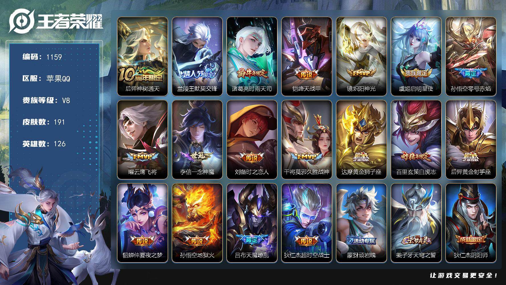 PX_2258963-【191皮18传说,白虎志,炽阳神光,地狱火,天魔缭乱,仲夏夜之梦】苹果Q-V8-尊贵铂金I段位-126英雄-191皮肤-0典藏-0珍品无双-0无双-0珍品传说-18传说-57史诗 【传说皮肤】:后羿神树通天,兰陵王默契交锋,诸葛亮时雨天司,铠绛天战甲,镜炽阳神光,虞姬启明星使,孙悟空零号赤焰,曜云鹰飞将,李信一念神魔,刘备时之恋人,干将莫邪久胜战神,达摩黄金狮子座,百里玄策白虎志,后羿黄金射手座,貂蝉仲夏夜之梦,孙悟空地狱火,吕布天魔缭乱,狄仁杰超时空战士 【限定皮肤】:蒙犽顽岩魄,姜子牙天穹之誓,狄仁杰阴阳师,赵云皇家上将,赵云龙胆,墨子神迹守卫,嬴政优雅恋人,鲁班七号乒乒小将,阿轲迷踪丽影,吕布天魔缭乱,元歌云间偶戏,马可波罗暗影游猎,狄仁杰魔术师,狄仁杰万华元夜,项羽海滩派对,老夫子醍醐杖,老夫子航海奇遇记,关羽冰锋战神,程咬金演武夺筹,刘邦夺宝奇兵,兰陵王默契交锋,花木兰默契交锋,亚瑟潮玩骑士王,孙悟空至尊宝,孙悟空大圣娶亲,孙悟空零号赤焰,虞姬启明星使,钟馗驱傩正仪,雅典娜单词大作战,雅典娜黎明之约,鬼谷子原初探秘者,诸葛亮时雨天司,百里玄策白虎志,弈星混沌棋,明世隐疑决卦,裴擒虎天狼狩猎者,裴擒虎李小龙,云中君纤云弄巧,猪八戒西部大镖客,上官婉儿天狼绘梦者,蒙犽狂想玩偶喵,鬼谷子天穹祈灯,沈梦溪龙舞盛年,鲁班七号蔬乡物语,李元芳蔬乡物语,刘邦剑破天穹,程咬金群星魔术团,周瑜熔金海岸 【年限皮肤】:百里玄策白虎志,诸葛亮时雨天司,马超神威,赵云龙胆 【赛季限定】:狄仁杰万华元夜,老夫子醍醐杖,程咬金演武夺筹,钟馗驱傩正仪,雅典娜黎明之约,鬼谷子原初探秘者,弈星混沌棋,明世隐疑决卦,鬼谷子天穹祈灯,刘邦剑破天穹,姜子牙天穹之誓 【战令限定】:墨子神迹守卫,阿轲迷踪丽影,元歌云间偶戏,马可波罗暗影游猎,老夫子航海奇遇记,刘邦夺宝奇兵,亚瑟潮玩骑士王,雅典娜单词大作战,猪八戒西部大镖客,蒙犽狂想玩偶喵,鲁班七号蔬乡物语,李元芳蔬乡物语 【史诗皮肤】:项羽苍穹之光,露娜紫霞仙子,阿轲暗夜猫娘,赵云皇家上将,甄姬冰雪圆舞曲,狄仁杰魔术师,宫本武藏鬼剑武藏,嬴政优雅恋人,嬴政摇滚巨星,妲己魅力维加斯,妲己女仆咖啡,墨子龙骑士,刘禅绅士熊喵,曹操幽灵船长,李白千年之狐,吕布末日机甲,张飞乱世虎臣,关羽冰锋战神,孙悟空至尊宝,花木兰水晶猎龙者,刘邦德古拉伯爵,夏侯惇乘风破浪,小乔缤纷独角兽,兰陵王暗隐猎兽者,雅典娜冰冠公主,安琪拉心灵骇客,百里守约特工魅影,铠曙光守护者,李元芳逐浪之夏,程咬金功夫厨神,白起星夜王子,孙策猫狗日记,孙悟空大圣娶亲,伽罗箭羽风息,裴擒虎天狼狩猎者,狄仁杰鹰眼统帅,公孙离无限星赏官,娜可露露晚萤,不知火舞魅语,阿轲迷踪丽影,橘右京修罗,马超神威,赵云龙胆,孙尚香时之恋人,上官婉儿天狼绘梦者,马可波罗暗影游猎,蒙犽狂想玩偶喵,裴擒虎李小龙,云中君纤云弄巧,元歌云间偶戏,花木兰默契交锋,百里玄策热力回旋,老夫子航海奇遇记,鲁班七号乒乒小将,雅典娜黎明之约,鲁班七号蔬乡物语,蒙犽顽岩魄 【其他皮肤】:项羽海滩派对,韩信街头霸王,露娜哥特玫瑰,阿轲爱心护理,达摩大发明家,赵云忍炎影,芈月红桃皇后,白起白色死神,牛魔西部大镖客,扁鹊化身博士,宫本武藏未来纪元,安琪拉玩偶对对碰,亚瑟死亡骑士,达摩拳王,花木兰兔女郎,宫本武藏万象初新,后羿阿尔法小队,狄仁杰阴阳师,关羽龙腾万里,钟无艳海滩丽影,狂铁命运角斗场,老夫子功夫老勺,苏烈坚韧之力,大乔守护之力,吕布野性能量,沈梦溪鲨炮海盗猫,弈星混沌棋,哪吒次元突破,明世隐疑决卦,刘邦夺宝奇兵,盾山圆桌骑士,老夫子醍醐杖,猪八戒西部大镖客,狂铁特工战影,廉颇无尽征程,鬼谷子原初探秘者,雅典娜单词大作战,狄仁杰万华元夜,亚瑟潮玩骑士王,杨戬次元傲视,露娜瓷语鉴心,程咬金演武夺筹,张良缤纷绘卷,盘古重装意志,钟馗驱傩正仪,墨子神迹守卫,鲁班大师乓乓大师,程咬金无双福将,刘禅唤灵魔甲,蒙恬蔚蓝守将,猪八戒潮玩探月行,莱西奥西部游侠,亚连破局者,后羿完美运算,鬼谷子天穹祈灯,廉颇功夫炙烤,沈梦溪龙舞盛年,钟无艳春野之旅,李元芳蔬乡物语,刘邦剑破天穹,程咬金群星魔术团,大司命暗都幽影,姜子牙天穹之誓,周瑜熔金海岸,露娜命运加冕,姬小满小满鸭,艾琳鹤鸣心笺,鲁班七号福禄兄弟,高渐离金属狂潮,项羽帝国元帅,花木兰剑舞者,狄仁杰锦衣卫,张良一千零一夜,小乔万圣前夜,孙膑未来旅行,孙悟空西部大镖客,周瑜海军大将,后羿精灵王,刘禅英喵野望,兰陵王隐刃,李白范海辛,刘邦圣殿之光,马可波罗激情绿茵,苍维京掠夺者,杨戬埃及法老,太乙真人圆桌骑士,黄忠芝加哥教父,东皇太一东海龙王,干将莫邪第七人偶,鬼谷子阿摩司公爵,铠龙域领主,百里守约绝影神枪,百里玄策威尼斯狂欢,苏烈爱与和平,女娲尼罗河女神,公孙离花间舞,杨玉环霓裳曲,裴擒虎街头旋风,米莱狄精准探案法,元歌午夜歌剧院,司马懿魇语军师,伽罗花见巫女,李信灼热之刃,上官婉儿修竹墨客,嫦娥露花倒影,盘古创世神祝,云中君荷鲁斯之眼,曜归虚梦演,马超幸存者,鲁班大师归虚梦演,蒙犽归虚梦演,镜冰刃幻境,蒙恬秩序猎龙将,澜孤猎,司空震启蛰,云缨赤焰之缨 【内测皮肤】:嬴政优雅恋人,狂铁特工战影 【营地ID】:2147213672
