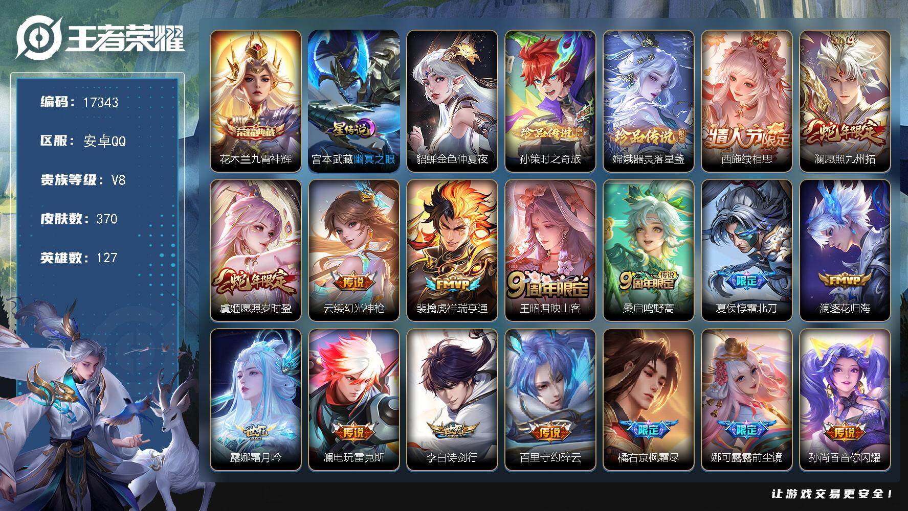PX_2311242-可换绑,5王者印记,五级铭文160,可二次KK6358,安卓Q-V5-65皮肤-2传说-13史诗【传说皮肤】:李白诗剑行,曜李逍遥,【限定皮肤】:白起狰,狄仁杰阴阳师,虞姬凯尔特女王,赵云皇家上将,嬴政白昼王子,庄周高山流水,孙膑妖精王,扁鹊炼金王,吕布猎兽之王,曹操烛龙,狄仁杰万华元夜,达摩沙漠行僧,项羽海滩派对,老夫子醍醐杖,兰陵王金庭之子,孙悟空至尊宝,牛魔御旌,李元芳云中旅人,太乙真人饕餮,鬼谷子原初探秘者,苏烈千军破阵,弈星混沌棋,明世隐疑决卦,裴擒虎李小龙,狂铁御狮,米莱狄御霄,盾山御銮,曜李逍遥,,鲁班大师探海日志,桑启海盐诗旅,沈梦溪龙舞盛年【赛季限定】:孙膑妖精王,扁鹊炼金王,白起狰,曹操烛龙,狄仁杰万华元夜,达摩沙漠行僧,老夫子醍醐杖,兰陵王金庭之子,牛魔御旌,李元芳云中旅人,虞姬凯尔特女王,太乙真人饕餮,鬼谷子原初探秘者,苏烈千军破阵,弈星混沌棋,明世隐疑决卦,狂铁御狮,米莱狄御霄,盾山御銮,鲁班大师探海日志,桑启海盐诗旅【战令限定】:嬴政白昼王子,吕布猎兽之王【史诗皮肤】:赵云皇家上将,廉颇地狱岩魂,孙尚香水果甜心,嬴政摇滚巨星,李白千年之狐,吕布末日机甲,孙悟空至尊宝,小乔缤纷独角兽,李元芳逐浪之夏,嬴政白昼王子,狄仁杰鹰眼统帅,裴擒虎李小龙,庄周高山流水【其他皮肤】:项羽海滩派对,韩信教廷特使,韩信街头霸王,阿轲爱心护理,达摩大发明家,白起白色死神,妲己少女阿狸,典韦黄金武士,甄姬花好人间,宫本武藏万象初新,后羿阿尔法小队,狄仁杰阴阳师,刘备纽约教父,孙膑妖精王,扁鹊炼金王,虞姬凯尔特女王,白起狰,太乙真人饕餮,宫本武藏霸王丸,曹操烛龙,诸葛亮掌控之力,狂铁御狮,米莱狄御霄,吕布猎兽之王,牛魔御旌,盾山御銮,弈星混沌棋,明世隐疑决卦,老夫子醍醐杖,鬼谷子原初探秘者,狄仁杰万华元夜,苏烈千军破阵,达摩沙漠行僧,兰陵王金庭之子,李元芳云中旅人,桑启海盐诗旅,鲁班大师探海日志,沈梦溪龙舞盛年,亚瑟荣光之誓,钟无艳生化警戒,花木兰剑舞者,孙悟空西部大镖客,虞姬加勒比小姐,杨戬埃及法老,百里玄策威尼斯狂欢,公孙离花间舞,裴擒虎街头旋风,元歌午夜歌剧院,上官婉儿修竹墨客,曜归虚梦演