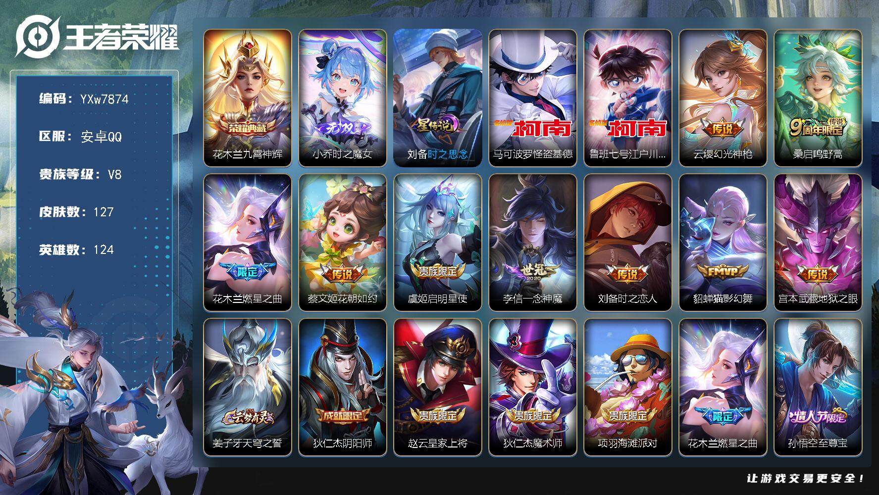 PX_2306087-??价比·九霄神辉·时之魔女·马可怪盗基德·鲁班柯南·燃星之曲·花朝如约·一念神魔·安琪拉乘龙聚宝船·可二次】YXw7874-安卓Q-124英雄-127皮肤-8王者印记-60铭文-贵族积分5w【贵族8】【1典藏·1无双·2珍品·1星传说·9传说·5按键】【因赛季更新游戏段付以上号为准!】 【荣耀典藏】:花木兰九霄神辉 【无双皮肤】:小乔时之魔女 【珍品传说】:马可波罗怪盗基德,鲁班七号江户川柯南 【星元皮肤】:刘备时之思念 【传说皮肤】:云缨幻光神枪,桑启鸣野蒿,花木兰燃星之曲,蔡文姬花朝如约,虞姬启明星使,李信一念神魔,刘备时之恋人,貂蝉猫影幻舞,宫本武藏地狱之眼 【限定皮肤】:姜子牙天穹之誓,狄仁杰阴阳师,赵云皇家上将,狄仁杰魔术师,项羽海滩派对,花木兰燃星之曲,孙悟空至尊宝,孙悟空孙行者,刘备百相守梦,李元芳匿光侦查者,虞姬启明星使,百里玄策原初追逐者,上官婉儿梁祝,上官婉儿神器万象笔,鲁班大师探海日志,阿古朵江河有灵,张良古海寻踪,鬼谷子天穹祈灯,小乔时之魔女,安琪拉乘龙聚宝船,刘邦剑破天穹,周瑜熔金海岸 【年限皮肤】:安琪拉乘龙聚宝船 【赛季限定】:张良古海寻踪,百里玄策原初追逐者,鲁班大师探海日志,鬼谷子天穹祈灯,刘邦剑破天穹,姜子牙天穹之誓 【史诗皮肤】:赵云皇家上将,狄仁杰魔术师,宫本武藏鬼剑武藏,孙尚香水果甜心,妲己魅力维加斯,吕布末日机甲,孙悟空至尊宝,花木兰水晶猎龙者,夏侯惇乘风破浪,小乔缤纷独角兽,兰陵王暗隐猎兽者,亚瑟心灵战警,雅典娜冰冠公主,安琪拉心灵骇客,李元芳逐浪之夏,孙策猫狗日记,狄仁杰鹰眼统帅,上官婉儿梁祝,瑶遇见神鹿,孙尚香时之恋人,百里玄策原初追逐者,孙悟空孙行者,上官婉儿神器万象笔,刘备百相守梦,李元芳匿光侦查者,阿古朵江河有灵,安琪拉乘龙聚宝船,黄忠怒海争锋,少司缘涂山红红,大司命东方月初,亚连破空之剑,马可波罗星界特工,牛魔星界战将,阿轲化蝶舞,公孙离涂山容容 【其他皮肤】:项羽海滩派对,韩信街头霸王,露娜哥特玫瑰,阿轲爱心护理,达摩大发明家,赵云白执事,赵云忍炎影,芈月红桃皇后,扁鹊救世之瞳,宫本武藏未来纪元,姜子牙时尚教父,典韦黄金武士,亚瑟死亡骑士,花木兰兔女郎,张飞五福同心,甄姬花好人间,刘备万事如意,后羿阿尔法小队,狄仁杰阴阳师,关羽龙腾万里,王昭君幻想奇妙夜,狂铁命运角斗场,老夫子功夫老勺,孙尚香沉稳之力,苏烈坚韧之力,孙膑归虚梦演,盾山圆桌骑士,狂铁特工战影,刘禅秘密基地,鲁班大师乓乓大师,鲁班大师探海日志,姬小满零食大作战,李元芳妄想特派,张良古海寻踪,亚连破局者,曹操决胜大满贯,鬼谷子天穹祈灯,刘邦剑破天穹,姜子牙天穹之誓,周瑜熔金海岸,孙悟空神迹守卫,盘古敬我三分,东皇太一噬灭天穹,太乙真人谧流熔炉,西施雪境奇遇,姜子牙星梦巡礼,明世隐景韶洛都,钟馗虚灵犬护,鬼谷子克喵,亚瑟荣光之誓,鲁班七号福禄兄弟,鲁班七号木偶奇遇记,高渐离金属狂潮,项羽帝国元帅,老夫子潮流仙人,狄仁杰锦衣卫,小乔万圣前夜,孙悟空西部大镖客,钟馗地府判官,虞姬加勒比小姐,蔡文姬蔷薇王座,夏侯惇战争骑士,马可波罗激情绿茵,哪吒三太子,诸葛亮星航指挥官,铠龙域领主,百里守约绝影神枪,裴擒虎街头旋风,元歌午夜歌剧院,孙策海之征途,盾山极冰防御线,李信灼热之刃,上官婉儿修竹墨客,嫦娥露花倒影,猪八戒年年有余,曜归虚梦演,镜冰刃幻境,司空震启蛰,金蝉前尘 【内测皮肤】:狂铁特工战影
