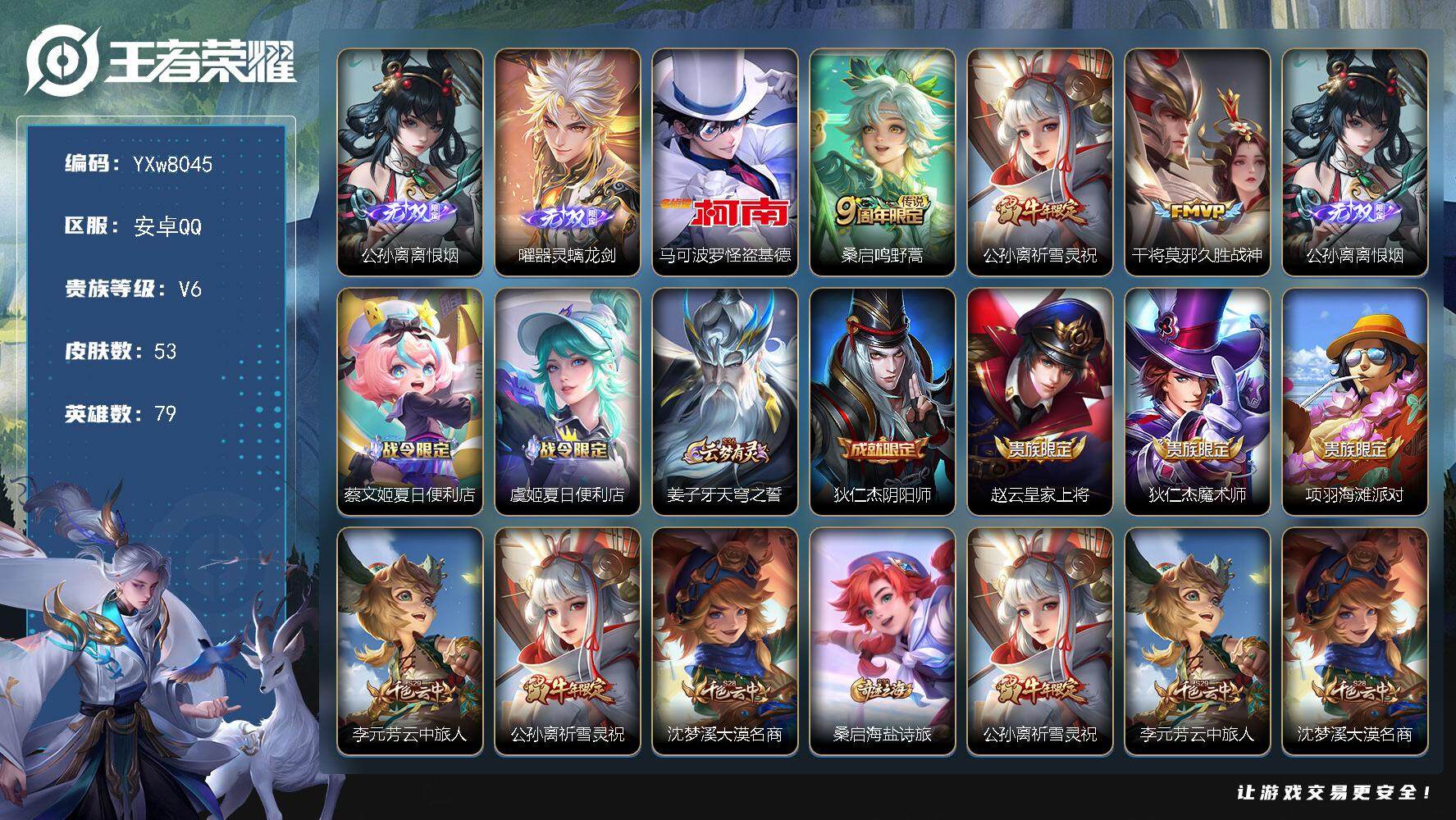 PX_2306091-??小号·离恨烟·器灵螭龙剑·基德·财神纳福天幕·祈雪灵祝·可二次】YXw8045-安卓Q-79英雄-53皮肤-4王者印记-50铭文-贵族积分1w【贵族6】【2无双·1珍品·3传说·1天幕·4按键】【因赛季更新游戏段付以上号为准!】 【无双皮肤】:公孙离离恨烟,曜器灵螭龙剑 【珍品传说】:马可波罗怪盗基德 【天幕】:财神纳福天幕 【传说皮肤】:桑启鸣野蒿,公孙离祈雪灵祝,干将莫邪久胜战神 【限定皮肤】:公孙离离恨烟,蔡文姬夏日便利店,虞姬夏日便利店,姜子牙天穹之誓,狄仁杰阴阳师,赵云皇家上将,狄仁杰魔术师,项羽海滩派对,李元芳云中旅人,公孙离祈雪灵祝,沈梦溪大漠名商,桑启海盐诗旅 【年限皮肤】:公孙离祈雪灵祝 【赛季限定】:李元芳云中旅人,沈梦溪大漠名商,桑启海盐诗旅,姜子牙天穹之誓 【战令限定】:蔡文姬夏日便利店,虞姬夏日便利店 【史诗皮肤】:赵云皇家上将,狄仁杰魔术师,宫本武藏鬼剑武藏,妲己魅力维加斯,妲己女仆咖啡,雅典娜冰冠公主,李元芳逐浪之夏,程咬金功夫厨神,狄仁杰鹰眼统帅,蔡文姬夏日便利店,大司命东方月初,百里守约百相守梦 【其他皮肤】:项羽海滩派对,韩信街头霸王,典韦黄金武士,亚瑟死亡骑士,达摩拳王,狄仁杰阴阳师,诸葛亮掌控之力,哪吒次元突破,米莱狄契约魔法,沈梦溪大漠名商,李元芳云中旅人,桑启海盐诗旅,姜子牙天穹之誓,虞姬夏日便利店,东皇太一噬灭天穹,老夫子百相守梦,干将莫邪雾都夜雨,太乙真人谧流熔炉,明世隐景韶洛都,戈娅玫蓝誓约,刘备浪漫序章,钟馗虚灵犬护,阿古朵布丁狗之约,项羽帝国元帅,孙悟空西部大镖客,兰陵王隐刃,马可波罗激情绿茵,苍维京掠夺者,百里守约绝影神枪,公孙离花间舞,孙策海之征途,李信灼热之刃,阿古朵熊喵少女,澜孤猎,司空震启蛰