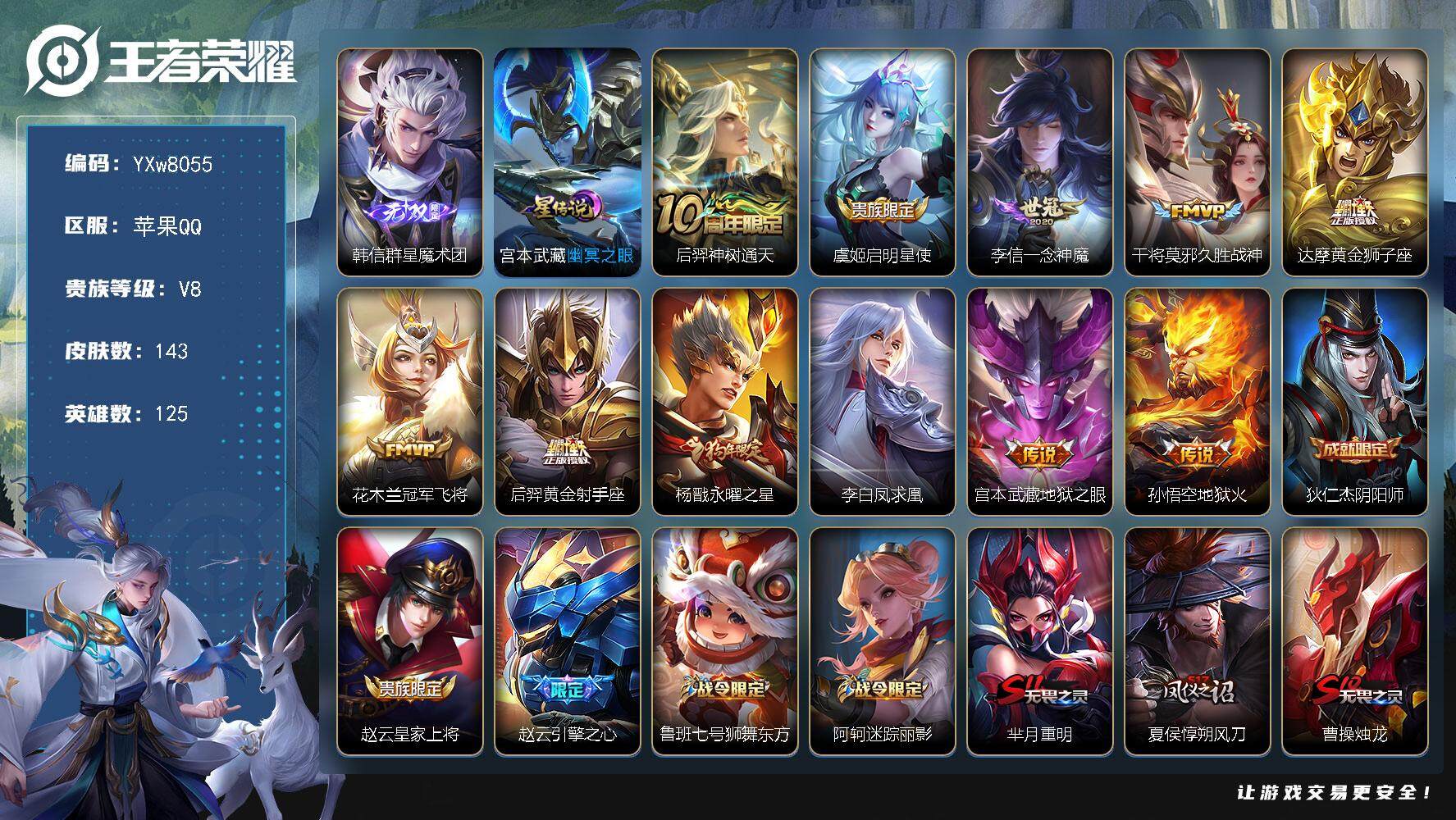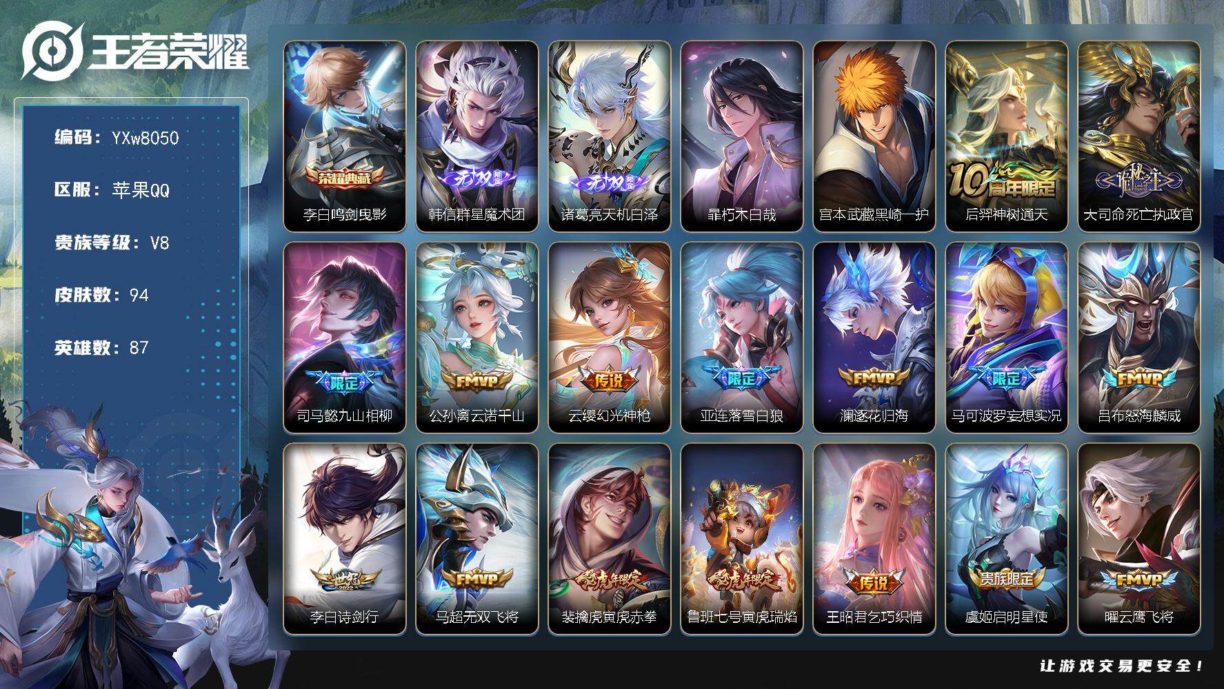 PX_2306093-??质量v8·天机无算天幕·寅虎赤拳·韩信群星魔术团·天机白泽·朽木白哉·黑崎一护·鸣剑曳影·死亡执政官·九山相柳·寅虎瑞焰·诗剑行·永曜之星·可二次】YXw8050-苹果Q-87英雄-94皮肤-2王者印记-30铭文-贵族积分6w【贵族8】【1典藏·2无双·2珍品·21传说·1天幕·19按键】【因赛季更新游戏段付以上号为准!】 【荣耀典藏】:李白鸣剑曳影 【无双皮肤】:韩信群星魔术团,诸葛亮天机白泽 【珍品传说】:暃朽木白哉,宫本武藏黑崎一护 【天幕】:天机无算天幕 【传说皮肤】:后羿神树通天,大司命死亡执政官,司马懿九山相柳,公孙离云诺千山,云缨幻光神枪,亚连落雪白狼,澜逐花归海,马可波罗妄想实况,吕布怒海麟威,李白诗剑行,马超无双飞将,裴擒虎寅虎赤拳,鲁班七号寅虎瑞焰,王昭君乞巧织情,虞姬启明星使,曜云鹰飞将,李信一念神魔,虞姬云霓雀翎,达摩黄金狮子座,杨戬永曜之星,孙尚香末日机甲 【限定皮肤】:狄仁杰阴阳师,赵云皇家上将,墨子降魔,鲁班七号寅虎瑞焰,元歌云间偶戏,马可波罗妄想实况,狄仁杰魔术师,项羽海滩派对,虞姬启明星使,杨戬永曜之星,裴擒虎寅虎赤拳,西施玲珑珍味,亚连落雪白狼,韩信群星魔术团 【年限皮肤】:裴擒虎寅虎赤拳,鲁班七号寅虎瑞焰,杨戬永曜之星 【战令限定】:元歌云间偶戏,西施玲珑珍味 【史诗皮肤】:露娜紫霞仙子,赵云皇家上将,赵云未来纪元,貂蝉圣诞恋歌,狄仁杰魔术师,廉颇地狱岩魂,孙尚香水果甜心,嬴政摇滚巨星,墨子金属风暴,花木兰水晶猎龙者,兰陵王暗隐猎兽者,诸葛亮黄金分割率,雅典娜冰冠公主,铠曙光守护者,李元芳逐浪之夏,伽罗箭羽风息,狄仁杰鹰眼统帅,公孙离无限星赏官,娜可露露晚萤,元歌云间偶戏,夏洛特永昼,艾琳奇遇舞章,墨子降魔,刘禅鸭鸭历险记,狂铁龙之律动,扁鹊灵蛊蚀心,后羿石田雨龙,周瑜百相守梦,云缨赞萌露比,黄忠百相守梦,朵莉亚幻珠鲛人 【其他皮肤】:项羽海滩派对,韩信街头霸王,露娜哥特玫瑰,达摩大发明家,孙膑天使之翼,达摩拳王,花木兰兔女郎,狄仁杰阴阳师,关羽龙腾万里,诸葛亮掌控之力,盘古重装意志,典韦铁甲之心,马可波罗潮玩牛仔,西施玲珑珍味,钟馗虚灵犬护,沈梦溪鸭鸭历险记,露娜命运加冕,雅典娜潮玩士官长,姬小满小满鸭,白起死霸装,甄姬逆浪荇歌,云中君云械蓝图,孙策百相守梦,庄周锦麟游梦,高渐离落日弦歌,莱西奥踏浪烽翎,鬼谷子克喵,艾琳鹤鸣心笺,孙悟空西部大镖客,马可波罗激情绿茵,杨戬埃及法老,公孙离花间舞,元歌午夜歌剧院,沈梦溪棒球奇才,盘古创世神祝,云缨赤焰之缨,暃碧珀绯影