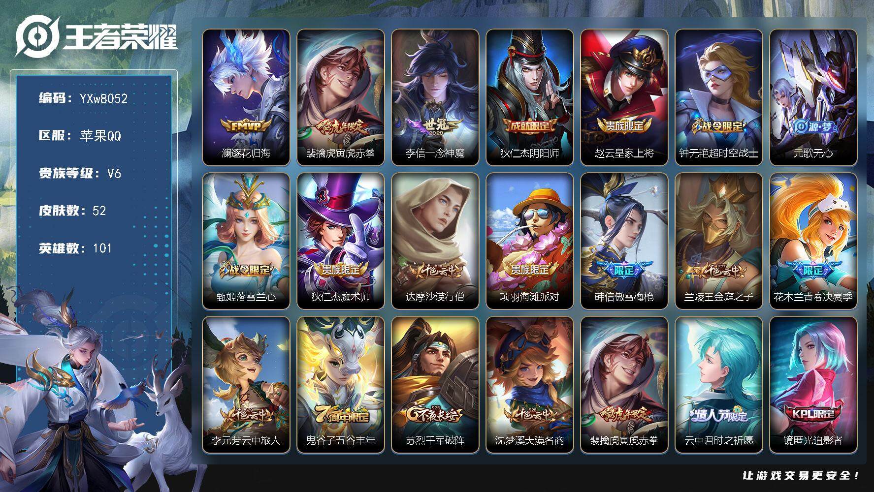 PX_2306094-??质量打野小号·寅虎赤拳·逐花归海·一念神魔·云中君时之祈愿·可二次】YXw8052-苹果Q-101英雄-52皮肤-2王者印记-80铭文-贵族积分1w【贵族6】【·3传说·1天幕】【因赛季更新游戏段付以上号为准!】 【天幕】:共赏芳华天幕 【传说皮肤】:澜逐花归海,裴擒虎寅虎赤拳,李信一念神魔 【限定皮肤】:狄仁杰阴阳师,赵云皇家上将,钟无艳超时空战士,元歌无心,甄姬落雪兰心,狄仁杰魔术师,达摩沙漠行僧,项羽海滩派对,韩信傲雪梅枪,兰陵王金庭之子,花木兰青春决赛季,李元芳云中旅人,鬼谷子五谷丰年,苏烈千军破阵,沈梦溪大漠名商,裴擒虎寅虎赤拳,云中君时之祈愿,镜匿光追影者,桑启海盐诗旅,张良古海寻踪,鬼谷子天穹祈灯 【年限皮肤】:裴擒虎寅虎赤拳 【赛季限定】:达摩沙漠行僧,兰陵王金庭之子,张良古海寻踪,李元芳云中旅人,苏烈千军破阵,沈梦溪大漠名商,桑启海盐诗旅,鬼谷子天穹祈灯 【战令限定】:钟无艳超时空战士,甄姬落雪兰心 【史诗皮肤】:露娜紫霞仙子,赵云皇家上将,狄仁杰魔术师,宫本武藏鬼剑武藏,孙尚香水果甜心,妲己魅力维加斯,墨子金属风暴,花木兰青春决赛季,阿轲节奏热浪,狄仁杰鹰眼统帅,镜匿光追影者,韩信傲雪梅枪,云中君时之祈愿,澜赏金猎手,钟无艳超时空战士,鬼谷子五谷丰年,元歌无心,后羿石田雨龙 【其他皮肤】:项羽海滩派对,露娜哥特玫瑰,达摩大发明家,亚瑟死亡骑士,达摩拳王,狄仁杰阴阳师,刘备汉昭烈帝,关羽龙腾万里,孙尚香沉稳之力,鬼谷子幻乐之宴,小乔丁香结,姜子牙炽热元素使,狂铁特工战影,苏烈千军破阵,达摩沙漠行僧,刘邦虎啸剑宗,兰陵王金庭之子,米莱狄契约魔法,沈梦溪大漠名商,甄姬落雪兰心,李元芳云中旅人,桑启海盐诗旅,姬小满零食大作战,张良古海寻踪,鬼谷子天穹祈灯,甄姬逆浪荇歌,亚瑟荣光之誓,梦奇美梦成真,蒙犽归虚梦演,澜孤猎,桑启画中游 【内测皮肤】:狂铁特工战影
