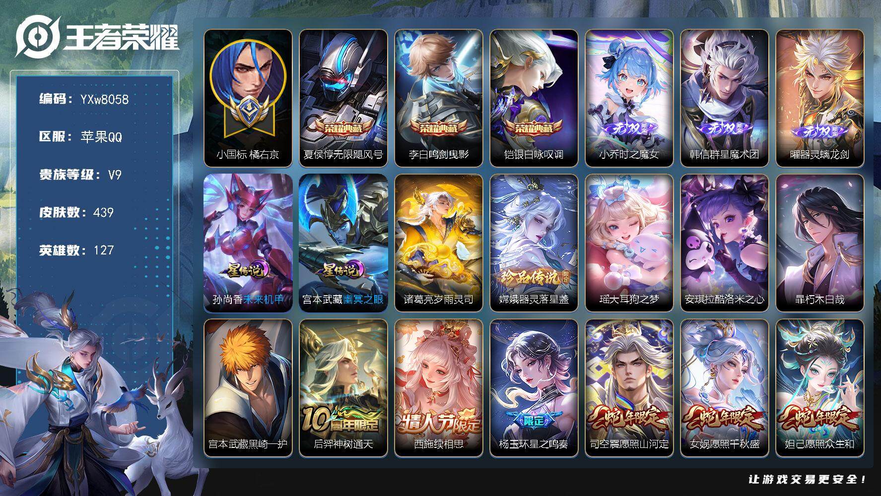PX_2306097-??主推高质量战力号·3典藏3无双5珍品·打野73段·发育路54段·1.1w小国橘右京·1.2w金标娜可露露·1.3w金标裴擒虎·1.1w金标李白·1w金标韩信·1.3w金标镜·1w金标后羿·1.1w金标公孙离·1.1w金标澜·准万战金标女娲·万战金标马可波罗·蛇年全限定·3星传说·可二次】YXw8058-苹果Q-127英雄-439皮肤-28王者印记-220铭文-贵族积分18w【贵族9】【3典藏·3无双·5珍品·3星传说·38传说·30按键】【因赛季更新游戏段付以上号为准!】 【英雄全皮】:嬴政全皮,阿轲全皮,宫本武藏全皮,刘邦全皮,狂铁全皮,猪八戒全皮,蒙恬全皮,阿古朵全皮,戈娅全皮 【荣耀典藏】:夏侯惇无限飓风号,李白鸣剑曳影,铠银白咏叹调 【无双皮肤】:小乔时之魔女,韩信群星魔术团,曜器灵螭龙剑 【珍品传说】:嫦娥器灵落星盏,瑶大耳狗之梦,安琪拉酷洛米之心,暃朽木白哉,宫本武藏黑崎一护 【星元皮肤】:诸葛亮岁雨灵司,孙尚香未来机甲,宫本武藏幽冥之眼 【传说皮肤】:后羿神树通天,西施续相思,杨玉环星之鸣奏,司空震愿照山河定,女娲愿照千秋盛,妲己愿照众生和,澜愿照九州拓,蔡文姬愿照福禄聚,虞姬愿照岁时盈,裴擒虎祥瑞亨通,嬴政玄雷天君,桑启鸣野蒿,亚连落雪白狼,典韦战鼓燎原,马超琥珀纪元,露娜霜月吟,宫本武藏惊梅引,公孙离记忆之芯,夏洛特浮生妄,马超无双飞将,露娜启示之音,裴擒虎寅虎赤拳,王昭君乞巧织情,西施游龙清影,周瑜音你心动,李元芳飞鸢探春,诸葛亮时雨天司,镜炽阳神光,虞姬启明星使,张良黄金白羊座,干将莫邪久胜战神,达摩黄金狮子座,梦奇胖达荣荣,后羿黄金射手座,杨戬永曜之星,孙尚香末日机甲,宫本武藏地狱之眼,武则天海洋之心 【限定皮肤】:白起狰,姜子牙天穹之誓,狄仁杰阴阳师,虞姬凯尔特女王,赵云皇家上将,赵云引擎之心,墨子神迹守卫,嬴政优雅恋人,嬴政白昼王子,孙尚香蔷薇恋人,鲁班七号狮舞东方,庄周蜃楼王,庄周高山流水,高渐离死亡摇滚,阿轲迷踪丽影,钟无艳王者之锤,钟无艳超时空战士,孙膑妖精王,扁鹊炼金王,白起夜都怪侠,芈月重明,芈月幻夜卜梦,吕布猎兽之王,周瑜真爱至上,周瑜赤莲之焰,元歌云间偶戏,元歌无心,夏侯惇朔风刀,甄姬游园惊梦,甄姬落雪兰心,曹操烛龙,典韦穷奇,典韦蓝屏警告,马可波罗暗影游猎,马可波罗山海玄木吟,狄仁杰魔术师,狄仁杰万华元夜,达摩星际陆战队,达摩沙漠行僧,项羽海滩派对,老夫子醍醐杖,老夫子航海奇遇记,关羽冰锋战神,程咬金演武夺筹,露娜启示之音,刘邦夺宝奇兵,韩信逐梦之影,韩信傲雪梅枪,王昭君午后时光,兰陵王驯魔猎人,兰陵王金庭之子,花木兰青春决赛季,亚瑟潮玩骑士王,孙悟空至尊宝,牛魔御旌,后羿辉光之辰,后羿圣弓游侠,李元芳银河之约,李元芳云中旅人,虞姬启明星使,钟馗神迹守卫,钟馗驱傩正仪,杨玉环遇见飞天,杨玉环寅虎心曲,杨戬永曜之星,杨戬潮玩骑兵,女娲朔望之晖,哪吒逐梦之翼,干将莫邪真爱魔法,雅典娜单词大作战,雅典娜黎明之约,蔡文姬繁星吟游,太乙真人饕餮,太乙真人华丽摇滚,鬼谷子原初探秘者,鬼谷子五谷丰年,诸葛亮时雨天司,黄忠火炮绅士,苏烈千军破阵,百里玄策原初追逐者,百里守约朱雀志,弈星混沌棋,梦奇顽趣,公孙离蜜橘之夏,沈梦溪星空之诺,沈梦溪大漠名商,明世隐疑决卦,明世隐吟游魔法,裴擒虎李小龙,裴擒虎寅虎赤拳,裴擒虎擒涛扼浪,狂铁御狮,狂铁电玩高手,米莱狄御霄,米莱狄胡桃异想国,云中君纤云弄巧,盾山御銮,猪八戒西部大镖客,猪八戒猪悟能,上官婉儿梁祝,嫦娥如梦令,嫦娥拒霜思,嫦娥暖冬兔眠,西施玲珑珍味,蒙犽狂想玩偶喵,鲁班大师探海日志,桑启海盐诗旅,夏洛特浮生妄,暃星界游侠,戈娅驭风魔法,艾琳女武神,阿古朵江河有灵,张良古海寻踪,裴擒虎梅西,蒙犽百解令,蒙恬荣光圣徽,高渐离燃音魔法,妲己灵卜魔法,鬼谷子天穹祈灯,马超琥珀纪元,小乔时之魔女,亚连落雪白狼,沈梦溪龙舞盛年,刘邦剑破天穹,韩信群星魔术团,芈月浮光幕影,周瑜熔金海岸 【年限皮肤】:百里守约朱雀志,裴擒虎寅虎赤拳,杨玉环寅虎心曲,杨戬永曜之星,后羿辉光之辰,诸葛亮时雨天司,马可波罗山海玄木吟 【赛季限定】:庄周蜃楼王,孙膑妖精王,扁鹊炼金王,白起狰,芈月重明,夏侯惇朔风刀,曹操烛龙,典韦穷奇,狄仁杰万华元夜,达摩沙漠行僧,老夫子醍醐杖,程咬金演武夺筹,兰陵王金庭之子,张良古海寻踪,牛魔御旌,李元芳云中旅人,虞姬凯尔特女王,钟馗驱傩正仪,雅典娜黎明之约,太乙真人饕餮,鬼谷子原初探秘者,苏烈千军破阵,百里玄策原初追逐者,弈星混沌棋,梦奇顽趣,沈梦溪大漠名商,明世隐疑决卦,裴擒虎擒涛扼浪,狂铁御狮,米莱狄御霄,盾山御銮,鲁班大师探海日志,桑启海盐诗旅,鬼谷子天穹祈灯,蒙恬荣光圣徽,刘邦剑破天穹,姜子牙天穹之誓 【战令限定】:墨子神迹守卫,嬴政白昼王子,鲁班七号狮舞东方,阿轲迷踪丽影,钟无艳超时空战士,白起夜都怪侠,芈月幻夜卜梦,吕布猎兽之王,周瑜赤莲之焰,元歌云间偶戏,甄姬落雪兰心,典韦蓝屏警告,马可波罗暗影游猎,达摩星际陆战队,老夫子航海奇遇记,刘邦夺宝奇兵,王昭君午后时光,兰陵王驯魔猎人,亚瑟潮玩骑士王,后羿圣弓游侠,李元芳银河之约,钟馗神迹守卫,杨戬潮玩骑兵,女娲朔望之晖,干将莫邪真爱魔法,雅典娜单词大作战,黄忠火炮绅士,沈梦溪星空之诺,明世隐吟游魔法,狂铁电玩高手,米莱狄胡桃异想国,猪八戒西部大镖客,嫦娥暖冬兔