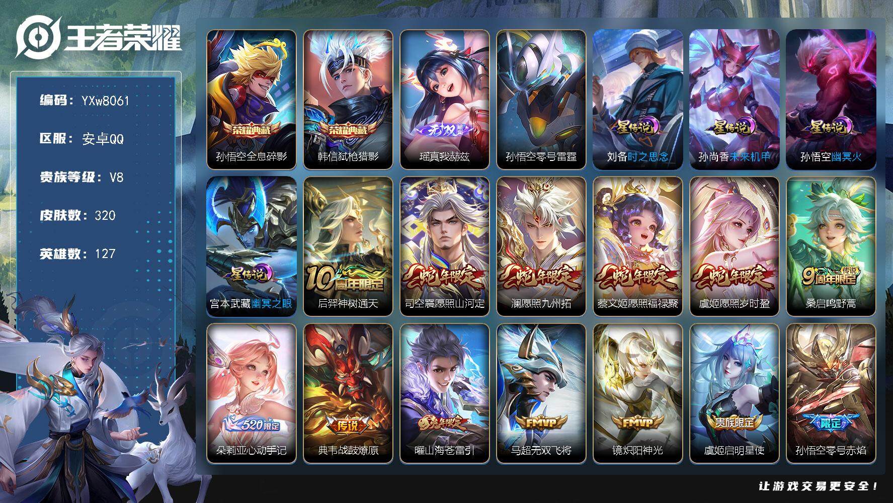 PX_2306099-??推荐·金标达摩·金标暃·弑枪猎影·全息碎影·瑶真我赫兹·愿照山河定·愿照九州拓·愿照福禄聚·愿照岁时盈·朵莉亚心动手记·山海苍雷引·一念神魔·山海碧波行·山海玄木吟·飞衡·可二次】YXw8061-安卓Q-127英雄-320皮肤-21王者印记-300铭文-贵族积分6w【贵族8】【2典藏·1无双·5星传说·22传说·1天幕·14按键】【因赛季更新游戏段付以上号为准!】 【英雄全皮】:达摩全皮,孙权全皮,鬼谷子全皮,蒙恬全皮,戈娅全皮,空空儿全皮,影全皮,少司缘全皮 【荣耀典藏】:孙悟空全息碎影,韩信弑枪猎影 【无双皮肤】:瑶真我赫兹 【星元皮肤】:刘备时之思念,孙悟空零号雷霆,孙尚香未来机甲,孙悟空幽冥火,宫本武藏幽冥之眼 【天幕】:共赏芳华天幕 【传说皮肤】:后羿神树通天,司空震愿照山河定,澜愿照九州拓,蔡文姬愿照福禄聚,虞姬愿照岁时盈,桑启鸣野蒿,朵莉亚心动手记,典韦战鼓燎原,曜山海苍雷引,马超无双飞将,镜炽阳神光,虞姬启明星使,孙悟空零号赤焰,李信一念神魔,刘备时之恋人,张良黄金白羊座,干将莫邪久胜战神,达摩黄金狮子座,梦奇胖达荣荣,孙尚香末日机甲,宫本武藏地狱之眼,孙悟空地狱火 【限定皮肤】:暃埋骨钱,蒙犽顽岩魄,蔡文姬夏日便利店,大乔绒语心约,虞姬夏日便利店,姜子牙天穹之誓,杨戬破阵退雄兵,狄仁杰阴阳师,赵云皇家上将,庄周高山流水,高渐离死亡摇滚,高渐离玩趣恶龙,扁鹊奇幻香踪,周瑜赤莲之焰,元歌无心,夏侯惇朔风刀,马可波罗暗影游猎,马可波罗山海玄木吟,狄仁杰魔术师,狄仁杰万华元夜,达摩星际陆战队,达摩沙漠行僧,项羽海滩派对,老夫子醍醐杖,韩信飞衡,兰陵王驯魔猎人,兰陵王金庭之子,亚瑟潮玩骑士王,孙悟空至尊宝,孙悟空零号赤焰,牛魔御旌,李元芳云中旅人,虞姬启明星使,杨戬潮玩骑兵,雅典娜单词大作战,雅典娜黎明之约,蔡文姬繁星吟游,太乙真人华丽摇滚,鬼谷子原初探秘者,鬼谷子五谷丰年,苏烈千军破阵,百里玄策原初追逐者,弈星混沌棋,梦奇顽趣,沈梦溪大漠名商,明世隐疑决卦,裴擒虎李小龙,裴擒虎擒涛扼浪,瑶山海碧波行,云中君纤云弄巧,盾山御銮,上官婉儿梁祝,嫦娥暖冬兔眠,曜山海苍雷引,西施玲珑珍味,蒙犽狂想玩偶喵,鲁班大师探海日志,桑启海盐诗旅,暃星界游侠,戈娅驭风魔法,艾琳女武神,阿古朵江河有灵,张良古海寻踪,蒙犽百解令,蒙恬荣光圣徽,高渐离燃音魔法,妲己灵卜魔法,鬼谷子天穹祈灯,姬小满妄想食味,沈梦溪龙舞盛年,刘邦剑破天穹,程咬金群星魔术团,朵莉亚心动手记,周瑜熔金海岸 【年限皮肤】:韩信飞衡,瑶山海碧波行,马可波罗山海玄木吟,曜山海苍雷引 【赛季限定】:夏侯惇朔风刀,狄仁杰万华元夜,达摩沙漠行僧,老夫子醍醐杖,兰陵王金庭之子,张良古海寻踪,牛魔御旌,李元芳云中旅人,雅典娜黎明之约,鬼谷子原初探秘者,苏烈千军破阵,百里玄策原初追逐者,弈星混沌棋,梦奇顽趣,沈梦溪大漠名商,明世隐疑决卦,裴擒虎擒涛扼浪,盾山御銮,鲁班大师探海日志,桑启海盐诗旅,鬼谷子天穹祈灯,蒙恬荣光圣徽,刘邦剑破天穹,姜子牙天穹之誓 【战令限定】:蔡文姬夏日便利店,虞姬夏日便利店,扁鹊奇幻香踪,周瑜赤莲之焰,马可波罗暗影游猎,达摩星际陆战队,兰陵王驯魔猎人,亚瑟潮玩骑士王,杨戬潮玩骑兵,雅典娜单词大作战,嫦娥暖冬兔眠,西施玲珑珍味,蒙犽狂想玩偶喵,暃星界游侠,戈娅驭风魔法,高渐离燃音魔法,妲己灵卜魔法 【史诗皮肤】:鲁班七号电玩小子,露娜紫霞仙子,阿轲暗夜猫娘,赵云皇家上将,赵云未来纪元,貂蝉圣诞恋歌,甄姬冰雪圆舞曲,狄仁杰魔术师,廉颇地狱岩魂,宫本武藏鬼剑武藏,孙尚香水果甜心,嬴政暗夜贵公子,嬴政摇滚巨星,妲己魅力维加斯,妲己女仆咖啡,墨子龙骑士,墨子金属风暴,吕布圣诞狂欢,刘禅绅士熊喵,曹操幽灵船长,李白千年之狐,吕布末日机甲,张飞乱世虎臣,孙悟空至尊宝,花木兰水晶猎龙者,刘邦德古拉伯爵,夏侯惇乘风破浪,小乔缤纷独角兽,兰陵王暗隐猎兽者,诸葛亮黄金分割率,雅典娜冰冠公主,安琪拉心灵骇客,百里守约特工魅影,铠曙光守护者,李元芳逐浪之夏,程咬金功夫厨神,白起星夜王子,阿轲节奏热浪,孙策猫狗日记,大乔猫狗日记,狄仁杰鹰眼统帅,公孙离无限星赏官,兰陵王驯魔猎人,上官婉儿梁祝,蔡文姬繁星吟游,娜可露露晚萤,韩信飞衡,不知火舞魅语,橘右京修罗,孙尚香时之恋人,马可波罗暗影游猎,蒙犽狂想玩偶喵,百里玄策原初追逐者,裴擒虎李小龙,云中君纤云弄巧,百里玄策热力回旋,沈梦溪月团寄思,庄周高山流水,雅典娜黎明之约,澜赏金猎手,鬼谷子五谷丰年,元歌无心,梦奇顽趣,暃星界游侠,马可波罗山海玄木吟,瑶山海碧波行,扁鹊奇幻香踪,刘禅电玩爆裂旋风,戈娅驭风魔法,阿古朵江河有灵,蒙犽百解令,周瑜雪夜绮愿,妲己灵卜魔法,高渐离燃音魔法,蒙恬荣光圣徽,姬小满妄想食味,蔡文姬夏日便利店,蒙犽顽岩魄,暃埋骨钱,少司缘涂山红红,大司命东方月初,姬小满战舞者,牛魔星界战将,孙膑茶境仙,赵怀真器灵浮梦炉,狂铁龙之律动,扁鹊灵蛊蚀心,后羿石田雨龙,黄忠百相守梦,西施织梦人,公孙离涂山容容,莱西奥光弋星穹,兰陵王傩神司,女娲万灵启世,少司缘巫礼祀神 【其他皮肤】:项羽海滩派对,韩信教廷特使,韩信街头霸王,露娜哥特玫瑰,阿轲爱心护理,达摩大发明家,赵云白执事,赵云忍炎影,艾琳女武神,程咬金星际陆战队,白起白色死神,牛魔西部大镖客