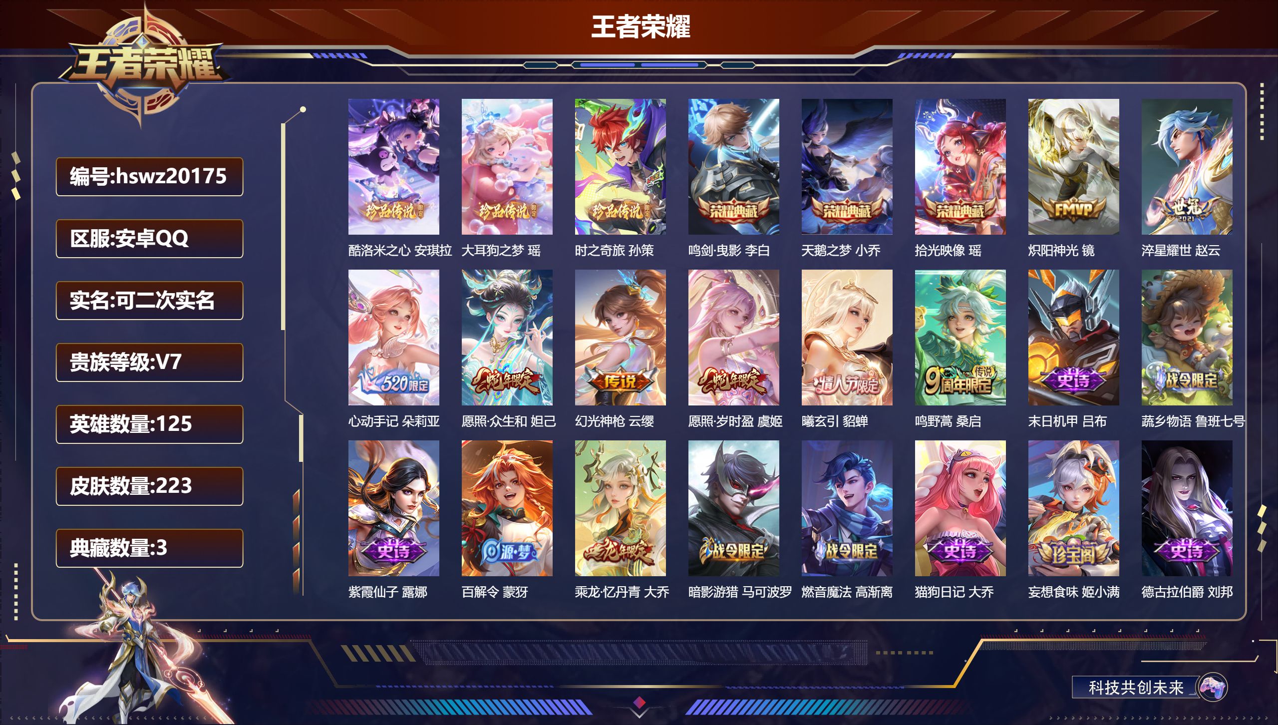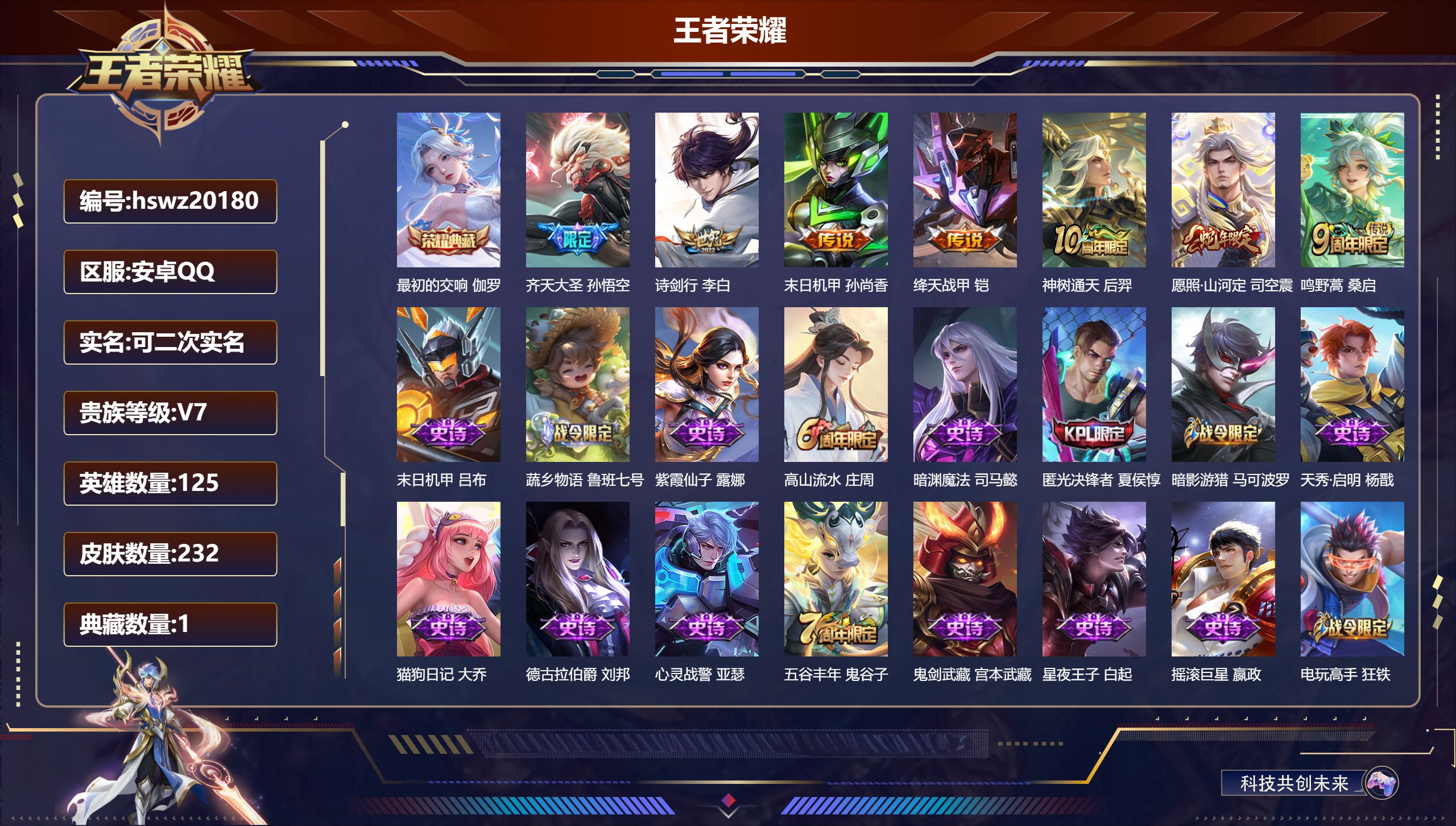 PX_2312104-Q/荣耀王者/232皮肤/125英雄/1典藏/0珍品无双/0无双/0珍品传说/7传说/85史诗/7稀有英雄 【1,典藏皮肤】最初的交响,伽罗, 【7,传说皮肤】齐天大圣,孙悟空,诗剑行,李白,末日机甲,孙尚香,绛天战甲,铠,神树通天,后羿,愿照·山河定,司空震,鸣野蒿,桑启, 【85,史诗皮肤】末日机甲,吕布,蔬乡物语,鲁班七号,紫霞仙子,露娜,高山流水,庄周,暗渊魔法,司马懿,匿光决锋者,夏侯惇,暗影游猎,马可波罗,天秀·启明,杨戬,猫狗日记,大乔,德古拉伯爵,刘邦,心灵战警,亚瑟,五谷丰年,鬼谷子,鬼剑武藏,宫本武藏,星夜王子,白起,摇滚巨星,嬴政,电玩高手,狂铁,顽趣,梦奇,拒霜思,嫦娥,魅力维加斯,妲己,黄金分割率,诸葛亮,偶像歌手,王昭君,荣光圣徽,蒙恬,女仆咖啡,妲己,赏金猎手,澜,星界游侠,暃,晚萤,娜可露露,猪悟能,猪八戒,暗夜贵公子,嬴政,鹰眼统帅,狄仁杰,李小龙,裴擒虎,光弋星穹,莱西奥,金属风暴,墨子,傲雪梅枪,韩信,特工魅影,百里守约,猫狗日记,孙策,原初追逐者,百里玄策,逐浪之夏,李元芳,奇幻香踪,扁鹊,未来纪元,赵云,黎明之约,雅典娜,石田雨龙,后羿,鸭鸭历险记,刘禅,驭风魔法,戈娅,魔术师,狄仁杰,顽岩魄,蒙犽,皇家上将,赵云,功夫厨神,程咬金,梁祝,上官婉儿,电玩·爆裂旋风,刘禅,天才门将,刘禅,圣诞恋歌,貂蝉,水晶猎龙者,花木兰,涂山容容,公孙离,破空之剑,亚连,圣诞狂欢,吕布,魅语,不知火舞,夏日便利店,蔡文姬,星界战将,牛魔,地狱岩魂,廉颇,茶境仙,孙膑,蔷薇恋人,孙尚香,冰雪圆舞曲,甄姬,火炮绅士,黄忠,月团寄思,沈梦溪,千年之狐,李白,节奏热浪,阿轲,曙光守护者,铠,万灵启世,女娲,青龙志,铠,心灵骇客,安琪拉,鹤归松栖,赵怀真,箭羽风息,伽罗,乱世虎臣,张飞,吟游魔法,明世隐,万物之道,弈星,绅士熊喵,刘禅,缤纷独角兽,小乔,陌上桑,艾琳,真爱魔法,干将莫邪,水果甜心,孙尚香,狂想玩偶喵,蒙犽,江河有灵,阿古朵,幽灵船长,曹操,乘风破浪,夏侯惇,暗隐猎兽者,兰陵王, 【106,勇者皮肤】时空谍影,海诺,玲珑珍味,西施,圆桌骑士,盾山,沙漠行僧,达摩,大漠名商,沈梦溪,缤纷绘卷,张良,纽约教父,刘备,拳王,达摩,龙舞盛年,沈梦溪,丁香结,小乔,功夫炙烤,廉颇,沉稳之力,孙尚香,幻夜卜梦,芈月,海盐诗旅,桑启,幻泉雾影,海月,汉昭烈帝,刘备,白色死神,白起,黄金武士,典韦,阴阳师,狄仁杰,径山谋武,孙权,次元突破,哪吒,古海寻踪,张良,功夫老勺,老夫子,鲨炮海盗猫,沈梦溪,海滩派对,项羽,万华元夜,狄仁杰,踏浪烽翎,莱西奥,演武夺筹,程咬金,西部游侠,莱西奥,哥特玫瑰,露娜,无双福将,程咬金,原初探秘者,鬼谷子,星空之诺,沈梦溪,潮玩探月行,猪八戒,天穹祈灯,鬼谷子,决胜大满贯,曹操,化身博士,扁鹊,夜都怪侠,白起,幻乐之宴,鬼谷子,霸王丸,宫本武藏,虹云星官,明世隐,潮玩骑兵,杨戬,赤莲之焰,周瑜,死亡骑士,亚瑟,敏锐之力,李白,玩偶对对碰,安琪拉,掌控之力,诸葛亮,海滩丽影,钟无艳,圣弓游侠,后羿,忍·炎影,赵云,唤灵魔甲,刘禅,万事如意,刘备,擒涛扼浪,裴擒虎,乓乓大师,鲁班大师,死亡摇滚,高渐离,探海日志,鲁班大师,天使之翼,孙膑,兔女郎,花木兰,龙腾万里,关羽,流音漫舞,艾琳,金庭之子,兰陵王,罗小黑战记,哪吒,千军破阵,苏烈,往忆晖光,明世隐,零食大作战,姬小满,荣光之誓,亚瑟,花好人间,甄姬,万象初新,宫本武藏,秘密基地,刘禅,教廷特使,韩信,街头霸王,韩信,云中旅人,李元芳,妄想特派,李元芳,西部大镖客,孙悟空,少女阿狸,妲己,蔚蓝守将,蒙恬,春野闲踪,苏烈,契约魔法,米莱狄,布丁狗之约,阿古朵,暖冬·兔眠,嫦娥,命运加冕,露娜,午后时光,王昭君,小满鸭,姬小满,幻想奇妙夜,王昭君,灵野札记,张良,驱傩正仪,钟馗,潮玩士官长,雅典娜,鸭鸭历险记,沈梦溪,命运角斗场,狂铁,死霸装,白起,特工战影,狂铁,虚灵犬护,钟馗,白执事,赵云,劲辣红锅,太乙真人,神迹守卫,孙悟空,苍林狼骑,苍,天穹之誓,姜子牙,访茗客,马超,星梦巡礼,姜子牙,谧流熔炉,太乙真人,暗都幽影,大司命,夏日便利店,虞姬,鹤鸣心笺,艾琳,逆浪荇歌,甄姬,噬灭天穹,东皇太一,敬我三分,盘古, 【32,其他皮肤】金属狂潮,高渐离,圣殿之光,刘邦,芝加哥教父,黄忠,龙域领主,铠,生化警戒,钟无艳,超能战警,曹操,爱与和平,苏烈,第七人偶,干将莫邪,万圣前夜,小乔,灼热之刃,李信,碧珀绯影,暃,魇语军师,司马懿,英喵野望,刘禅,午夜歌剧院,元歌,启蛰,司空震,花间舞,公孙离,街头旋风,裴擒虎,东海龙王,东皇太一,修竹墨客,上官婉儿,维京掠夺者,苍,归虚梦演,蒙犽,激情绿茵,马可波罗,画中游,桑启,尼罗河女神,女娲,归虚梦演,曜,幸存者,马超,特种部队,李元芳,绝影神枪,百里守约,孤猎,澜,秩序猎龙将,蒙恬,赤焰之缨,云缨,西部大镖客,孙悟空, 【7,稀有英雄】不知火舞,橘右京,夏洛特,娜可露露,韩信,艾琳,赵云, 营地ID:,