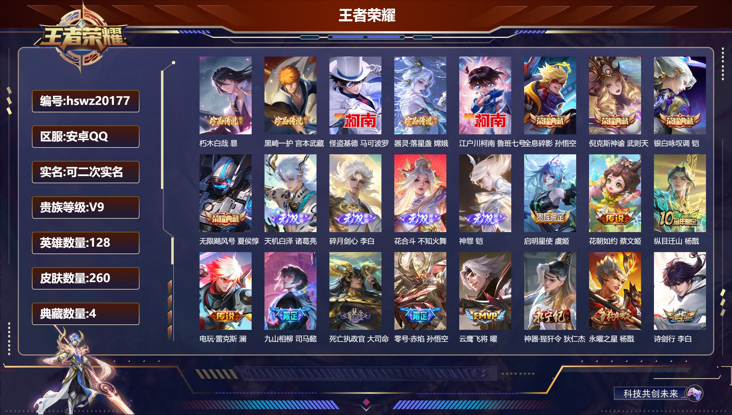 PX_2312084-Q/至尊星耀/260皮肤/128英雄/4典藏/0珍品无双/4无双/5珍品传说/39传说/76史诗/10稀有英雄 【5,珍品传说】朽木白哉,暃,黑崎一护,宫本武藏,怪盗基德,马可波罗,器灵·落星盏,嫦娥,江户川柯南,鲁班七号, 【4,典藏皮肤】全息碎影,孙悟空,倪克斯神谕,武则天,银白咏叹调,铠,无限飓风号,夏侯惇, 【4,无双皮肤】天机白泽,诸葛亮,碎月剑心,李白,花合斗,不知火舞,神罪,铠, 【39,传说皮肤】启明星使,虞姬,花朝如约,蔡文姬,纵目迁山,杨戬,电玩·雷克斯,澜,九山相柳,司马懿,死亡执政官,大司命,零号·赤焰,孙悟空,云鹰飞将,曜,神器·狴犴令,狄仁杰,永曜之星,杨戬,诗剑行,李白,燃星之曲,花木兰,仲夏夜之梦,貂蝉,惊梅引,宫本武藏,记忆之芯,公孙离,地狱之眼,宫本武藏,海洋之心,武则天,炽阳神光,镜,遇见神鼓,吕布,曦玄引,吕布,霜月吟,露娜,乘龙·问璇玑,孙尚香,末日机甲,孙尚香,一念神魔,李信,音你心动,小乔,画中仙,干将莫邪,炽翼辉光,伽罗,乘龙·铭钟鼎,赵云,绛天战甲,铠,霜北刀,夏侯惇,黄金白羊座,张良,千山共赴,干将莫邪,金乌负日,海月,群星魔术团,云中君,万灵伏威,曹操,诡秘之主,元歌,神树通天,后羿,祥瑞亨通,裴擒虎,愿照·千秋盛,女娲, 【76,史诗皮肤】蔬乡物语,鲁班七号,高山流水,庄周,唐三藏,金蝉,暗渊魔法,司马懿,燃音魔法,高渐离,妄想食味,姬小满,德古拉伯爵,刘邦,山海·玄木吟,马可波罗,心灵战警,亚瑟,无心,元歌,巫礼祀神,少司缘,鬼剑武藏,宫本武藏,幻珠鲛人,朵莉亚,星夜王子,白起,守夜人,弈星,地狱燃心,司空震,摇滚巨星,嬴政,修罗,橘右京,拒霜思,嫦娥,魅力维加斯,妲己,赞萌露比,云缨,乐园奇幻夜,钟馗,苍鳞隐世,白起,偶像歌手,王昭君,晚萤,娜可露露,繁星吟游,蔡文姬,鹰眼统帅,狄仁杰,胡桃异想国,米莱狄,白晶晶,芈月,傩神司,兰陵王,光弋星穹,莱西奥,龙骑士,墨子,金属风暴,墨子,傲雪梅枪,韩信,特工魅影,百里守约,逐浪之夏,李元芳,未来纪元,赵云,石田雨龙,后羿,驭风魔法,戈娅,魔术师,狄仁杰,热力回旋,百里玄策,龙之律动,狂铁,皇家上将,赵云,冰冠公主,雅典娜,涂山红红,少司缘,功夫厨神,程咬金,东方月初,大司命,天才门将,刘禅,圣诞恋歌,貂蝉,水晶猎龙者,花木兰,涂山容容,公孙离,决胜骁骑,关羽,心动手记,海诺,怒海争锋,黄忠,圣诞狂欢,吕布,青焰无极,镜,群星魔术团,上官婉儿,夜落电台,明世隐,器灵·浮梦炉,赵怀真,浮光幕影,芈月,夏日便利店,蔡文姬,岱宗,典韦,永昼,夏洛特,冰雪圆舞曲,甄姬,雪上飞焰,哪吒,暗夜猫娘,阿轲,织梦人,西施,梦圆繁星,盾山,箭羽风息,伽罗,百相守梦,周瑜,魔法小厨娘,安琪拉,水果甜心,孙尚香,江河有灵,阿古朵,幽灵船长,曹操,乘风破浪,夏侯惇,暗隐猎兽者,兰陵王, 【94,勇者皮肤】圆桌骑士,盾山,沙漠行僧,达摩,大漠名商,沈梦溪,纽约教父,刘备,拳王,达摩,大发明家,达摩,丁香结,小乔,功夫炙烤,廉颇,海盐诗旅,桑启,朔风刀,夏侯惇,醍醐杖,老夫子,汉昭烈帝,刘备,白色死神,白起,黄金武士,典韦,王牌新星,海月,阴阳师,狄仁杰,径山谋武,孙权,古海寻踪,张良,西部大镖客,牛魔,海滩派对,项羽,万华元夜,狄仁杰,克喵,鬼谷子,制霸全明星,牛魔,踏浪烽翎,莱西奥,演武夺筹,程咬金,野性能量,吕布,守护之力,大乔,无双福将,程咬金,原初探秘者,鬼谷子,潮玩探月行,猪八戒,鸿运当头,亚瑟,天穹祈灯,鬼谷子,疑决卦,明世隐,化身博士,扁鹊,阿尔法小队,后羿,五福同心,张飞,金色潮汐,朵莉亚,霸王丸,宫本武藏,虹云星官,明世隐,死亡骑士,亚瑟,敏锐之力,李白,破局者,亚连,玩偶对对碰,安琪拉,掌控之力,诸葛亮,忍·炎影,赵云,雪境奇遇,西施,炽热元素使,姜子牙,万事如意,刘备,逐霄战戟,吕布,擒涛扼浪,裴擒虎,乓乓大师,鲁班大师,探海日志,鲁班大师,雾都夜雨,干将莫邪,兔女郎,花木兰,龙腾万里,关羽,流音漫舞,艾琳,金庭之子,兰陵王,未来纪元,宫本武藏,罗小黑战记,哪吒,往忆晖光,明世隐,花好人间,甄姬,万象初新,宫本武藏,聚星闪耀,钟无艳,御銮,盾山,春野之旅,钟无艳,云中旅人,李元芳,西部大镖客,孙悟空,蔬乡物语,李元芳,灵卜魔法,妲己,混沌棋,弈星,蔚蓝守将,蒙恬,幻想奇妙夜,王昭君,驱傩正仪,钟馗,死霸装,白起,特工战影,狂铁,虚灵犬护,钟馗,罗小黑战记,张良,剑破天穹,刘邦,青衿临川,桑启,苍威无极,项羽,熔金海岸,周瑜,天穹之誓,姜子牙,魅影绮裳,影,星梦巡礼,姜子牙,谧流熔炉,太乙真人,金福满堂,东皇太一,群星魔术团,程咬金,暗都幽影,大司命,夏日便利店,虞姬,鹤鸣心笺,艾琳,逆浪荇歌,甄姬,百相守梦,孙策,灵卦秘语,少司缘,爆裂喵拳,达摩, 【45,其他皮肤】伊势巫女,大乔,金属狂潮,高渐离,前尘,金蝉,战争骑士,夏侯惇,芝加哥教父,黄忠,极冰防御线,盾山,超能战警,曹操,花见巫女,伽罗,幻珠鲛人,朵莉亚,灼热之刃,李信,海之征途,孙策,火炮千金,孙尚香,福禄兄弟,鲁班七号,精灵王,后羿,冰刃幻境,镜,魇语军师,司马懿,英喵野望,刘禅,午夜歌剧院,元歌,启蛰,司空震,隐刃,兰陵王,花间舞,公孙离,异域舞娘,貂蝉,街头旋风,裴擒虎,修竹墨客,上官婉儿,剑舞者,花木兰,范海辛,李白,归虚梦演,蒙犽,激情绿茵,马可波罗,埃及法老,杨戬,阿摩司公爵,鬼谷子,画中游,桑启,锦衣卫,狄仁杰,归虚梦演,曜,决胜骁骑,关羽,特种部队,李元芳,绝影神枪,百里守约,孤猎,澜,精灵公主,王昭君,赤焰之缨,云缨,怪盗基德,马可波罗,西部大镖客,孙悟空,朽木白哉,暃,黑崎一护,宫本武藏,器灵·落星盏,嫦娥,江