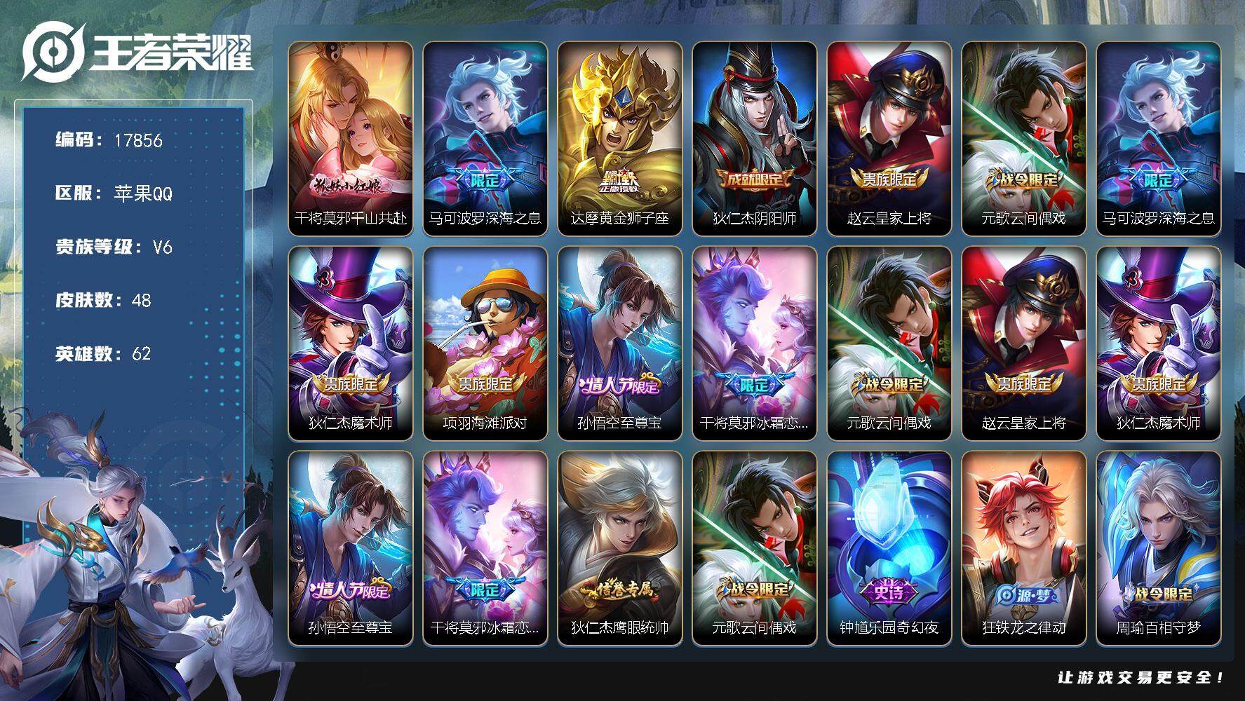 PX_2306074-可换绑,2王者印记,没有五级铭文,可二次CD15138,苹果Q-V6-48皮肤-3传说-11史诗【英雄全皮】:孙权全皮【传说皮肤】:干将莫邪千山共赴,马可波罗深海之息,达摩黄金狮子座【限定皮肤】:狄仁杰阴阳师,赵云皇家上将,元歌云间偶戏,马可波罗深海之息,狄仁杰魔术师,项羽海滩派对,孙悟空至尊宝,干将莫邪冰霜恋舞曲【战令限定】:元歌云间偶戏【史诗皮肤】:赵云皇家上将,狄仁杰魔术师,孙悟空至尊宝,干将莫邪冰霜恋舞曲,狄仁杰鹰眼统帅,元歌云间偶戏,钟馗乐园奇幻夜,狂铁龙之律动,周瑜百相守梦,莱西奥光弋星穹,女娲万灵启世【其他皮肤】:项羽海滩派对,韩信街头霸王,达摩大发明家,姜子牙时尚教父,达摩拳王,张飞五福同心,后羿阿尔法小队,狄仁杰阴阳师,刘备纽约教父,关羽龙腾万里,狂铁命运角斗场,孙尚香沉稳之力,苏烈坚韧之力,吕布野性能量,盘古重装意志,甄姬逆浪荇歌,孙策百相守梦,亚瑟荣光之誓,明世隐往忆晖光,孙权径山谋武,艾琳鹤鸣心笺,曹操逐霄之志,张良一千零一夜,钟馗地府判官,关羽天启骑士,夏侯惇战争骑士,马可波罗激情绿茵,鬼谷子阿摩司公爵,百里守约绝影神枪,苏烈爱与和平,李信灼热之刃,盘古创世神祝,蒙恬秩序猎龙将,司空震启蛰