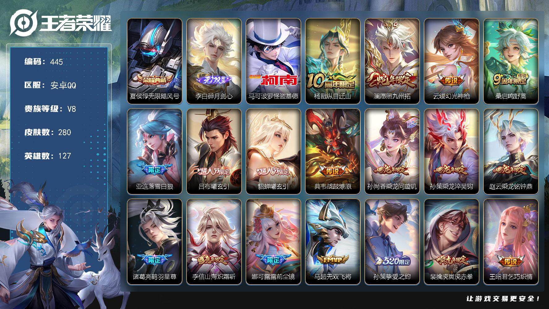 PX_2306076-Q-V8-最强王者段位对抗路25段,打野25段2星元星际治安官,未来机甲,-127英雄-280皮肤-1典藏皮肤-1无双-1珍品传说-24传说-79史诗 【英雄全皮】:蒙恬全皮,赵怀真全皮,影全皮,海诺全皮 【荣耀典藏】:夏侯惇无限飓风号 【无双皮肤】:李白碎月剑心 【珍品传说】:马可波罗怪盗基德 【传说皮肤】:杨戬纵目迁山,澜愿照九州拓,云缨幻光神枪,桑启鸣野蒿,亚连落雪白狼,吕布曦玄引,貂蝉曦玄引,典韦战鼓燎原,孙尚香乘龙问璇玑,孙策乘龙淬吴钩,赵云乘龙铭钟鼎,诸葛亮鹤羽星尊,李信山海炽霜斩,娜可露露前尘镜,马超无双飞将,孙策挚爱之约,裴擒虎寅虎赤拳,王昭君乞巧织情,诸葛亮时雨天司,镜炽阳神光,虞姬启明星使,梦奇胖达荣荣,孙尚香末日机甲,孙悟空地狱火 【限定皮肤】:暃埋骨钱,姜子牙天穹之誓,杨戬破阵退雄兵,李白谪仙醉月,狄仁杰阴阳师,赵云皇家上将,赵云引擎之心,孙尚香蔷薇恋人,钟无艳超时空战士,扁鹊奇幻香踪,元歌无心,甄姬落雪兰心,马可波罗山海玄木吟,狄仁杰魔术师,狄仁杰万华元夜,达摩沙漠行僧,项羽海滩派对,关羽百相守梦,王昭君午后时光,兰陵王金庭之子,娜可露露前尘镜,后羿辉光之辰,后羿如梦令,刘备百相守梦,李元芳银河之约,李元芳云中旅人,虞姬启明星使,钟馗驱傩正仪,杨戬潮玩骑兵,干将莫邪冰霜恋舞曲,雅典娜黎明之约,鬼谷子五谷丰年,诸葛亮时雨天司,诸葛亮鹤羽星尊,苏烈千军破阵,百里守约朱雀志,梦奇顽趣,沈梦溪大漠名商,沈梦溪匿光破解者,裴擒虎寅虎赤拳,裴擒虎擒涛扼浪,狂铁电玩高手,云中君纤云弄巧,云中君时之祈愿,李信山海炽霜斩,孙策挚爱之约,猪八戒猪悟能,嫦娥拒霜思,嫦娥暖冬兔眠,鲁班大师探海日志,桑启海盐诗旅,暃星界游侠,赵怀真鹤归松栖,张良古海寻踪,蒙犽百解令,蒙恬荣光圣徽,高渐离燃音魔法,妲己灵卜魔法,鬼谷子天穹祈灯,李白碎月剑心,大乔乘龙忆丹青,安琪拉乘龙聚宝船,孙尚香乘龙问璇玑,孙策乘龙淬吴钩,赵云乘龙铭钟鼎,吕布曦玄引,貂蝉曦玄引,百里玄策超元猎域,亚连落雪白狼,沈梦溪龙舞盛年,曹操夜都魔契,刘邦剑破天穹,上官婉儿群星魔术团,程咬金群星魔术团,海诺心动手记,刘备异域游侠,周瑜熔金海岸 【年限皮肤】:百里守约朱雀志,裴擒虎寅虎赤拳,后羿辉光之辰,诸葛亮时雨天司,马可波罗山海玄木吟,李信山海炽霜斩,大乔乘龙忆丹青,安琪拉乘龙聚宝船,孙尚香乘龙问璇玑,