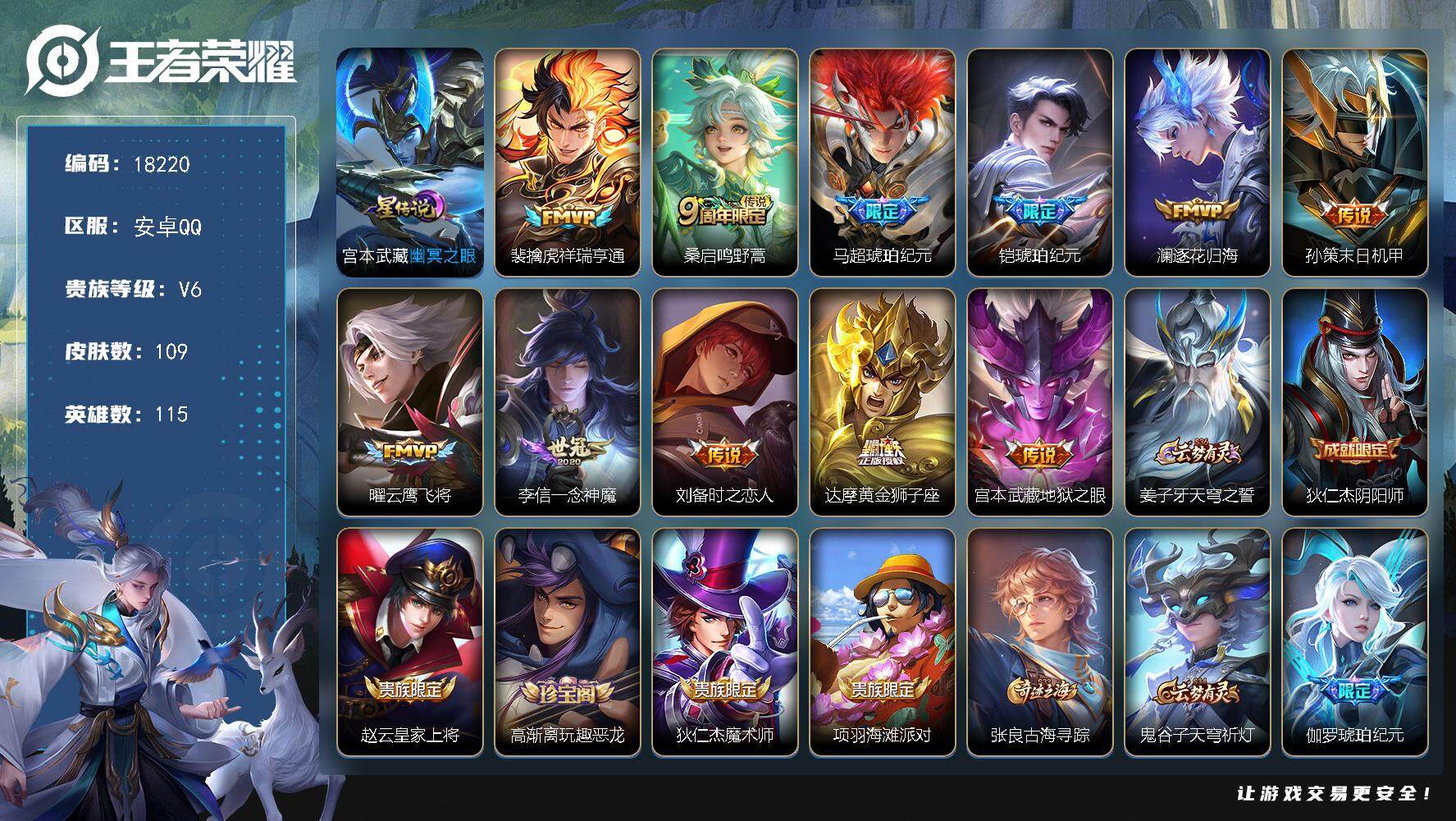 PX_2312359-可换绑【精品打野号,马超铠琥珀纪元,多传说限定质量号】,1按键,1星传说,8王者印记,五级铭文90,可二次KK6795安卓Q-V6-最强王者段位-115英雄-109皮肤-11传说-21史诗【英雄全皮】:孙权全皮【星元皮肤】:宫本武藏幽冥之眼【传说皮肤】:裴擒虎祥瑞亨通,桑启鸣野蒿,马超琥珀纪元,铠琥珀纪元,澜逐花归海,孙策末日机甲,曜云鹰飞将,李信一念神魔,刘备时之恋人,达摩黄金狮子座,宫本武藏地狱之眼【限定皮肤】:姜子牙天穹之誓,狄仁杰阴阳师,赵云皇家上将,高渐离玩趣恶龙,狄仁杰魔术师,项羽海滩派对,张良古海寻踪,鬼谷子天穹祈灯,伽罗琥珀纪元,铠琥珀纪元,马超琥珀纪元,沈梦溪龙舞盛年,鲁班七号蔬乡物语,李元芳蔬乡物语,刘邦剑破天穹,程咬金群星魔术团,周瑜熔金海岸【赛季限定】:张良古海寻踪,鬼谷子天穹祈灯,刘邦剑破天穹,姜子牙天穹之誓【战令限定】:鲁班七号蔬乡物语,李元芳蔬乡物语【史诗皮肤】:赵云皇家上将,甄姬冰雪圆舞曲,狄仁杰魔术师,宫本武藏鬼剑武藏,孙尚香水果甜心,妲己魅力维加斯,李白千年之狐,夏侯惇乘风破浪,阿轲节奏热浪,狄仁杰鹰眼统帅,百里玄策热力回旋,杨戬天秀启明,司马懿暗渊魔法,伽罗琥珀纪元,鲁班七号蔬乡物语,牛魔星界战将,刘禅鸭鸭历险记,扁鹊灵蛊蚀心,黄忠百相守梦,公孙离涂山容容,女娲万灵启世【其他皮肤】:项羽海滩派对,韩信街头霸王,露娜哥特玫瑰,达摩大发明家,赵云忍炎影,芈月红桃皇后,白起白色死神,孙膑天使之翼,典韦黄金武士,亚瑟死亡骑士,达摩拳王,花木兰兔女郎,张飞五福同心,宫本武藏万象初新,狄仁杰阴阳师,关羽龙腾万里,钟无艳海滩丽影,老夫子功夫老勺,孙尚香沉稳之力,诸葛亮掌控之力,李白敏锐之力,高渐离玩趣恶龙,沈梦溪鲨炮海盗猫,狂铁特工战影,鲁班大师乓乓大师,刘禅唤灵魔甲,猪八戒潮玩探月行,太乙真人劲辣红锅,哪吒热血海滩,张良古海寻踪,亚连破局者,曹操决胜大满贯,鬼谷子天穹祈灯,沈梦溪龙舞盛年,李元芳蔬乡物语,刘邦剑破天穹,程咬金群星魔术团,大司命暗都幽影,姜子牙天穹之誓,周瑜熔金海岸,东皇太一噬灭天穹,干将莫邪雾都夜雨,苍苍林狼骑,太乙真人谧流熔炉,典韦铁骨偃魂,西施雪境奇遇,明世隐景韶洛都,戈娅玫蓝誓约,刘备浪漫序章,钟馗虚灵犬护,沈梦溪鸭鸭历险记,苏烈春野闲踪,露娜命运加冕,白起死霸装,甄姬逆浪荇歌,云中君云械蓝图,庄周锦麟游梦,莱西奥踏浪烽翎,亚瑟荣光之誓,孙权径山谋武,艾琳鹤鸣心笺,蚩奼极光幻客,虞姬加勒比小姐,马可波罗激情绿茵,苍维京掠夺者,百里玄策威尼斯狂欢,裴擒虎街头旋风,弈星踏雪寻梅,伽罗花见巫女,李信灼热之刃,镜冰刃幻境,澜孤猎,司空震启蛰,云缨赤焰之缨,金蝉前尘,暃碧珀绯影,桑启画中游