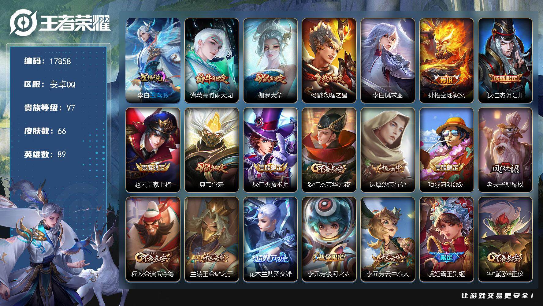PX_2311587-可换绑【时雨天司,狗年杨戬,凤求凰,神威,默契交锋,多传说限定号】,1按键,1星传说,3王者印记,五级铭文80,可二次CD15140,安卓Q-V7-66皮肤-5传说-13史诗【星元皮肤】:李白玉鸾吟【传说皮肤】:诸葛亮时雨天司,伽罗太华,杨戬永曜之星,李白凤求凰,孙悟空地狱火【限定皮肤】:狄仁杰阴阳师,赵云皇家上将,典韦岱宗,狄仁杰魔术师,狄仁杰万华元夜,达摩沙漠行僧,项羽海滩派对,老夫子醍醐杖,程咬金演武夺筹,兰陵王金庭之子,花木兰默契交锋,李元芳银河之约,李元芳云中旅人,虞姬霸王别姬,钟馗驱傩正仪,杨戬永曜之星,鬼谷子原初探秘者,诸葛亮时雨天司,弈星混沌棋,沈梦溪星空之诺,沈梦溪大漠名商,明世隐疑决卦,裴擒虎擒涛扼浪,伽罗太华,鲁班大师探海日志,桑启海盐诗旅,张良古海寻踪【年限皮肤】:李白凤求凰,杨戬永曜之星,诸葛亮时雨天司,伽罗太华,典韦岱宗,马超神威【赛季限定】:狄仁杰万华元夜,达摩沙漠行僧,老夫子醍醐杖,程咬金演武夺筹,兰陵王金庭之子,张良古海寻踪,李元芳云中旅人,钟馗驱傩正仪,鬼谷子原初探秘者,弈星混沌棋,沈梦溪大漠名商,明世隐疑决卦,裴擒虎擒涛扼浪,鲁班大师探海日志,桑启海盐诗旅【战令限定】:李元芳银河之约,沈梦溪星空之诺【史诗皮肤】:赵云皇家上将,王昭君偶像歌手,狄仁杰魔术师,廉颇地狱岩魂,妲己魅力维加斯,墨子龙骑士,虞姬霸王别姬,白起星夜王子,狄仁杰鹰眼统帅,李元芳银河之约,典韦岱宗,马超神威,花木兰默契交锋【其他皮肤】:项羽海滩派对,韩信教廷特使,韩信街头霸王,达摩大发明家,赵云忍炎影,亚瑟死亡骑士,花木兰兔女郎,刘备万事如意,狄仁杰阴阳师,关羽龙腾万里,宫本武藏霸王丸,王昭君幻想奇妙夜,狂铁命运角斗场,吕布野性能量,沈梦溪星空之诺,弈星混沌棋,明世隐疑决卦,老夫子醍醐杖,鬼谷子原初探秘者,狄仁杰万华元夜,程咬金演武夺筹,钟馗驱傩正仪,鲁班大师乓乓大师,达摩沙漠行僧,兰陵王金庭之子,沈梦溪大漠名商,蒙恬蔚蓝守将,李元芳云中旅人,桑启海盐诗旅,裴擒虎擒涛扼浪,鲁班大师探海日志,张良古海寻踪,鲁班七号福禄兄弟,露娜绯红之刃,小乔万圣前夜,后羿精灵王,夏侯惇战争骑士,大乔伊势巫女,东皇太一东海龙王,干将莫邪第七人偶,铠龙域领主,明世隐占星师,裴擒虎街头旋风,李信灼热之刃,盘古创世神祝,马超幸存者,蒙犽归虚梦演,镜冰刃幻境