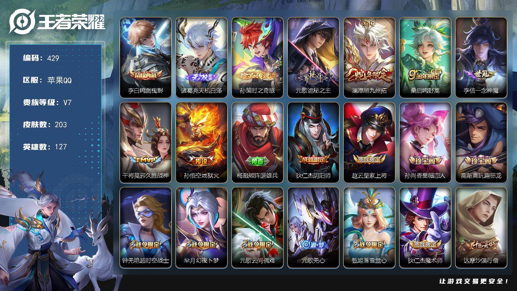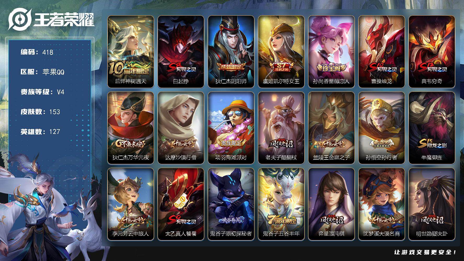 PX_2306010-Q-V4-永恒钻石IV段位-夺宝幸运值224-127英雄-153皮肤-1传说-28史诗 【传说皮肤】:后羿神树通天 【限定皮肤】:白起狰,狄仁杰阴阳师,虞姬凯尔特女王,孙尚香蔷薇恋人,曹操烛龙,典韦穷奇,狄仁杰万华元夜,达摩沙漠行僧,项羽海滩派对,老夫子醍醐杖,兰陵王金庭之子,孙悟空孙行者,牛魔御旌,李元芳云中旅人,太乙真人饕餮,鬼谷子原初探秘者,鬼谷子五谷丰年,弈星混沌棋,沈梦溪大漠名商,明世隐疑决卦,裴擒虎李小龙,狂铁御狮,米莱狄御霄,盾山御銮,上官婉儿梁祝,鲁班大师探海日志,桑启海盐诗旅,阿古朵江河有灵,张良古海寻踪,鬼谷子天穹祈灯,刘邦剑破天穹,刘备异域游侠 【赛季限定】:白起狰,曹操烛龙,典韦穷奇,狄仁杰万华元夜,达摩沙漠行僧,老夫子醍醐杖,兰陵王金庭之子,张良古海寻踪,牛魔御旌,李元芳云中旅人,虞姬凯尔特女王,太乙真人饕餮,鬼谷子原初探秘者,弈星混沌棋,沈梦溪大漠名商,明世隐疑决卦,狂铁御狮,米莱狄御霄,盾山御銮,鲁班大师探海日志,桑启海盐诗旅,鬼谷子天穹祈灯,刘邦剑破天穹 【史诗皮肤】:貂蝉圣诞恋歌,甄姬冰雪圆舞曲,宫本武藏鬼剑武藏,孙尚香蔷薇恋人,孙尚香水果甜心,嬴政暗夜贵公子,嬴政摇滚巨星,妲己女仆咖啡,张飞乱世虎臣,小乔缤纷独角兽,诸葛亮黄金分割率,雅典娜冰冠公主,蔡文姬舞动绿茵,刘禅天才门将,程咬金功夫厨神,白起星夜王子,伽罗箭羽风息,狄仁杰鹰眼统帅,上官婉儿梁祝,小乔青蛇,裴擒虎李小龙,孙悟空孙行者,鬼谷子五谷丰年,阿古朵江河有灵,阿轲化蝶舞,刘禅鸭鸭历险记,黄忠百相守梦,公孙离涂山容容 【其他皮肤】:项羽海滩派对,韩信教廷特使,韩信街头霸王,露娜哥特玫瑰,阿轲爱心护理,达摩大发明家,赵云忍炎影,程咬金星际陆战队,牛魔西部大镖客,扁鹊化身博士,宫本武藏未来纪元,安琪拉玩偶对对碰,妲己少女阿狸,典韦黄金武士,亚瑟死亡骑士,达摩拳王,花木兰兔女郎,张飞五福同心,甄姬花好人间,刘备万事如意,宫本武藏万象初新,狄仁杰阴阳师,刘备纽约教父,刘备汉昭烈帝,关羽龙腾万里,虞姬凯尔特女王,白起狰,钟无艳海滩丽影,太乙真人饕餮,曹操烛龙,王昭君幻想奇妙夜,老夫子功夫老勺,孙尚香沉稳之力,典韦穷奇,鬼谷子幻乐之宴,狂铁御狮,苏烈坚韧之力,大乔守护之力,米莱狄御霄,明世隐虹云星官,牛魔御旌,小乔丁香结,吕布野性能量,盾山御銮,沈梦溪鲨炮海盗猫,弈星混沌棋,哪