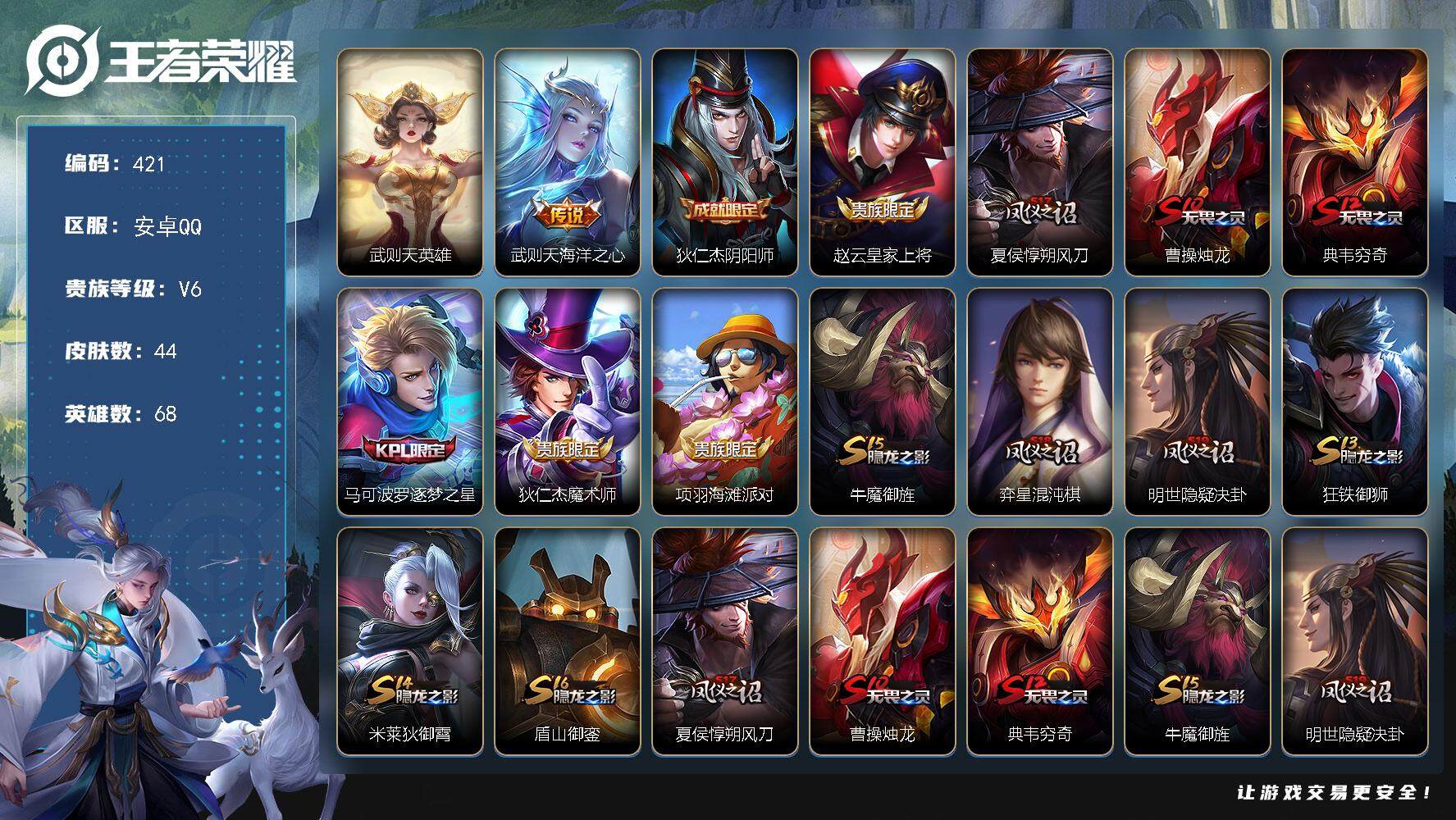 PX_2306015-Q-V6-永恒钻石IV段位-68英雄-44皮肤-1典藏英雄-1传说-6史诗 【荣耀典藏】:武则天英雄 【传说皮肤】:武则天海洋之心 【限定皮肤】:狄仁杰阴阳师,赵云皇家上将,夏侯惇朔风刀,曹操烛龙,典韦穷奇,马可波罗逐梦之星,狄仁杰魔术师,项羽海滩派对,牛魔御旌,弈星混沌棋,明世隐疑决卦,狂铁御狮,米莱狄御霄,盾山御銮 【赛季限定】:夏侯惇朔风刀,曹操烛龙,典韦穷奇,牛魔御旌,弈星混沌棋,明世隐疑决卦,狂铁御狮,米莱狄御霄,盾山御銮 【史诗皮肤】:赵云皇家上将,貂蝉圣诞恋歌,狄仁杰魔术师,马可波罗逐梦之星,雅典娜冰冠公主,狄仁杰鹰眼统帅 【其他皮肤】:项羽海滩派对,韩信教廷特使,阿轲爱心护理,赵云忍炎影,扁鹊化身博士,妲己少女阿狸,达摩拳王,张飞五福同心,甄姬花好人间,刘备万事如意,狄仁杰阴阳师,刘备纽约教父,刘备汉昭烈帝,墨子进击墨子号,钟无艳海滩丽影,曹操烛龙,典韦穷奇,狂铁御狮,米莱狄御霄,牛魔御旌,盾山御銮,夏侯惇朔风刀,弈星混沌棋,明世隐疑决卦,艾琳鹤鸣心笺,孙膑未来旅行,孙悟空西部大镖客,周瑜海军大将,后羿精灵王,干将莫邪第七人偶,元歌午夜歌剧院,孙策海之征途,沈梦溪棒球奇才,盘古创世神祝,瑶森,鲁班大师归虚梦演,蒙恬秩序猎龙将