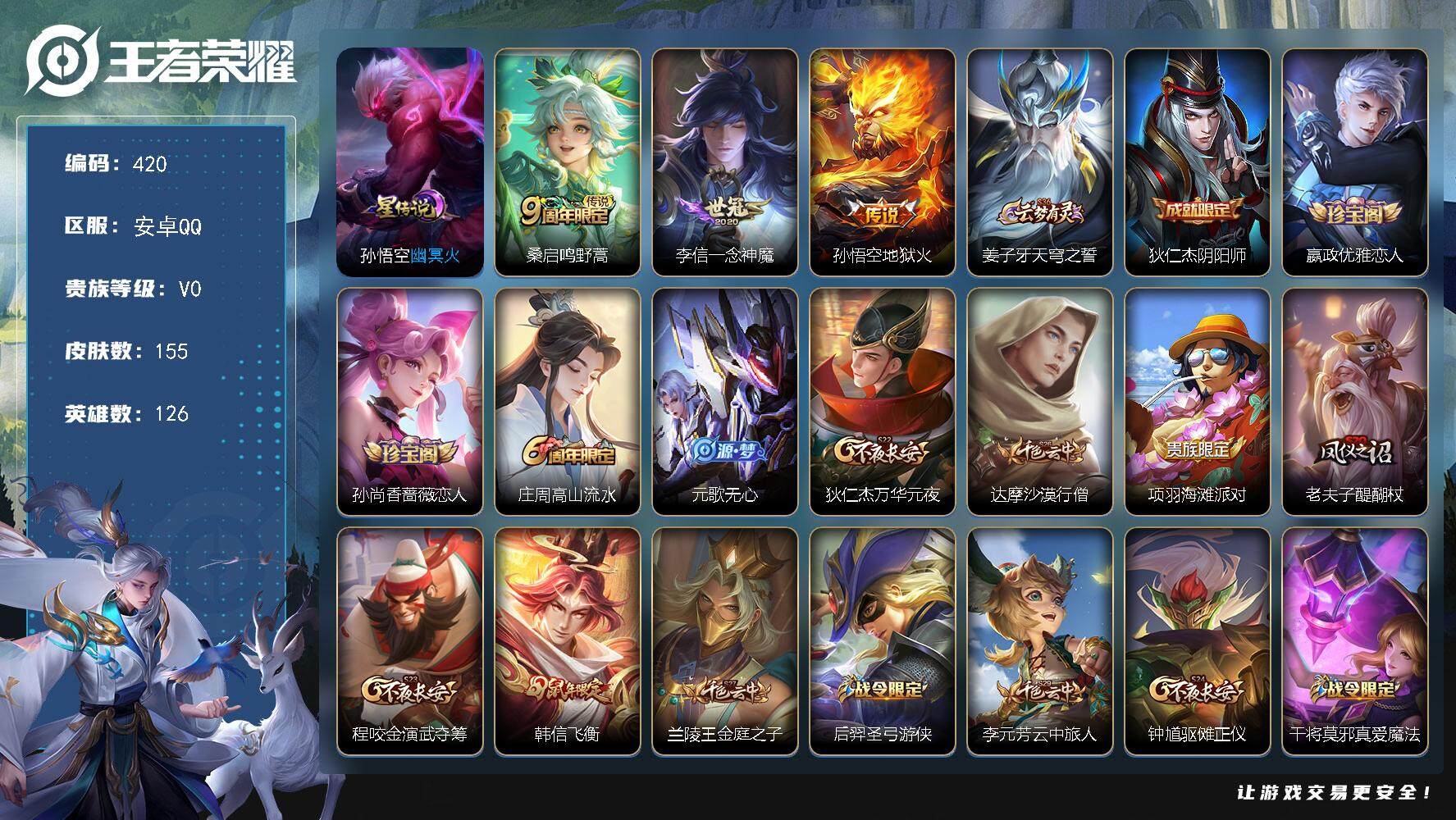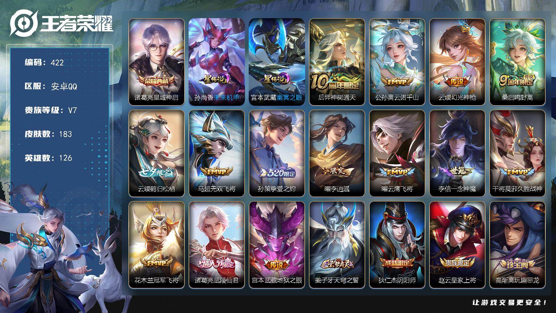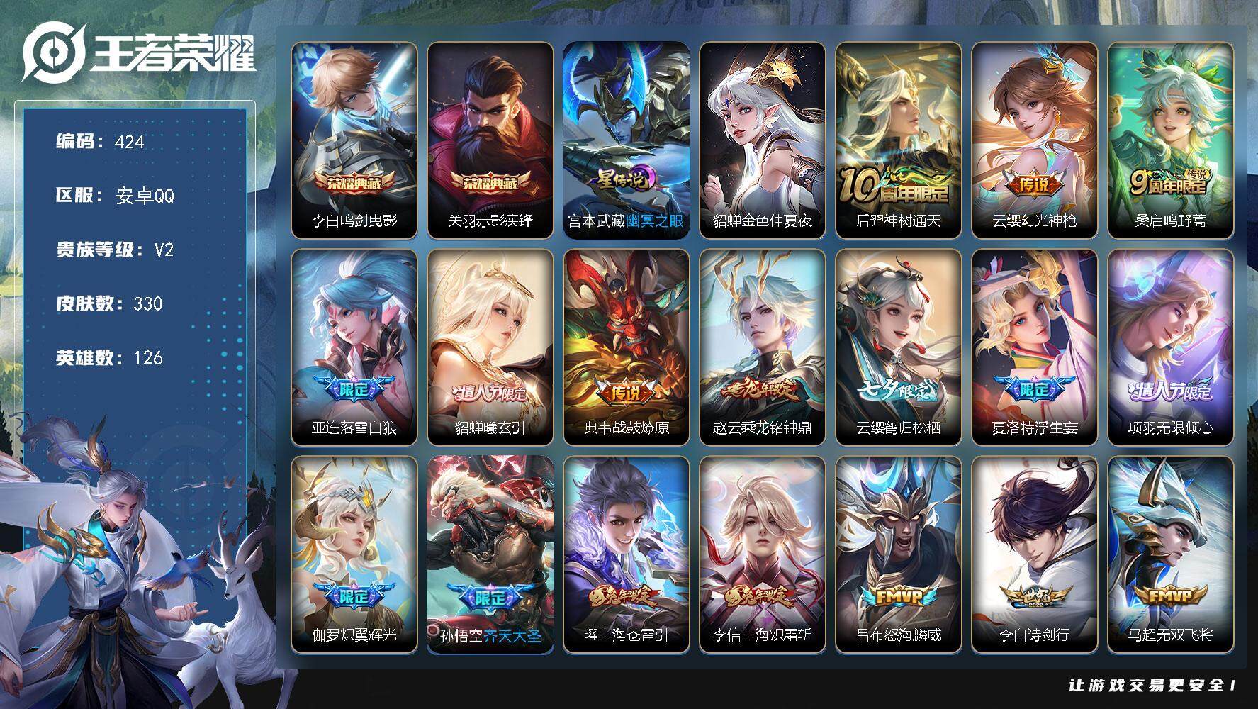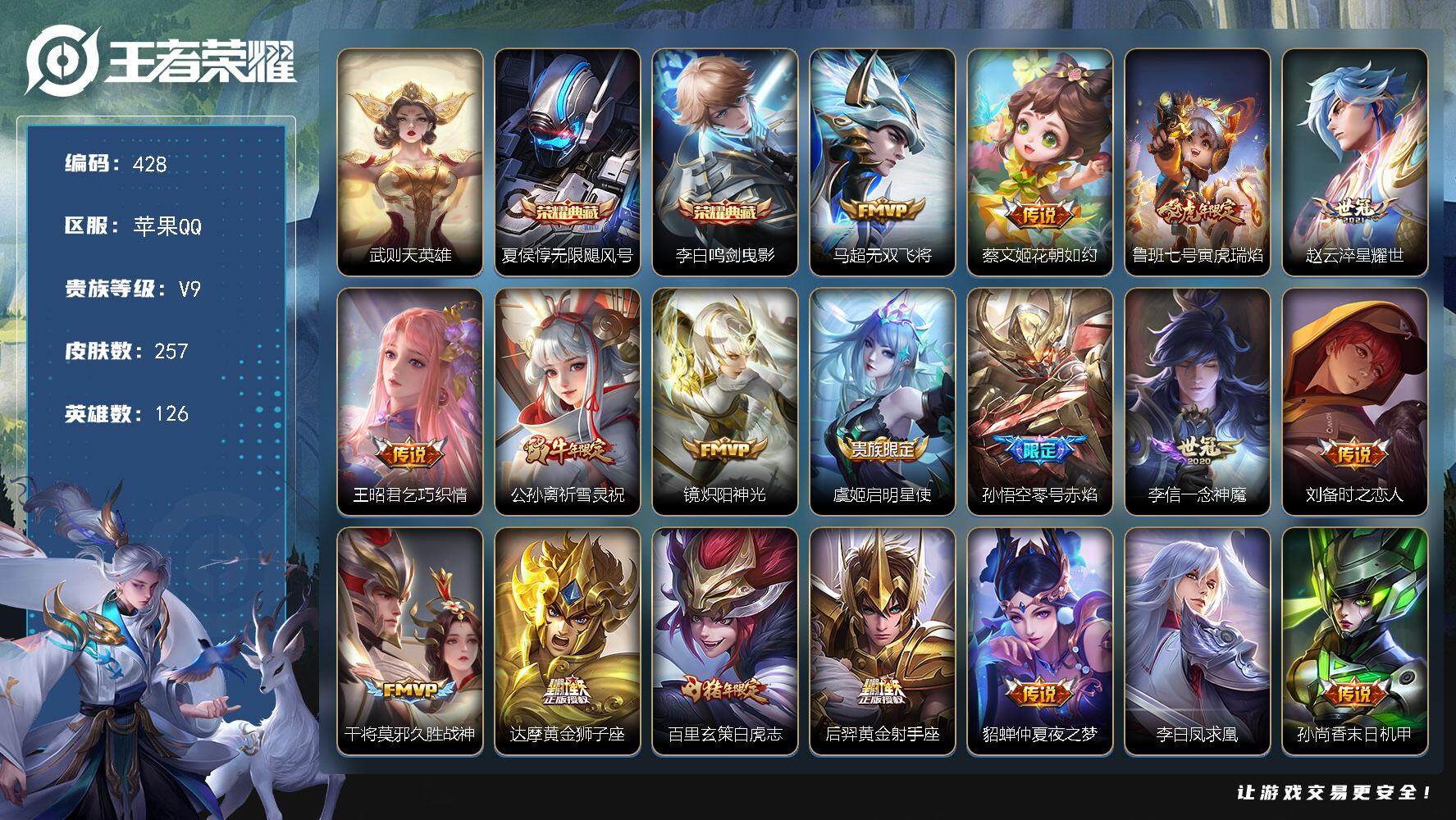 PX_2306017-Q-V9-最强王者段位-126英雄-330皮肤-2典藏皮肤-30传说-82史诗 【英雄全皮】:太乙真人全皮,李信全皮,蒙恬全皮,影全皮 【荣耀典藏】:李白鸣剑曳影,关羽赤影疾锋 【传说皮肤】:后羿神树通天,云缨幻光神枪,桑启鸣野蒿,亚连落雪白狼,貂蝉曦玄引,典韦战鼓燎原,赵云乘龙铭钟鼎,云缨鹤归松栖,夏洛特浮生妄,项羽无限倾心,伽罗炽翼辉光,孙悟空齐天大圣,曜山海苍雷引,李信山海炽霜斩,吕布怒海麟威,李白诗剑行,马超无双飞将,西施游龙清影,虞姬启明星使,关羽武圣,李信一念神魔,刘备时之恋人,干将莫邪久胜战神,达摩黄金狮子座,杨戬永曜之星,诸葛亮武陵仙君,貂蝉仲夏夜之梦,李白凤求凰,宫本武藏地狱之眼,吕布天魔缭乱 【限定皮肤】:白起狰,狄仁杰阴阳师,虞姬凯尔特女王,赵云皇家上将,赵云龙胆,墨子神迹守卫,庄周高山流水,高渐离死亡摇滚,阿轲迷踪丽影,钟无艳超时空战士,孙膑妖精王,扁鹊炼金王,芈月重明,吕布天魔缭乱,元歌云间偶戏,元歌无心,夏侯惇朔风刀,甄姬游园惊梦,甄姬落雪兰心,曹操烛龙,典韦穷奇,马可波罗山海玄木吟,狄仁杰魔术师,狄仁杰万华元夜,达摩星际陆战队,达摩沙漠行僧,项羽海滩派对,项羽无限倾心,老夫子醍醐杖,老夫子航海奇遇记,关羽冰锋战神,关羽武圣,程咬金演武夺筹,韩信逐梦之影,韩信飞衡,兰陵王金庭之子,花木兰瑞麟志,亚瑟潮玩骑士王,孙悟空齐天大圣,牛魔御旌,后羿辉光之辰,李元芳云中旅人,虞姬启明星使,钟馗驱傩正仪,杨玉环遇见飞天,杨戬永曜之星,雅典娜黎明之约,蔡文姬繁星吟游,太乙真人饕餮,太乙真人华丽摇滚,鬼谷子原初探秘者,鬼谷子五谷丰年,诸葛亮武陵仙君,大乔白鹤梁神女,苏烈千军破阵,百里玄策原初追逐者,弈星混沌棋,梦奇顽趣,公孙离蜜橘之夏,沈梦溪大漠名商,明世隐疑决卦,裴擒虎李小龙,裴擒虎擒涛扼浪,狂铁御狮,米莱狄御霄,米莱狄胡桃异想国,云中君纤云弄巧,李信山海炽霜斩,伽罗天狼溯光者,伽罗炽翼辉光,盾山御銮,猪八戒猪悟能,上官婉儿梁祝,上官婉儿神器万象笔,嫦娥暖冬兔眠,曜山海苍雷引,鲁班大师探海日志,盘古冰霜神祇,桑启海盐诗旅,夏洛特浮生妄,暃星界游侠,艾琳女武神,艾琳流音漫舞,云缨鹤归松栖,司空震地狱燃心,张良古海寻踪,蒙恬荣光圣徽,鬼谷子天穹祈灯,伽罗琥珀纪元,姬小满妄想食味,赵云乘龙铭钟鼎,貂蝉曦玄引,百里玄策超元猎域,亚连落雪白狼,沈梦溪龙舞盛
