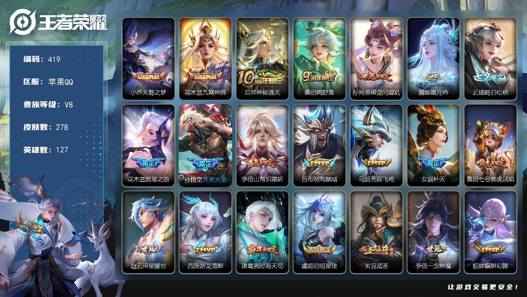 PX_2306011-Q-V8-最强王者段位-对抗路13段-3星元-鲁班寅虎焰心-狄仁杰超时空战士-貂蝉金色仲夏夜-127英雄-278皮肤-2典藏皮肤-21传说-77史诗 【英雄全皮】:刘禅全皮,孙权全皮,李信全皮,影全皮 【荣耀典藏】:小乔天鹅之梦,花木兰九霄神辉 【传说皮肤】:后羿神树通天,桑启鸣野蒿,孙尚香乘龙问璇玑,露娜霜月吟,云缨鹤归松栖,花木兰燃星之曲,孙悟空齐天大圣,李信山海炽霜斩,吕布怒海麟威,马超无双飞将,女娲补天,鲁班七号寅虎瑞焰,赵云淬星耀世,西施游龙清影,诸葛亮时雨天司,虞姬启明星使,关羽武圣,李信一念神魔,貂蝉猫影幻舞,干将莫邪久胜战神,貂蝉仲夏夜之梦 【限定皮肤】:蒙犽顽岩魄,蔡文姬夏日便利店,虞姬夏日便利店,姜子牙天穹之誓,杨戬破阵退雄兵,狄仁杰阴阳师,赵云皇家上将,嬴政白昼王子,孙尚香蔷薇恋人,鲁班七号寅虎瑞焰,扁鹊奇幻香踪,元歌云间偶戏,夏侯惇朔风刀,夏侯惇匿光决锋者,典韦岱宗,狄仁杰魔术师,狄仁杰万华元夜,项羽海滩派对,老夫子醍醐杖,关羽武圣,程咬金演武夺筹,花木兰燃星之曲,亚瑟潮玩骑士王,孙悟空至尊宝,孙悟空孙行者,孙悟空齐天大圣,李元芳银河之约,李元芳云中旅人,虞姬启明星使,钟馗驱傩正仪,杨戬潮玩骑兵,女娲补天,鬼谷子原初探秘者,诸葛亮时雨天司,弈星混沌棋,明世隐疑决卦,裴擒虎李小龙,裴擒虎擒涛扼浪,米莱狄御霄,云中君纤云弄巧,李信山海炽霜斩,盾山御銮,上官婉儿神器万象笔,嫦娥拒霜思,嫦娥暖冬兔眠,西施玲珑珍味,鲁班大师探海日志,桑启海盐诗旅,暃星界游侠,戈娅驭风魔法,艾琳流音漫舞,赵怀真鹤归松栖,云缨鹤归松栖,司空震地狱燃心,阿古朵江河有灵,张良古海寻踪,蒙犽百解令,高渐离燃音魔法,妲己灵卜魔法,鬼谷子天穹祈灯,安琪拉乘龙聚宝船,孙尚香乘龙问璇玑,沈梦溪龙舞盛年,鲁班七号蔬乡物语,李元芳蔬乡物语,刘邦剑破天穹,程咬金群星魔术团,关羽决胜骁骑,镜青焰无极,项羽苍威无极,刘备异域游侠,周瑜熔金海岸 【年限皮肤】:鲁班七号寅虎瑞焰,诸葛亮时雨天司,典韦岱宗,关羽武圣,李信山海炽霜斩,安琪拉乘龙聚宝船,孙尚香乘龙问璇玑 【赛季限定】:夏侯惇朔风刀,狄仁杰万华元夜,老夫子醍醐杖,程咬金演武夺筹,张良古海寻踪,李元芳云中旅人,钟馗驱傩正仪,鬼谷子原初探秘者,弈星混沌棋,明世隐疑决卦,裴擒虎擒涛扼浪,米莱狄御霄,盾山御銮,鲁班大师探海日志,桑启海盐诗旅,