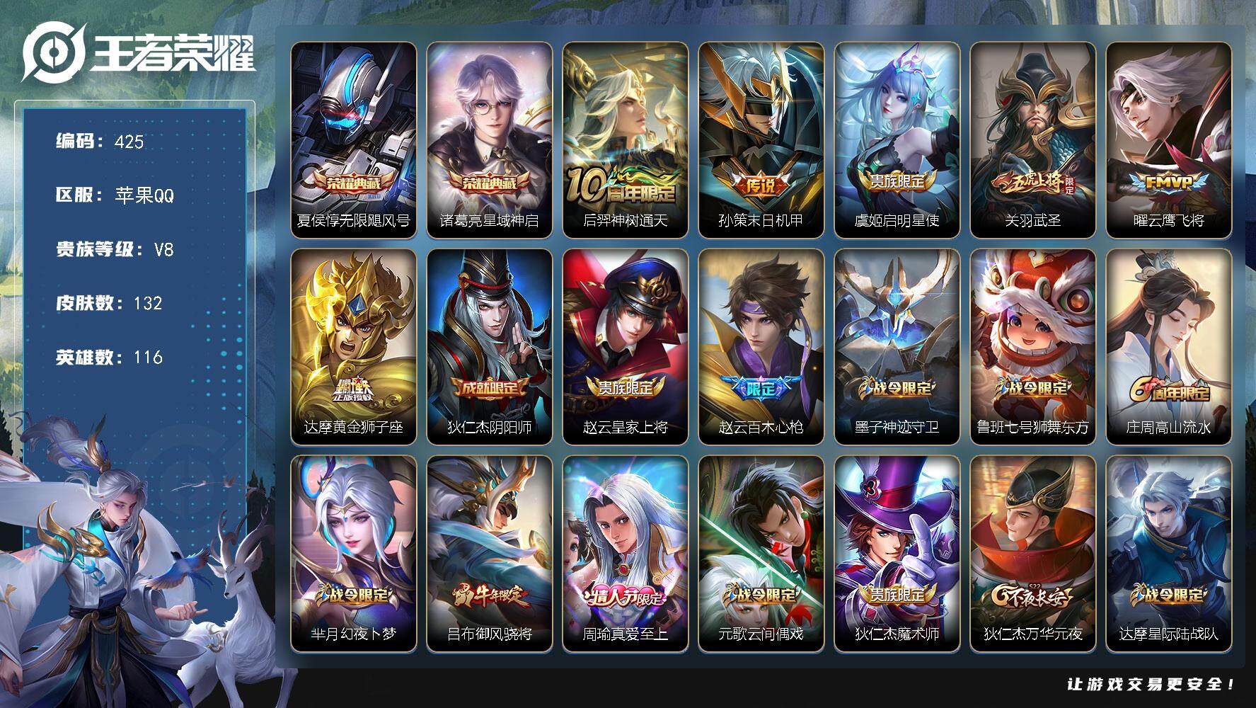 PX_2306018-Q-V8-至尊星耀V段位-116英雄-132皮肤-2典藏皮肤-6传说-50史诗 【荣耀典藏】:夏侯惇无限飓风号,诸葛亮星域神启 【传说皮肤】:后羿神树通天,孙策末日机甲,虞姬启明星使,关羽武圣,曜云鹰飞将,达摩黄金狮子座 【限定皮肤】:狄仁杰阴阳师,赵云皇家上将,赵云百木心枪,墨子神迹守卫,鲁班七号狮舞东方,庄周高山流水,芈月幻夜卜梦,吕布御风骁将,周瑜真爱至上,元歌云间偶戏,狄仁杰魔术师,狄仁杰万华元夜,达摩星际陆战队,达摩沙漠行僧,项羽海滩派对,老夫子航海奇遇记,关羽武圣,程咬金演武夺筹,韩信傲雪梅枪,兰陵王金庭之子,花木兰青春决赛季,亚瑟潮玩骑士王,孙悟空孙行者,后羿圣弓游侠,李元芳云中旅人,虞姬启明星使,钟馗驱傩正仪,干将莫邪冰霜恋舞曲,干将莫邪真爱魔法,黄忠火炮绅士,苏烈千军破阵,沈梦溪大漠名商,米莱狄胡桃异想国,伽罗天狼溯光者,上官婉儿梁祝,鲁班大师探海日志,桑启海盐诗旅,艾琳女武神,沈梦溪龙舞盛年 【年限皮肤】:吕布御风骁将,关羽武圣 【赛季限定】:狄仁杰万华元夜,达摩沙漠行僧,程咬金演武夺筹,兰陵王金庭之子,李元芳云中旅人,钟馗驱傩正仪,苏烈千军破阵,沈梦溪大漠名商,鲁班大师探海日志,桑启海盐诗旅 【战令限定】:墨子神迹守卫,鲁班七号狮舞东方,芈月幻夜卜梦,元歌云间偶戏,达摩星际陆战队,老夫子航海奇遇记,亚瑟潮玩骑士王,后羿圣弓游侠,干将莫邪真爱魔法,黄忠火炮绅士,米莱狄胡桃异想国 【史诗皮肤】:鲁班七号电玩小子,项羽苍穹之光,阿轲暗夜猫娘,赵云皇家上将,貂蝉圣诞恋歌,甄姬冰雪圆舞曲,王昭君偶像歌手,狄仁杰魔术师,宫本武藏鬼剑武藏,孙尚香水果甜心,妲己魅力维加斯,妲己女仆咖啡,墨子龙骑士,吕布圣诞狂欢,周瑜真爱至上,曹操幽灵船长,李白千年之狐,张飞乱世虎臣,花木兰水晶猎龙者,夏侯惇乘风破浪,小乔缤纷独角兽,亚瑟心灵战警,雅典娜冰冠公主,安琪拉心灵骇客,花木兰青春决赛季,铠曙光守护者,刘禅天才门将,李元芳逐浪之夏,程咬金功夫厨神,阿轲节奏热浪,孙策猫狗日记,大乔猫狗日记,干将莫邪冰霜恋舞曲,鲁班七号狮舞东方,狄仁杰鹰眼统帅,上官婉儿梁祝,元歌云间偶戏,吕布御风骁将,米莱狄胡桃异想国,老夫子航海奇遇记,伽罗天狼溯光者,干将莫邪真爱魔法,安琪拉时之奇旅,孙悟空孙行者,庄周高山流水,司马懿暗渊魔法,黄忠火炮绅士,韩信傲雪梅枪,夏洛特永昼,赵云百木心枪