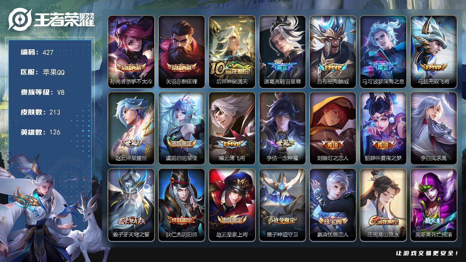 PX_2306019-Q-V8-最强王者段位-打野27段-对抗路22段-3星元-李白凤求凰-刘备时之恋人-貂蝉金色仲夏夜-126英雄-213皮肤-2典藏皮肤-12传说-73史诗 【荣耀典藏】:孙尚香杀手不太冷,关羽赤影疾锋 【传说皮肤】:后羿神树通天,诸葛亮鹤羽星尊,吕布怒海麟威,马可波罗深海之息,马超无双飞将,赵云淬星耀世,虞姬启明星使,曜云鹰飞将,李信一念神魔,刘备时之恋人,貂蝉仲夏夜之梦,李白凤求凰 【限定皮肤】:姜子牙天穹之誓,狄仁杰阴阳师,赵云皇家上将,墨子神迹守卫,嬴政优雅恋人,庄周高山流水,高渐离死亡摇滚,钟无艳超时空战士,芈月幻夜卜梦,元歌云间偶戏,元歌无心,夏侯惇朔风刀,甄姬落雪兰心,马可波罗暗影游猎,马可波罗深海之息,狄仁杰魔术师,狄仁杰万华元夜,达摩星际陆战队,达摩沙漠行僧,项羽海滩派对,老夫子醍醐杖,老夫子航海奇遇记,关羽冰锋战神,程咬金演武夺筹,韩信傲雪梅枪,王昭君午后时光,兰陵王金庭之子,花木兰默契交锋,亚瑟潮玩骑士王,孙悟空孙行者,后羿圣弓游侠,李元芳云中旅人,虞姬启明星使,钟馗驱傩正仪,干将莫邪真爱魔法,雅典娜黎明之约,鬼谷子原初探秘者,鬼谷子五谷丰年,诸葛亮鹤羽星尊,黄忠火炮绅士,苏烈千军破阵,百里玄策原初追逐者,弈星混沌棋,梦奇顽趣,沈梦溪大漠名商,明世隐疑决卦,裴擒虎李小龙,裴擒虎擒涛扼浪,狂铁电玩高手,米莱狄胡桃异想国,云中君纤云弄巧,伽罗天狼溯光者,猪八戒猪悟能,上官婉儿梁祝,嫦娥拒霜思,西施玲珑珍味,鲁班大师探海日志,桑启海盐诗旅,戈娅驭风魔法,艾琳流音漫舞,司空震地狱燃心,阿古朵江河有灵,张良古海寻踪,高渐离燃音魔法,妲己灵卜魔法,鬼谷子天穹祈灯,姬小满妄想食味,刘邦剑破天穹,程咬金群星魔术团 【年限皮肤】:李白凤求凰 【赛季限定】:夏侯惇朔风刀,狄仁杰万华元夜,达摩沙漠行僧,老夫子醍醐杖,程咬金演武夺筹,兰陵王金庭之子,张良古海寻踪,李元芳云中旅人,钟馗驱傩正仪,雅典娜黎明之约,鬼谷子原初探秘者,苏烈千军破阵,百里玄策原初追逐者,弈星混沌棋,梦奇顽趣,沈梦溪大漠名商,明世隐疑决卦,裴擒虎擒涛扼浪,鲁班大师探海日志,桑启海盐诗旅,鬼谷子天穹祈灯,刘邦剑破天穹,姜子牙天穹之誓 【战令限定】:墨子神迹守卫,钟无艳超时空战士,芈月幻夜卜梦,元歌云间偶戏,甄姬落雪兰心,马可波罗暗影游猎,达摩星际陆战队,老夫子航海奇遇记,王昭君午后时光,艾琳流音