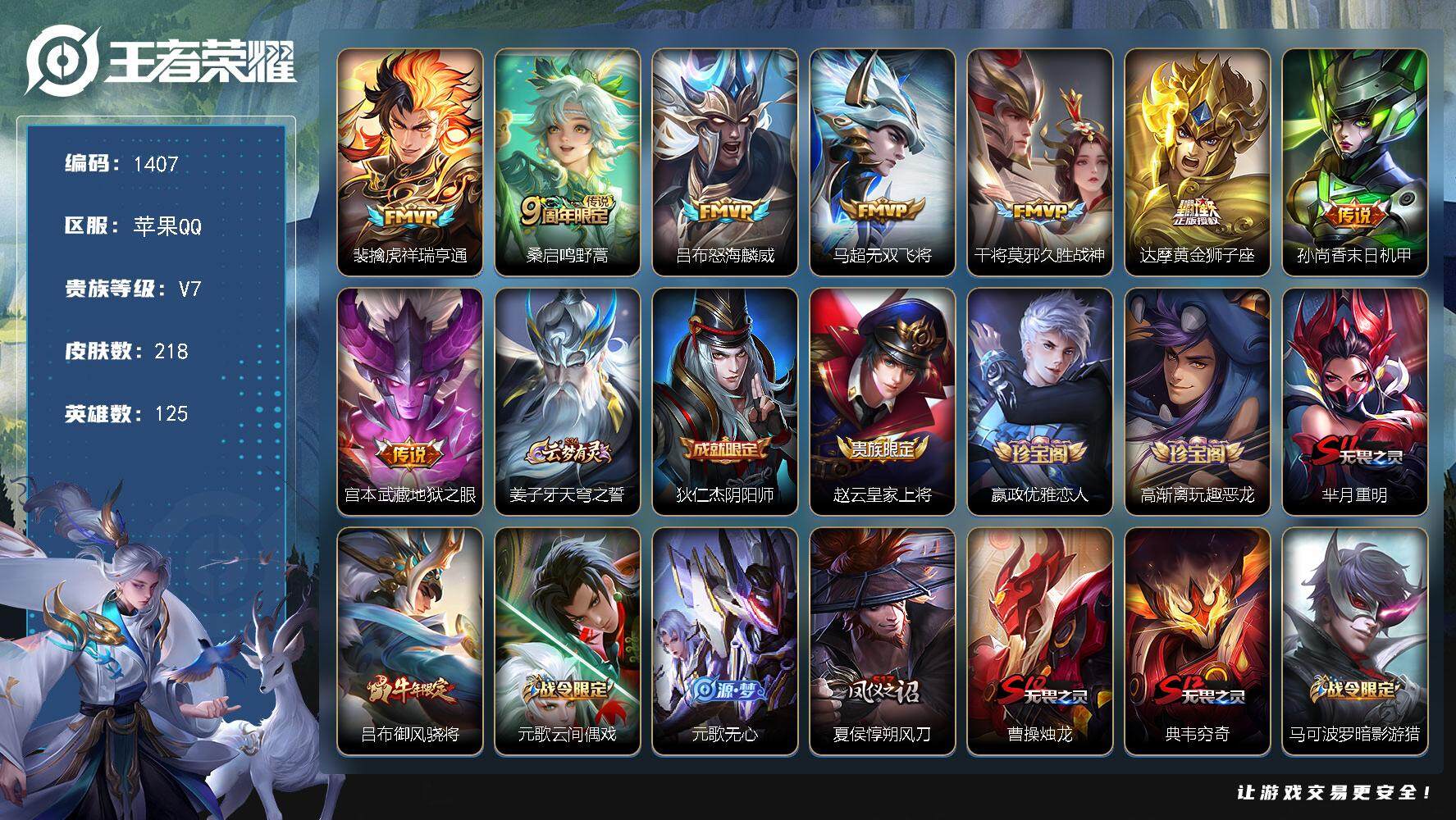 PX_2312740-【218皮8传说,至尊宝,祥瑞亨通,怒海麟威,无双飞将,久胜战神,御风骁将】苹果Q-V7-最强王者段位-125英雄-218皮肤-8传说-58史诗 【英雄全皮】:孙权全皮,影全皮 【传说皮肤】:裴擒虎祥瑞亨通,桑启鸣野蒿,吕布怒海麟威,马超无双飞将,干将莫邪久胜战神,达摩黄金狮子座,孙尚香末日机甲,宫本武藏地狱之眼 【限定皮肤】:姜子牙天穹之誓,狄仁杰阴阳师,赵云皇家上将,嬴政优雅恋人,高渐离玩趣恶龙,芈月重明,吕布御风骁将,元歌云间偶戏,元歌无心,夏侯惇朔风刀,曹操烛龙,典韦穷奇,马可波罗暗影游猎,马可波罗山海玄木吟,狄仁杰魔术师,狄仁杰万华元夜,项羽海滩派对,老夫子醍醐杖,关羽冰锋战神,程咬金演武夺筹,韩信飞衡,韩信傲雪梅枪,亚瑟潮玩骑士王,孙悟空至尊宝,牛魔御旌,李元芳云中旅人,钟馗驱傩正仪,干将莫邪冰霜恋舞曲,鬼谷子原初探秘者,鬼谷子五谷丰年,百里玄策原初追逐者,弈星混沌棋,沈梦溪大漠名商,明世隐疑决卦,裴擒虎李小龙,裴擒虎擒涛扼浪,狂铁御狮,米莱狄御霄,云中君纤云弄巧,盾山御銮,猪八戒西部大镖客,上官婉儿梁祝,鲁班大师探海日志,桑启海盐诗旅,阿古朵江河有灵,张良古海寻踪,蒙恬荣光圣徽,鬼谷子天穹祈灯,沈梦溪龙舞盛年,刘邦剑破天穹,程咬金群星魔术团 【年限皮肤】:吕布御风骁将,韩信飞衡,马可波罗山海玄木吟 【赛季限定】:芈月重明,夏侯惇朔风刀,曹操烛龙,典韦穷奇,狄仁杰万华元夜,老夫子醍醐杖,程咬金演武夺筹,张良古海寻踪,牛魔御旌,李元芳云中旅人,钟馗驱傩正仪,鬼谷子原初探秘者,百里玄策原初追逐者,弈星混沌棋,沈梦溪大漠名商,明世隐疑决卦,裴擒虎擒涛扼浪,狂铁御狮,米莱狄御霄,盾山御銮,鲁班大师探海日志,桑启海盐诗旅,鬼谷子天穹祈灯,蒙恬荣光圣徽,刘邦剑破天穹,姜子牙天穹之誓 【战令限定】:元歌云间偶戏,马可波罗暗影游猎,亚瑟潮玩骑士王,猪八戒西部大镖客 【史诗皮肤】:项羽苍穹之光,露娜紫霞仙子,赵云皇家上将,赵云未来纪元,甄姬冰雪圆舞曲,狄仁杰魔术师,廉颇地狱岩魂,宫本武藏鬼剑武藏,孙尚香水果甜心,嬴政优雅恋人,嬴政摇滚巨星,妲己魅力维加斯,墨子金属风暴,曹操幽灵船长,李白千年之狐,张飞乱世虎臣,关羽冰锋战神,孙悟空至尊宝,花木兰水晶猎龙者,刘邦德古拉伯爵,夏侯惇乘风破浪,小乔缤纷独角兽,兰陵王暗隐猎兽者,诸葛亮黄金分割率,百里守约特工魅影,铠曙光守护者,蔡文姬舞动绿茵,李元芳逐浪之夏,白起星夜王子,阿轲节奏热浪,干将莫邪冰霜恋舞曲,狄仁杰鹰眼统帅,上官婉儿梁祝,娜可露露晚萤,韩信飞衡,橘右京修罗,瑶遇见神鹿,马可波罗暗影游猎,百里玄策原初追逐者,裴擒虎李小龙,云中君纤云弄巧,元歌云间偶戏,吕布御风骁将,钟馗乐园奇幻夜,韩信傲雪梅枪,夏洛特永昼,澜赏金猎手,鬼谷子五谷丰年,元歌无心,马可波罗山海玄木吟,刘禅电玩爆裂旋风,阿古朵江河有灵,蒙恬荣光圣徽,牛魔星界战将,白起苍鳞隐世,黄忠百相守梦,女娲万灵启世,少司缘巫礼祀神 【其他皮肤】:项羽海滩派对,韩信教廷特使,韩信街头霸王,露娜哥特玫瑰,阿轲爱心护理,达摩大发明家,赵云忍炎影,程咬金星际陆战队,白起白色死神,牛魔西部大镖客,扁鹊化身博士,宫本武藏未来纪元,安琪拉玩偶对对碰,孙膑天使之翼,妲己少女阿狸,典韦黄金武士,亚瑟死亡骑士,达摩拳王,花木兰兔女郎,张飞五福同心,甄姬花好人间,刘备万事如意,宫本武藏万象初新,后羿阿尔法小队,狄仁杰阴阳师,关羽龙腾万里,钟无艳海滩丽影,宫本武藏霸王丸,曹操烛龙,芈月重明,老夫子功夫老勺,典韦穷奇,李白敏锐之力,鬼谷子幻乐之宴,狂铁御狮,大乔守护之力,米莱狄御霄,明世隐虹云星官,庄周奇妙博物学,牛魔御旌,吕布野性能量,盾山御銮,高渐离玩趣恶龙,沈梦溪鲨炮海盗猫,姜子牙炽热元素使,夏侯惇朔风刀,弈星混沌棋,哪吒次元突破,鲁班七号黑桃队长,明世隐疑决卦,盾山圆桌骑士,老夫子醍醐杖,猪八戒西部大镖客,狂铁特工战影,鬼谷子原初探秘者,狄仁杰万华元夜,亚瑟潮玩骑士王,刘禅秘密基地,杨戬次元傲视,露娜瓷语鉴心,程咬金演武夺筹,张良缤纷绘卷,钟馗驱傩正仪,鲁班大师乓乓大师,程咬金无双福将,沈梦溪大漠名商,蒙恬蔚蓝守将,李元芳云中旅人,刘备潮玩造梦师,桑启海盐诗旅,猪八戒潮玩探月行,白起乐园追猎者,赵怀真太极少年,裴擒虎擒涛扼浪,太乙真人劲辣红锅,莱西奥西部游侠,鲁班大师探海日志,姬小满零食大作战,李元芳妄想特派,张良古海寻踪,海月王牌新星,曹操决胜大满贯,鬼谷子天穹祈灯,海诺时空谍影,朵莉亚金色潮汐,廉颇功夫炙烤,沈梦溪龙舞盛年,钟无艳春野之旅,刘邦剑破天穹,程咬金群星魔术团,姜子牙天穹之誓,东皇太一噬灭天穹,亚瑟动物派对,米莱狄怪诞之夜,干将莫邪雾都夜雨,吕布逐霄战戟,苍苍林狼骑,太乙真人谧流熔炉,典韦铁骨偃魂,影魅影绮裳,西施雪境奇遇,姜子牙星梦巡礼,东皇太一金福满堂,达摩爆裂喵拳,少司缘灵卦秘语,明世隐景韶洛都,戈娅玫蓝誓约,甄姬逆浪荇歌,云中君云械蓝图,莱西奥踏浪烽翎,哪吒罗小黑战记,亚瑟荣光之誓,孙权径山谋武,艾琳鹤鸣心笺,曹操逐霄之志,鲁班七号福禄兄弟,高渐离金属狂潮,项羽帝国元帅,貂蝉异域舞娘,花木兰剑舞者,曹操超能战警,张良一千零一夜,小乔万圣前夜,孙悟空西部大镖客,妲己仙境爱丽丝,周瑜海军大将,后羿精灵王,兰陵王隐刃,钟馗地府判官,李元芳特