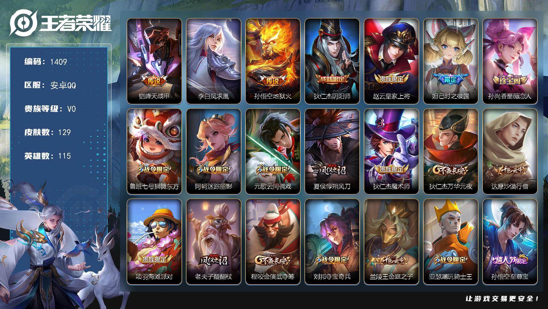 PX_2312738-【李白凤求凰,至尊宝,多限定】安卓Q-V0-最强王者段位-115英雄-129皮肤-3传说-27史诗 【传说皮肤】:铠绛天战甲,李白凤求凰,孙悟空地狱火 【限定皮肤】:狄仁杰阴阳师,赵云皇家上将,妲己时之彼端,孙尚香蔷薇恋人,鲁班七号狮舞东方,阿轲迷踪丽影,元歌云间偶戏,夏侯惇朔风刀,狄仁杰魔术师,狄仁杰万华元夜,达摩沙漠行僧,项羽海滩派对,老夫子醍醐杖,程咬金演武夺筹,刘邦夺宝奇兵,兰陵王金庭之子,亚瑟潮玩骑士王,孙悟空至尊宝,牛魔御旌,李元芳银河之约,李元芳云中旅人,钟馗神迹守卫,钟馗驱傩正仪,蔡文姬繁星吟游,鬼谷子原初探秘者,鬼谷子五谷丰年,苏烈千军破阵,弈星混沌棋,沈梦溪星空之诺,沈梦溪大漠名商,明世隐疑决卦,裴擒虎李小龙,狂铁御狮,米莱狄御霄,云中君纤云弄巧,盾山御銮,上官婉儿梁祝 【年限皮肤】:李白凤求凰 【赛季限定】:夏侯惇朔风刀,狄仁杰万华元夜,达摩沙漠行僧,老夫子醍醐杖,程咬金演武夺筹,兰陵王金庭之子,牛魔御旌,李元芳云中旅人,钟馗驱傩正仪,鬼谷子原初探秘者,苏烈千军破阵,弈星混沌棋,沈梦溪大漠名商,明世隐疑决卦,狂铁御狮,米莱狄御霄,盾山御銮 【战令限定】:鲁班七号狮舞东方,阿轲迷踪丽影,元歌云间偶戏,刘邦夺宝奇兵,亚瑟潮玩骑士王,李元芳银河之约,钟馗神迹守卫,沈梦溪星空之诺 【史诗皮肤】:露娜紫霞仙子,赵云皇家上将,赵云未来纪元,狄仁杰魔术师,宫本武藏鬼剑武藏,孙尚香蔷薇恋人,孙尚香水果甜心,妲己魅力维加斯,墨子龙骑士,吕布圣诞狂欢,李白千年之狐,韩信白龙吟,孙悟空至尊宝,花木兰水晶猎龙者,刘禅天才门将,白起星夜王子,鲁班七号狮舞东方,狄仁杰鹰眼统帅,上官婉儿梁祝,蔡文姬繁星吟游,李元芳银河之约,妲己时之彼端,阿轲迷踪丽影,裴擒虎李小龙,云中君纤云弄巧,元歌云间偶戏,鬼谷子五谷丰年 【其他皮肤】:项羽海滩派对,韩信教廷特使,韩信街头霸王,露娜哥特玫瑰,阿轲爱心护理,达摩大发明家,赵云忍炎影,芈月红桃皇后,程咬金星际陆战队,扁鹊化身博士,妲己少女阿狸,典韦黄金武士,亚瑟死亡骑士,达摩拳王,花木兰兔女郎,张飞五福同心,甄姬花好人间,宫本武藏万象初新,狄仁杰阴阳师,刘备汉昭烈帝,关羽龙腾万里,钟无艳海滩丽影,宫本武藏霸王丸,王昭君幻想奇妙夜,老夫子功夫老勺,孙尚香沉稳之力,鬼谷子幻乐之宴,狂铁御狮,大乔守护之力,项羽科学大爆炸,米莱狄御霄,明世隐虹云星官,牛魔御旌,小乔丁香结,钟馗神迹守卫,盾山御銮,沈梦溪鲨炮海盗猫,姜子牙炽热元素使,夏侯惇朔风刀,沈梦溪星空之诺,弈星混沌棋,鲁班七号黑桃队长,明世隐疑决卦,刘邦夺宝奇兵,盾山圆桌骑士,老夫子醍醐杖,鬼谷子原初探秘者,狄仁杰万华元夜,亚瑟潮玩骑士王,露娜瓷语鉴心,程咬金演武夺筹,钟馗驱傩正仪,鲁班大师乓乓大师,苏烈千军破阵,典韦铁甲之心,达摩沙漠行僧,兰陵王金庭之子,沈梦溪大漠名商,李元芳云中旅人,猪八戒潮玩探月行,姜子牙星梦巡礼,白起死霸装,甄姬逆浪荇歌,亚瑟荣光之誓,艾琳鹤鸣心笺,鲁班七号福禄兄弟,鲁班七号木偶奇遇记,貂蝉异域舞娘,花木兰剑舞者,王昭君精灵公主,曹操死神来了,张良一千零一夜,孙悟空西部大镖客,后羿精灵王,刘禅英喵野望,兰陵王隐刃,李白范海辛,刘邦圣殿之光,虞姬加勒比小姐,雅典娜战争女神,马可波罗激情绿茵,哪吒三太子,黄忠芝加哥教父,干将莫邪第七人偶,铠龙域领主,百里守约绝影神枪,百里玄策威尼斯狂欢,梦奇美梦成真,明世隐占星师,裴擒虎街头旋风,元歌午夜歌剧院,孙策海之征途,伽罗花见巫女,李信灼热之刃,上官婉儿修竹墨客,瑶森,云中君荷鲁斯之眼,曜归虚梦演,司空震启蛰 【内测皮肤】:孙尚香蔷薇恋人 【营地ID】:523988919