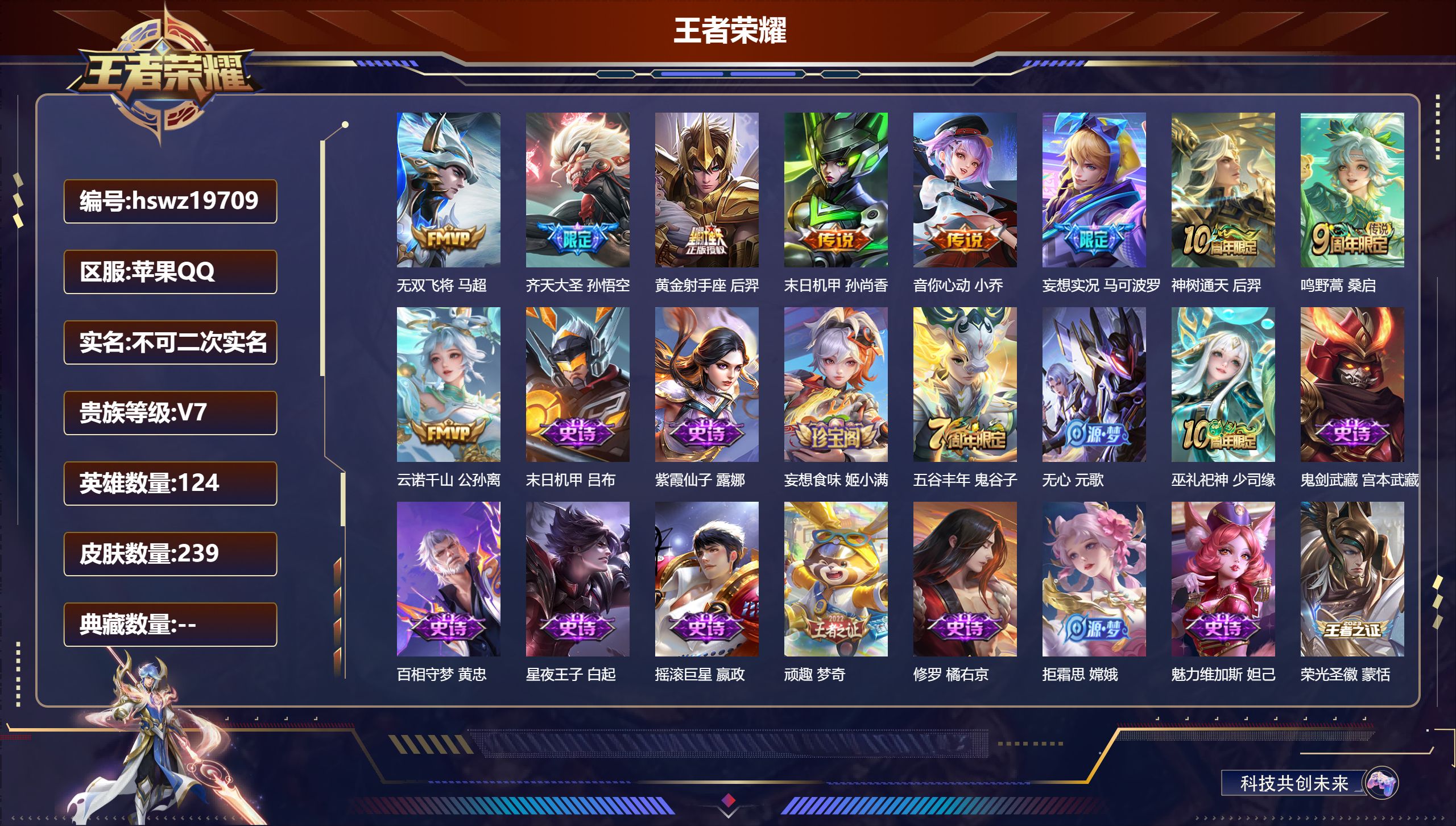 PX_2300102-Q/至尊星耀/239皮肤/124英雄/0典藏/0珍品无双/0无双/0珍品传说/9传说/59史诗/8稀有英雄 【9,传说皮肤】无双飞将,马超,齐天大圣,孙悟空,黄金射手座,后羿,末日机甲,孙尚香,音你心动,小乔,妄想实况,马可波罗,神树通天,后羿,鸣野蒿,桑启,云诺千山,公孙离, 【59,史诗皮肤】末日机甲,吕布,紫霞仙子,露娜,妄想食味,姬小满,五谷丰年,鬼谷子,无心,元歌,巫礼祀神,少司缘,鬼剑武藏,宫本武藏,百相守梦,黄忠,星夜王子,白起,摇滚巨星,嬴政,顽趣,梦奇,修罗,橘右京,拒霜思,嫦娥,魅力维加斯,妲己,荣光圣徽,蒙恬,女仆咖啡,妲己,晚萤,娜可露露,舞动绿茵,蔡文姬,鹰眼统帅,狄仁杰,纤云弄巧,云中君,金属风暴,墨子,特工魅影,百里守约,猫狗日记,孙策,原初追逐者,百里玄策,逐浪之夏,李元芳,未来纪元,赵云,雪豹·霜爪,百里守约,石田雨龙,后羿,鸭鸭历险记,刘禅,魔术师,狄仁杰,龙之律动,狂铁,唤灵魅影,貂蝉,皇家上将,赵云,至尊宝,孙悟空,功夫厨神,程咬金,梁祝,上官婉儿,圣诞恋歌,貂蝉,云间偶戏,元歌,水晶猎龙者,花木兰,圣诞狂欢,吕布,魅语,不知火舞,地狱岩魂,廉颇,茶境仙,孙膑,蔷薇恋人,孙尚香,冰雪圆舞曲,甄姬,青蛇,小乔,节奏热浪,阿轲,曙光守护者,铠,心灵骇客,安琪拉,乱世虎臣,张飞,琥珀纪元,伽罗,谪仙醉月,李白,绅士熊喵,刘禅,缤纷独角兽,小乔,百相守梦,百里守约,水果甜心,孙尚香,江河有灵,阿古朵,乘风破浪,夏侯惇,暗隐猎兽者,兰陵王, 【118,勇者皮肤】圆桌骑士,盾山,爱心护理,阿轲,沙漠行僧,达摩,大漠名商,沈梦溪,缤纷绘卷,张良,纽约教父,刘备,拳王,达摩,大发明家,达摩,龙舞盛年,沈梦溪,乐园追猎者,白起,功夫炙烤,廉颇,沉稳之力,孙尚香,海盐诗旅,桑启,幻泉雾影,海月,朔风刀,夏侯惇,醍醐杖,老夫子,汉昭烈帝,刘备,白色死神,白起,黄金武士,典韦,阴阳师,狄仁杰,次元突破,哪吒,古海寻踪,张良,戏梦巡演,空空儿,功夫老勺,老夫子,西部大镖客,牛魔,鲨炮海盗猫,沈梦溪,海滩派对,项羽,完美运算,后羿,万华元夜,狄仁杰,踏浪烽翎,莱西奥,演武夺筹,程咬金,野性能量,吕布,哥特玫瑰,露娜,守护之力,大乔,无双福将,程咬金,瓷语鉴心,露娜,原初探秘者,鬼谷子,潮玩探月行,猪八戒,天穹祈灯,鬼谷子,疑决卦,明世隐,化身博士,扁鹊,潮玩骑士王,亚瑟,五福同心,张飞,次元傲视,杨戬,星际陆战队,程咬金,幻乐之宴,鬼谷子,霸王丸,宫本武藏,虹云星官,明世隐,死亡骑士,亚瑟,浪漫序章,刘备,敏锐之力,李白,破局者,亚连,玩偶对对碰,安琪拉,掌控之力,诸葛亮,海滩丽影,钟无艳,落日弦歌,高渐离,忍·炎影,赵云,雪境奇遇,西施,唤灵魔甲,刘禅,万事如意,刘备,逐霄战戟,吕布,擒涛扼浪,裴擒虎,乓乓大师,鲁班大师,探海日志,鲁班大师,天使之翼,孙膑,雾都夜雨,干将莫邪,兔女郎,花木兰,龙腾万里,关羽,金庭之子,兰陵王,未来纪元,宫本武藏,千军破阵,苏烈,荣光之誓,亚瑟,花好人间,甄姬,万象初新,宫本武藏,聚星闪耀,钟无艳,御銮,盾山,时尚教父,姜子牙,春野之旅,钟无艳,秘密基地,刘禅,教廷特使,韩信,街头霸王,韩信,云中旅人,李元芳,妄想特派,李元芳,西部大镖客,孙悟空,少女阿狸,妲己,混沌棋,弈星,秘证寻踪,小乔,蔚蓝守将,蒙恬,春野闲踪,苏烈,命运加冕,露娜,小满鸭,姬小满,幻想奇妙夜,王昭君,灵野札记,张良,驱傩正仪,钟馗,潮玩士官长,雅典娜,鸭鸭历险记,沈梦溪,命运角斗场,狂铁,死霸装,白起,特工战影,狂铁,虚灵犬护,钟馗,漠中幻影,嫦娥,白执事,赵云,劲辣红锅,太乙真人,剑破天穹,刘邦,铁骨偃魂,典韦,苍林狼骑,苍,天穹之誓,姜子牙,魅影绮裳,影,访茗客,马超,星梦巡礼,姜子牙,谧流熔炉,太乙真人,群星魔术团,程咬金,暗都幽影,大司命,鹤鸣心笺,艾琳,锦麟游梦,庄周,逆浪荇歌,甄姬,百相守梦,老夫子,噬灭天穹,东皇太一, 【54,其他皮肤】金属狂潮,高渐离,圣殿之光,刘邦,潮流仙人,老夫子,棒球奇才,沈梦溪,龙域领主,铠,超能战警,曹操,花见巫女,伽罗,爱与和平,苏烈,未来旅行,孙膑,第七人偶,干将莫邪,万圣前夜,小乔,灼热之刃,李信,海之征途,孙策,木偶奇遇记,鲁班七号,精灵王,后羿,绯红之刃,露娜,冰刃幻境,镜,海军大将,周瑜,星航指挥官,诸葛亮,英喵野望,刘禅,午夜歌剧院,元歌,启蛰,司空震,霓裳曲,杨玉环,花间舞,公孙离,异域舞娘,貂蝉,街头旋风,裴擒虎,修竹墨客,上官婉儿,剑舞者,花木兰,维京掠夺者,苍,占星师,明世隐,归虚梦演,蒙犽,激情绿茵,马可波罗,归虚梦演,西施,画中游,桑启,尼罗河女神,女娲,归虚梦演,曜,华尔街大亨,程咬金,威尼斯狂欢,百里玄策,幸存者,马超,战争女神,雅典娜,创世神祝,盘古,特种部队,李元芳,绝影神枪,百里守约,森,瑶,孤猎,澜,加勒比小姐,虞姬,踏雪寻梅,弈星,秩序猎龙将,蒙恬,精准探案法,米莱狄,精灵公主,王昭君,赤焰之缨,云缨,露花倒影,嫦娥,地府判官,钟馗,西部大镖客,孙悟空, 【8,稀有英雄】嬴政,不知火舞,橘右京,夏洛特,娜可露露,韩信,艾琳,赵云, 营地ID:,