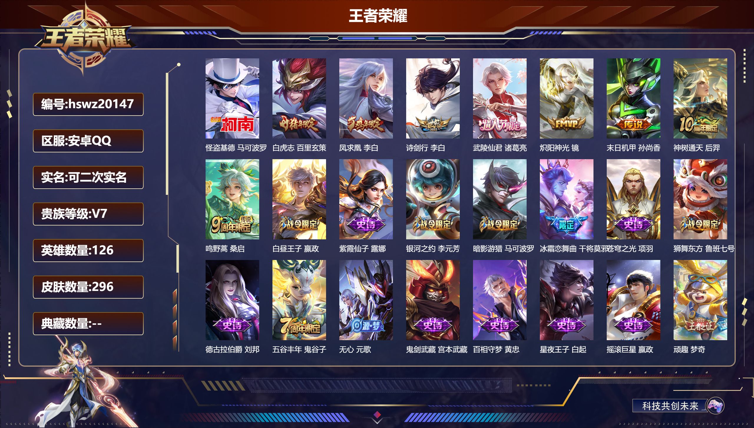 PX_2311954-Q/至尊星耀/296皮肤/126英雄/0典藏/0珍品无双/0无双/1珍品传说/8传说/83史诗/8稀有英雄 【1,珍品传说】怪盗基德,马可波罗, 【8,传说皮肤】白虎志,百里玄策,凤求凰,李白,诗剑行,李白,武陵仙君,诸葛亮,炽阳神光,镜,末日机甲,孙尚香,神树通天,后羿,鸣野蒿,桑启, 【83,史诗皮肤】白昼王子,嬴政,紫霞仙子,露娜,银河之约,李元芳,暗影游猎,马可波罗,冰霜恋舞曲,干将莫邪,苍穹之光,项羽,狮舞东方,鲁班七号,德古拉伯爵,刘邦,五谷丰年,鬼谷子,无心,元歌,鬼剑武藏,宫本武藏,百相守梦,黄忠,星夜王子,白起,摇滚巨星,嬴政,顽趣,梦奇,冰锋战神,关羽,修罗,橘右京,拒霜思,嫦娥,荣光圣徽,蒙恬,女仆咖啡,妲己,星界游侠,暃,晚萤,娜可露露,繁星吟游,蔡文姬,鹰眼统帅,狄仁杰,白晶晶,芈月,大圣娶亲,孙悟空,飞衡,韩信,李小龙,裴擒虎,纤云弄巧,云中君,驯魔猎人,兰陵王,如梦令,后羿,金属风暴,墨子,逐梦之影,韩信,特工魅影,百里守约,猫狗日记,孙策,原初追逐者,百里玄策,逐浪之夏,李元芳,奇幻香踪,扁鹊,未来纪元,赵云,朱雀志,百里守约,黎明之约,雅典娜,石田雨龙,后羿,优雅恋人,嬴政,魔术师,狄仁杰,龙之律动,狂铁,神威,马超,皇家上将,赵云,至尊宝,孙悟空,功夫厨神,程咬金,梁祝,上官婉儿,电玩·爆裂旋风,刘禅,圣诞恋歌,貂蝉,云间偶戏,元歌,水晶猎龙者,花木兰,破空之剑,亚连,怒海争锋,黄忠,圣诞狂欢,吕布,魅语,不知火舞,天狼绘梦者,上官婉儿,白龙吟,韩信,星界战将,牛魔,地狱岩魂,廉颇,茶境仙,孙膑,冰雪圆舞曲,甄姬,青蛇,小乔,默契交锋,花木兰,千年之狐,李白,节奏热浪,阿轲,超时空战士,钟无艳,曙光守护者,铠,万灵启世,女娲,心灵骇客,安琪拉,箭羽风息,伽罗,乱世虎臣,张飞,蓝屏警告,典韦,天狼狩猎者,裴擒虎,时之恋人,孙尚香,水果甜心,孙尚香,狂想玩偶喵,蒙犽,化蝶舞,阿轲,幽灵船长,曹操,乘风破浪,夏侯惇,暗隐猎兽者,兰陵王, 【133,勇者皮肤】时空谍影,海诺,圆桌骑士,盾山,烛龙,曹操,爱心护理,阿轲,缤纷绘卷,张良,纽约教父,刘备,拳王,达摩,大发明家,达摩,丁香结,小乔,功夫炙烤,廉颇,沉稳之力,孙尚香,海盐诗旅,桑启,幻泉雾影,海月,朔风刀,夏侯惇,醍醐杖,老夫子,朔望之晖,女娲,归虚梦演,孙膑,汉昭烈帝,刘备,白色死神,白起,黑桃队长,鲁班七号,黄金武士,典韦,落雪兰心,甄姬,御旌,牛魔,阴阳师,狄仁杰,炼金王,扁鹊,致命风华,阿轲,次元突破,哪吒,古海寻踪,张良,科学大爆炸,项羽,功夫老勺,老夫子,西部大镖客,牛魔,鲨炮海盗猫,沈梦溪,虎啸剑宗,刘邦,海滩派对,项羽,完美运算,后羿,万华元夜,狄仁杰,无尽征程,廉颇,演武夺筹,程咬金,红桃皇后,芈月,奇妙博物学,庄周,西部游侠,莱西奥,猎兽之王,吕布,野性能量,吕布,哥特玫瑰,露娜,守护之力,大乔,无双福将,程咬金,瓷语鉴心,露娜,原初探秘者,鬼谷子,星空之诺,沈梦溪,潮玩探月行,猪八戒,天穹祈灯,鬼谷子,疑决卦,明世隐,化身博士,扁鹊,潮玩骑士王,亚瑟,阿尔法小队,后羿,五福同心,张飞,次元傲视,杨戬,幻乐之宴,鬼谷子,东方不败,武则天,霸王丸,宫本武藏,虹云星官,明世隐,救世之瞳,扁鹊,潮玩骑兵,杨戬,赤莲之焰,周瑜,敏锐之力,李白,破局者,亚连,幽兰居士,张良,玩偶对对碰,安琪拉,掌控之力,诸葛亮,海滩丽影,钟无艳,忍·炎影,赵云,狰,白起,重明,芈月,炽热元素使,姜子牙,坚韧之力,苏烈,万事如意,刘备,擒涛扼浪,裴擒虎,乓乓大师,鲁班大师,死亡摇滚,高渐离,妖精王,孙膑,探海日志,鲁班大师,天使之翼,孙膑,雾都夜雨,干将莫邪,兔女郎,花木兰,龙腾万里,关羽,未来纪元,宫本武藏,花好人间,甄姬,万象初新,宫本武藏,潮玩造梦师,刘备,御銮,盾山,单词大作战,雅典娜,时尚教父,姜子牙,秘密基地,刘禅,穷奇,典韦,教廷特使,韩信,街头霸王,韩信,云中旅人,李元芳,妄想特派,李元芳,西部大镖客,孙悟空,凯尔特女王,虞姬,进击墨子号,墨子,少女阿狸,妲己,混沌棋,弈星,御霄,米莱狄,蔚蓝守将,蒙恬,春野闲踪,苏烈,布丁狗之约,阿古朵,暖冬·兔眠,嫦娥,幻想奇妙夜,王昭君,神迹守卫,钟馗,命运角斗场,狂铁,死霸装,白起,御狮,狂铁,白执事,赵云,饕餮,太乙真人,华丽摇滚,太乙真人,劲辣红锅,太乙真人,神迹守卫,孙悟空,剑破天穹,刘邦,铁骨偃魂,典韦,熔金海岸,周瑜,苍林狼骑,苍,天穹之誓,姜子牙,魅影绮裳,影,访茗客,马超,星梦巡礼,姜子牙,谧流熔炉,太乙真人,暗都幽影,大司命,鹤鸣心笺,艾琳,噬灭天穹,东皇太一,敬我三分,盘古,玫蓝誓约,戈娅,景韶洛都,明世隐, 【71,其他皮肤】伊势巫女,大乔,金属狂潮,高渐离,前尘,金蝉,圣殿之光,刘邦,芝加哥教父,黄忠,潮流仙人,老夫子,极冰防御线,盾山,龙域领主,铠,生化警戒,钟无艳,死神来了,曹操,超能战警,曹操,花见巫女,伽罗,爱与和平,苏烈,第七人偶,干将莫邪,灼热之刃,李信,熊喵少女,阿古朵,海之征途,孙策,木偶奇遇记,鲁班七号,福禄兄弟,鲁班七号,帝国元帅,项羽,精灵王,后羿,绯红之刃,露娜,冰刃幻境,镜,碧珀绯影,暃,海军大将,周瑜,星航指挥官,诸葛亮,魇语军师,司马懿,英喵野望,刘禅,午夜歌剧院,元歌,启蛰,司空震,隐刃,兰陵王,霓裳曲,杨玉环,花间舞,公孙离,异域舞娘,貂蝉,街头旋风,裴擒虎,归虚梦演,鲁班大师,东海龙王,东皇太一,修竹墨客,上官婉儿,剑舞者,花木兰,范海辛,李白,维京掠夺者,苍,占星师,明世隐,归虚梦演,蒙犽,激情绿茵,马可波罗,埃及法老,杨戬,归虚梦演,西施,阿摩司公爵,鬼谷子,年年有余,猪八戒,锦衣卫,狄仁杰,一千零一