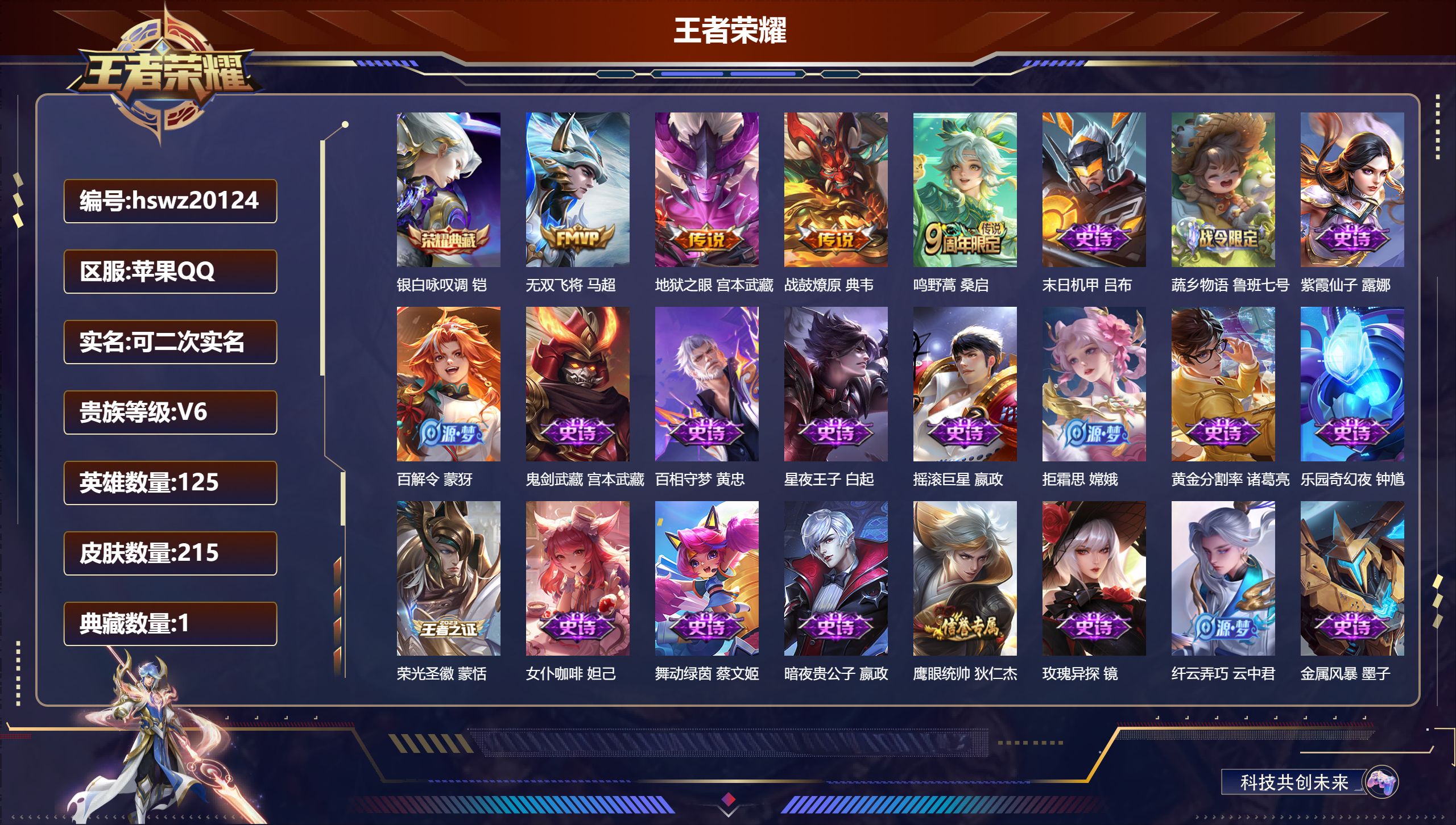PX_2311944-Q/至尊星耀/215皮肤/125英雄/1典藏/0珍品无双/0无双/0珍品传说/4传说/53史诗/7稀有英雄 【1,典藏皮肤】银白咏叹调,铠, 【4,传说皮肤】无双飞将,马超,地狱之眼,宫本武藏,战鼓燎原,典韦,鸣野蒿,桑启, 【53,史诗皮肤】末日机甲,吕布,蔬乡物语,鲁班七号,紫霞仙子,露娜,百解令,蒙犽,鬼剑武藏,宫本武藏,百相守梦,黄忠,星夜王子,白起,摇滚巨星,嬴政,拒霜思,嫦娥,黄金分割率,诸葛亮,乐园奇幻夜,钟馗,荣光圣徽,蒙恬,女仆咖啡,妲己,舞动绿茵,蔡文姬,暗夜贵公子,嬴政,鹰眼统帅,狄仁杰,玫瑰异探,镜,纤云弄巧,云中君,金属风暴,墨子,特工魅影,百里守约,猫狗日记,孙策,原初追逐者,百里玄策,逐浪之夏,李元芳,未来纪元,赵云,黎明之约,雅典娜,石田雨龙,后羿,鸭鸭历险记,刘禅,魔术师,狄仁杰,热力回旋,百里玄策,龙之律动,狂铁,皇家上将,赵云,冰冠公主,雅典娜,至尊宝,孙悟空,天才门将,刘禅,云间偶戏,元歌,水晶猎龙者,花木兰,魅语,不知火舞,蔷薇恋人,孙尚香,冰雪圆舞曲,甄姬,航海奇遇记,老夫子,千年之狐,李白,节奏热浪,阿轲,暗夜猫娘,阿轲,曙光守护者,铠,心灵骇客,安琪拉,百相守梦,周瑜,龙胆,赵云,绅士熊喵,刘禅,缤纷独角兽,小乔,水果甜心,孙尚香,幽灵船长,曹操,乘风破浪,夏侯惇,暗隐猎兽者,兰陵王, 【118,勇者皮肤】时空谍影,海诺,玲珑珍味,西施,圆桌骑士,盾山,烛龙,曹操,沙漠行僧,达摩,大漠名商,沈梦溪,暖冬絮语,程咬金,缤纷绘卷,张良,纽约教父,刘备,拳王,达摩,大发明家,达摩,龙舞盛年,沈梦溪,丁香结,小乔,功夫炙烤,廉颇,铁甲之心,典韦,沉稳之力,孙尚香,海盐诗旅,桑启,幻泉雾影,海月,醍醐杖,老夫子,归虚梦演,孙膑,白色死神,白起,黄金武士,典韦,王牌新星,海月,阴阳师,狄仁杰,次元突破,哪吒,古海寻踪,张良,功夫老勺,老夫子,西部大镖客,牛魔,鲨炮海盗猫,沈梦溪,海滩派对,项羽,完美运算,后羿,万华元夜,狄仁杰,克喵,鬼谷子,踏浪烽翎,莱西奥,演武夺筹,程咬金,奇妙博物学,庄周,西部游侠,莱西奥,野性能量,吕布,哥特玫瑰,露娜,守护之力,大乔,无双福将,程咬金,原初探秘者,鬼谷子,潮玩探月行,猪八戒,天穹祈灯,鬼谷子,疑决卦,明世隐,化身博士,扁鹊,星际陆战队,程咬金,幻乐之宴,鬼谷子,霸王丸,宫本武藏,虹云星官,明世隐,死亡骑士,亚瑟,浪漫序章,刘备,破局者,亚连,玩偶对对碰,安琪拉,掌控之力,诸葛亮,海滩丽影,钟无艳,忍·炎影,赵云,狰,白起,雪境奇遇,西施,重明,芈月,坚韧之力,苏烈,擒涛扼浪,裴擒虎,乓乓大师,鲁班大师,死亡摇滚,高渐离,探海日志,鲁班大师,天使之翼,孙膑,玩趣恶龙,高渐离,龙腾万里,关羽,金庭之子,兰陵王,千军破阵,苏烈,零食大作战,姬小满,花好人间,甄姬,万象初新,宫本武藏,聚星闪耀,钟无艳,御銮,盾山,秘密基地,刘禅,穷奇,典韦,教廷特使,韩信,街头霸王,韩信,云中旅人,李元芳,妄想特派,李元芳,西部大镖客,孙悟空,神迹守卫,墨子,凯尔特女王,虞姬,少女阿狸,妲己,混沌棋,弈星,御霄,米莱狄,春野闲踪,苏烈,契约魔法,米莱狄,布丁狗之约,阿古朵,命运加冕,露娜,小满鸭,姬小满,幻想奇妙夜,王昭君,灵野札记,张良,驱傩正仪,钟馗,鸭鸭历险记,沈梦溪,命运角斗场,狂铁,死霸装,白起,特工战影,狂铁,虚灵犬护,钟馗,御狮,狂铁,白执事,赵云,饕餮,太乙真人,剑破天穹,刘邦,苍威无极,项羽,铁骨偃魂,典韦,苍林狼骑,苍,天穹之誓,姜子牙,星梦巡礼,姜子牙,谧流熔炉,太乙真人,暗都幽影,大司命,鹤鸣心笺,艾琳,锦麟游梦,庄周,逆浪荇歌,甄姬,百相守梦,孙策,噬灭天穹,东皇太一,玫蓝誓约,戈娅,景韶洛都,明世隐, 【40,其他皮肤】伊势巫女,大乔,前尘,金蝉,战争骑士,夏侯惇,花见巫女,伽罗,灼热之刃,李信,熊喵少女,阿古朵,木偶奇遇记,鲁班七号,精灵王,后羿,绯红之刃,露娜,冰刃幻境,镜,碧珀绯影,暃,海军大将,周瑜,魇语军师,司马懿,午夜歌剧院,元歌,启蛰,司空震,隐刃,兰陵王,街头旋风,裴擒虎,归虚梦演,鲁班大师,东海龙王,东皇太一,修竹墨客,上官婉儿,剑舞者,花木兰,范海辛,李白,维京掠夺者,苍,激情绿茵,马可波罗,埃及法老,杨戬,归虚梦演,西施,归虚梦演,曜,威尼斯狂欢,百里玄策,幸存者,马超,荷鲁斯之眼,云中君,创世神祝,盘古,特种部队,李元芳,绝影神枪,百里守约,孤猎,澜,秩序猎龙将,蒙恬,精灵公主,王昭君,赤焰之缨,云缨,露花倒影,嫦娥,地府判官,钟馗,西部大镖客,孙悟空, 【7,稀有英雄】不知火舞,橘右京,夏洛特,娜可露露,韩信,艾琳,赵云, 营地ID:,,