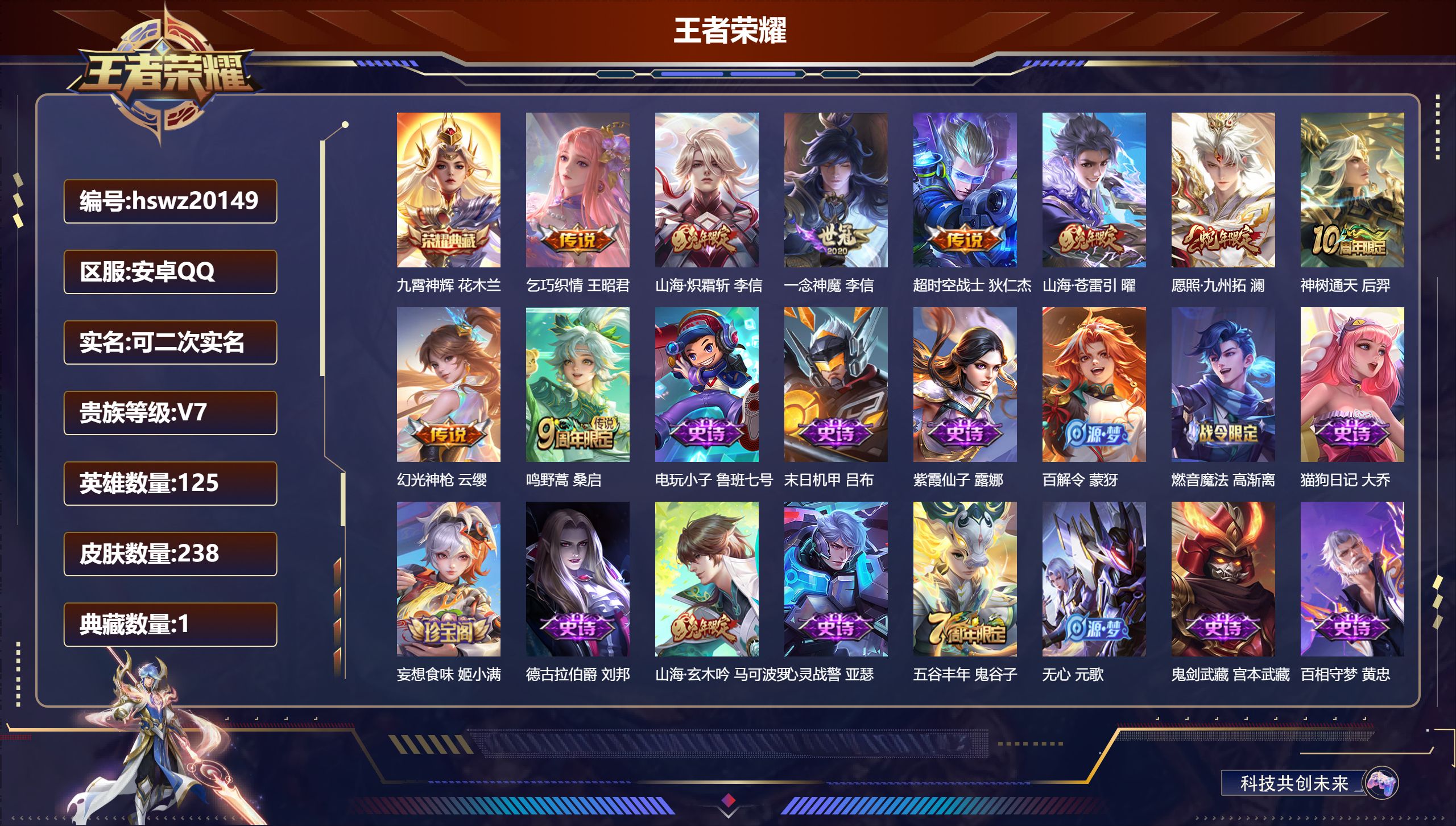 PX_2300062-Q/荣耀王者/91皮肤/115英雄/1典藏/0珍品无双/0无双/0珍品传说/5传说/20史诗/7稀有英雄 【1,典藏皮肤】全息碎影,孙悟空, 【5,传说皮肤】逐花归海,澜,云鹰飞将,曜,诗剑行,李白,怒海麟威,吕布,神树通天,后羿, 【20,史诗皮肤】电玩小子,鲁班七号,德古拉伯爵,刘邦,五谷丰年,鬼谷子,遇见飞天,杨玉环,魅力维加斯,妲己,女仆咖啡,妲己,鹰眼统帅,狄仁杰,孙行者,孙悟空,李小龙,裴擒虎,黎明之约,雅典娜,魔术师,狄仁杰,龙之律动,狂铁,皇家上将,赵云,圣诞恋歌,貂蝉,水晶猎龙者,花木兰,蔷薇恋人,孙尚香,千年之狐,李白,乱世虎臣,张飞,水果甜心,孙尚香,江河有灵,阿古朵, 【50,勇者皮肤】沙漠行僧,达摩,大漠名商,沈梦溪,大发明家,达摩,功夫炙烤,廉颇,海盐诗旅,桑启,幻泉雾影,海月,醍醐杖,老夫子,汉昭烈帝,刘备,阴阳师,狄仁杰,次元突破,哪吒,古海寻踪,张良,功夫老勺,老夫子,海滩派对,项羽,万华元夜,狄仁杰,克喵,鬼谷子,踏浪烽翎,莱西奥,演武夺筹,程咬金,西部游侠,莱西奥,野性能量,吕布,无双福将,程咬金,原初探秘者,鬼谷子,潮玩探月行,猪八戒,天穹祈灯,鬼谷子,疑决卦,明世隐,次元傲视,杨戬,霸王丸,宫本武藏,死亡骑士,亚瑟,玩偶对对碰,安琪拉,海滩丽影,钟无艳,圣弓游侠,后羿,探海日志,鲁班大师,金庭之子,兰陵王,未来纪元,宫本武藏,千军破阵,苏烈,荣光之誓,亚瑟,聚星闪耀,钟无艳,秘密基地,刘禅,教廷特使,韩信,云中旅人,李元芳,妄想特派,李元芳,西部大镖客,孙悟空,少女阿狸,妲己,混沌棋,弈星,布丁狗之约,阿古朵,幻想奇妙夜,王昭君,灵野札记,张良,虚灵犬护,钟馗,星梦巡礼,姜子牙,鹤鸣心笺,艾琳,逆浪荇歌,甄姬, 【16,其他皮肤】金属狂潮,高渐离,芝加哥教父,黄忠,潮流仙人,老夫子,棒球奇才,沈梦溪,龙域领主,铠,精灵王,后羿,绯红之刃,露娜,碧珀绯影,暃,埃及法老,杨戬,尼罗河女神,女娲,威尼斯狂欢,百里玄策,战争女神,雅典娜,加勒比小姐,虞姬,赤焰之缨,云缨,天启骑士,关羽,西部大镖客,孙悟空, 【7,稀有英雄】不知火舞,橘右京,夏洛特,娜可露露,韩信,艾琳,赵云, 营地ID:,