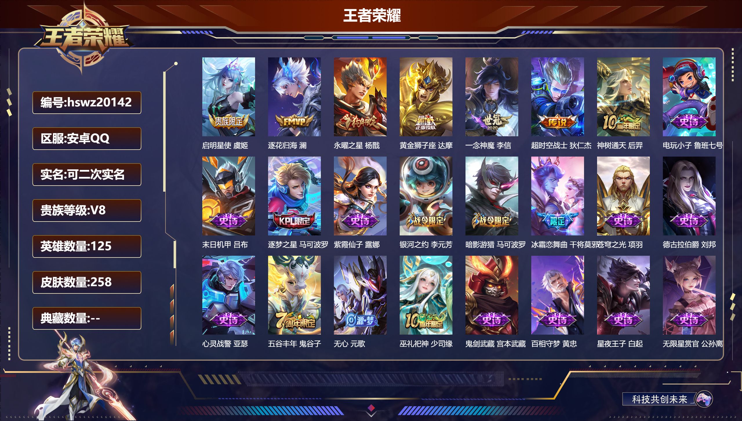 PX_2299807-Q/尊贵铂金/252皮肤/124英雄/2典藏/0珍品无双/1无双/0珍品传说/9传说/58史诗/8稀有英雄 【2,典藏皮肤】全息碎影,孙悟空,杀手不太冷,孙尚香, 【1,无双皮肤】青丘·九尾,妲己, 【9,传说皮肤】启明星使,虞姬,时之祈愿,瑶,云鹰飞将,曜,追逃游戏,亚瑟,追逃游戏,安琪拉,猫影幻舞,貂蝉,默契交锋,兰陵王,淬星耀世,赵云,神树通天,后羿, 【58,史诗皮肤】时之奇旅,安琪拉,白昼王子,嬴政,高山流水,庄周,苍穹之光,项羽,狮舞东方,鲁班七号,德古拉伯爵,刘邦,心灵战警,亚瑟,五谷丰年,鬼谷子,无心,元歌,鬼剑武藏,宫本武藏,迷踪丽影,阿轲,无限星赏官,公孙离,修罗,橘右京,黄金分割率,诸葛亮,偶像歌手,王昭君,女仆咖啡,妲己,星界游侠,暃,遇见神鹿,瑶,繁星吟游,蔡文姬,鹰眼统帅,狄仁杰,孙行者,孙悟空,李小龙,裴擒虎,纤云弄巧,云中君,金属风暴,墨子,猫狗日记,孙策,逐浪之夏,李元芳,奇幻香踪,扁鹊,时之祈愿,云中君,未来纪元,赵云,优雅恋人,嬴政,魔术师,狄仁杰,唤灵魅影,貂蝉,皇家上将,赵云,至尊宝,孙悟空,梁祝,上官婉儿,天才门将,刘禅,圣诞恋歌,貂蝉,涂山容容,公孙离,圣诞狂欢,吕布,白龙吟,韩信,百相守梦,刘备,地狱岩魂,廉颇,蔷薇恋人,孙尚香,冰雪圆舞曲,甄姬,默契交锋,花木兰,暗夜猫娘,阿轲,女儿国国王,甄姬,青龙志,铠,心灵骇客,安琪拉,匿光破解者,沈梦溪,玄武志,苏烈,乱世虎臣,张飞,缤纷独角兽,小乔,蓝屏警告,典韦,真爱魔法,干将莫邪,水果甜心,孙尚香,乘风破浪,夏侯惇,暗隐猎兽者,兰陵王, 【107,勇者皮肤】烛龙,曹操,爱心护理,阿轲,太极少年,赵怀真,沙漠行僧,达摩,大漠名商,沈梦溪,缤纷绘卷,张良,纽约教父,刘备,拳王,达摩,大发明家,达摩,龙舞盛年,沈梦溪,乐园追猎者,白起,丁香结,小乔,功夫炙烤,廉颇,铁甲之心,典韦,沉稳之力,孙尚香,海盐诗旅,桑启,幻泉雾影,海月,朔风刀,夏侯惇,醍醐杖,老夫子,朔望之晖,女娲,归虚梦演,孙膑,汉昭烈帝,刘备,白色死神,白起,黄金武士,典韦,夺宝奇兵,刘邦,御旌,牛魔,阴阳师,狄仁杰,致命风华,阿轲,次元突破,哪吒,古海寻踪,张良,功夫老勺,老夫子,西部大镖客,牛魔,鲨炮海盗猫,沈梦溪,虎啸剑宗,刘邦,海滩派对,项羽,完美运算,后羿,万华元夜,狄仁杰,无尽征程,廉颇,制霸全明星,牛魔,演武夺筹,程咬金,奇妙博物学,庄周,西部游侠,莱西奥,猎兽之王,吕布,哥特玫瑰,露娜,守护之力,大乔,无双福将,程咬金,瓷语鉴心,露娜,原初探秘者,鬼谷子,潮玩探月行,猪八戒,天穹祈灯,鬼谷子,疑决卦,明世隐,化身博士,扁鹊,阿尔法小队,后羿,五福同心,张飞,次元傲视,杨戬,幻乐之宴,鬼谷子,霸王丸,宫本武藏,虹云星官,明世隐,救世之瞳,扁鹊,潮玩骑兵,杨戬,死亡骑士,亚瑟,敏锐之力,李白,危途狂花,戈娅,玩偶对对碰,安琪拉,掌控之力,诸葛亮,海滩丽影,钟无艳,圣弓游侠,后羿,忍·炎影,赵云,狰,白起,重明,芈月,坚韧之力,苏烈,万事如意,刘备,擒涛扼浪,裴擒虎,乓乓大师,鲁班大师,天使之翼,孙膑,兔女郎,花木兰,龙腾万里,关羽,金庭之子,兰陵王,未来纪元,宫本武藏,千军破阵,苏烈,花好人间,甄姬,万象初新,宫本武藏,御銮,盾山,时尚教父,姜子牙,秘密基地,刘禅,穷奇,典韦,教廷特使,韩信,街头霸王,韩信,云中旅人,李元芳,西部大镖客,孙悟空,紫罗兰之誓,妲己,凯尔特女王,虞姬,少女阿狸,妲己,混沌棋,弈星,御霄,米莱狄,暖冬·兔眠,嫦娥,驱傩正仪,钟馗,神迹守卫,钟馗,命运角斗场,狂铁,特工战影,狂铁,御狮,狂铁,饕餮,太乙真人,劲辣红锅,太乙真人,星梦巡礼,姜子牙,谧流熔炉,太乙真人,鹤鸣心笺,艾琳,逆浪荇歌,甄姬, 【75,其他皮肤】伊势巫女,大乔,金属狂潮,高渐离,前尘,金蝉,战争骑士,夏侯惇,圣殿之光,刘邦,芝加哥教父,黄忠,潮流仙人,老夫子,三太子,哪吒,棒球奇才,沈梦溪,极冰防御线,盾山,龙域领主,铠,生化警戒,钟无艳,超能战警,曹操,花见巫女,伽罗,爱与和平,苏烈,未来旅行,孙膑,第七人偶,干将莫邪,万圣前夜,小乔,灼热之刃,李信,熊喵少女,阿古朵,海之征途,孙策,木偶奇遇记,鲁班七号,福禄兄弟,鲁班七号,帝国元帅,项羽,精灵王,后羿,绯红之刃,露娜,冰刃幻境,镜,碧珀绯影,暃,海军大将,周瑜,星航指挥官,诸葛亮,魇语军师,司马懿,英喵野望,刘禅,午夜歌剧院,元歌,启蛰,司空震,隐刃,兰陵王,霓裳曲,杨玉环,花间舞,公孙离,异域舞娘,貂蝉,街头旋风,裴擒虎,归虚梦演,鲁班大师,东海龙王,东皇太一,剑舞者,花木兰,范海辛,李白,维京掠夺者,苍,占星师,明世隐,归虚梦演,蒙犽,激情绿茵,马可波罗,埃及法老,杨戬,归虚梦演,西施,画中游,桑启,年年有余,猪八戒,锦衣卫,狄仁杰,一千零一夜,张良,归虚梦演,曜,威尼斯狂欢,百里玄策,幸存者,马超,战争女神,雅典娜,荷鲁斯之眼,云中君,创世神祝,盘古,特种部队,李元芳,绝影神枪,百里守约,蔷薇王座,蔡文姬,森,瑶,孤猎,澜,加勒比小姐,虞姬,踏雪寻梅,弈星,秩序猎龙将,蒙恬,精准探案法,米莱狄,精灵公主,王昭君,赤焰之缨,云缨,露花倒影,嫦娥,地府判官,钟馗,美梦成真,梦奇,天启骑士,关羽,西部大镖客,孙悟空, 【8,稀有英雄】嬴政,不知火舞,橘右京,夏洛特,娜可露露,韩信,艾琳,赵云, 营地ID:,