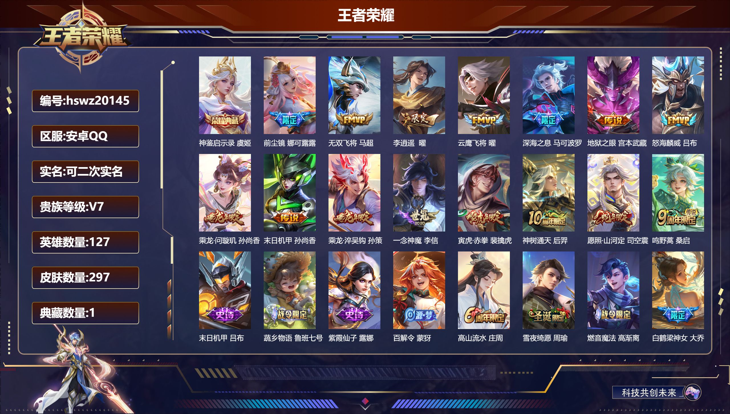 PX_2311935-Q/荣耀王者/297皮肤/127英雄/1典藏/0珍品无双/0无双/0珍品传说/15传说/93史诗/9稀有英雄 【1,典藏皮肤】神鉴启示录,虞姬, 【15,传说皮肤】前尘镜,娜可露露,无双飞将,马超,李逍遥,,曜,云鹰飞将,曜,深海之息,马可波罗,地狱之眼,宫本武藏,怒海麟威,吕布,乘龙·问璇玑,孙尚香,末日机甲,孙尚香,乘龙·淬吴钩,孙策,一念神魔,李信,寅虎·赤拳,裴擒虎,神树通天,后羿,愿照·山河定,司空震,鸣野蒿,桑启, 【93,史诗皮肤】末日机甲,吕布,蔬乡物语,鲁班七号,紫霞仙子,露娜,百解令,蒙犽,高山流水,庄周,雪夜绮愿,周瑜,燃音魔法,高渐离,白鹤梁神女,大乔,天秀·启明,杨戬,猫狗日记,大乔,妄想食味,姬小满,德古拉伯爵,刘邦,山海·玄木吟,马可波罗,心灵战警,亚瑟,五谷丰年,鬼谷子,无心,元歌,巫礼祀神,少司缘,鬼剑武藏,宫本武藏,百相守梦,黄忠,星夜王子,白起,地狱燃心,司空震,摇滚巨星,嬴政,电玩高手,狂铁,顽趣,梦奇,修罗,橘右京,拒霜思,嫦娥,魅力维加斯,妲己,黄金分割率,诸葛亮,偶像歌手,王昭君,荣光圣徽,蒙恬,女仆咖啡,妲己,赏金猎手,澜,星界游侠,暃,晚萤,娜可露露,猪悟能,猪八戒,舞动绿茵,蔡文姬,暗夜贵公子,嬴政,鹰眼统帅,狄仁杰,玫瑰异探,镜,纤云弄巧,云中君,龙骑士,墨子,金属风暴,墨子,傲雪梅枪,韩信,猫狗日记,孙策,原初追逐者,百里玄策,逐浪之夏,李元芳,时之祈愿,云中君,未来纪元,赵云,灵蛊蚀心,扁鹊,黎明之约,雅典娜,魔术师,狄仁杰,布丁狗之誓,亚瑟,龙之律动,狂铁,顽岩魄,蒙犽,皇家上将,赵云,冰冠公主,雅典娜,功夫厨神,程咬金,东方月初,大司命,天才门将,刘禅,圣诞恋歌,貂蝉,水晶猎龙者,花木兰,涂山容容,公孙离,怒海争锋,黄忠,圣诞狂欢,吕布,器灵·浮梦炉,赵怀真,罗小黑战记,百里玄策,百相守梦,刘备,星界战将,牛魔,地狱岩魂,廉颇,冰雪圆舞曲,甄姬,火炮绅士,黄忠,月团寄思,沈梦溪,航海奇遇记,老夫子,雪上飞焰,哪吒,千年之狐,李白,节奏热浪,阿轲,超时空战士,钟无艳,游园惊梦,甄姬,曙光守护者,铠,万灵启世,女娲,箭羽风息,伽罗,乱世虎臣,张飞,吟游魔法,明世隐,王者之锤,钟无艳,绅士熊喵,刘禅,缤纷独角兽,小乔,陌上桑,艾琳,真爱魔法,干将莫邪,水果甜心,孙尚香,江河有灵,阿古朵,幽灵船长,曹操,乘风破浪,夏侯惇,暗隐猎兽者,兰陵王, 【133,勇者皮肤】时空谍影,海诺,圆桌骑士,盾山,太极少年,赵怀真,星际陆战队,达摩,沙漠行僧,达摩,大漠名商,沈梦溪,缤纷绘卷,张良,纽约教父,刘备,拳王,达摩,大发明家,达摩,龙舞盛年,沈梦溪,乐园追猎者,白起,丁香结,小乔,功夫炙烤,廉颇,铁甲之心,典韦,沉稳之力,孙尚香,幻夜卜梦,芈月,海盐诗旅,桑启,幻泉雾影,海月,归虚梦演,孙膑,汉昭烈帝,刘备,白色死神,白起,黄金武士,典韦,王牌新星,海月,落雪兰心,甄姬,阴阳师,狄仁杰,次元突破,哪吒,古海寻踪,张良,牛运亨通,牛魔,功夫老勺,老夫子,西部大镖客,牛魔,鲨炮海盗猫,沈梦溪,虎啸剑宗,刘邦,海滩派对,项羽,踏浪烽翎,莱西奥,演武夺筹,程咬金,西部游侠,莱西奥,无双福将,程咬金,潮玩探月行,猪八戒,鸿运当头,亚瑟,天穹祈灯,鬼谷子,化身博士,扁鹊,五福同心,张飞,夜都怪侠,白起,金色潮汐,朵莉亚,次元傲视,杨戬,星际陆战队,程咬金,幻乐之宴,鬼谷子,霸王丸,宫本武藏,虹云星官,明世隐,死亡骑士,亚瑟,浪漫序章,刘备,敏锐之力,李白,危途狂花,戈娅,胡桃狂想曲,蒙犽,破局者,亚连,玩偶对对碰,安琪拉,掌控之力,诸葛亮,海滩丽影,钟无艳,圣弓游侠,后羿,忍·炎影,赵云,雪境奇遇,西施,炽热元素使,姜子牙,坚韧之力,苏烈,唤灵魔甲,刘禅,万事如意,刘备,逐霄战戟,吕布,擒涛扼浪,裴擒虎,乓乓大师,鲁班大师,探海日志,鲁班大师,天使之翼,孙膑,雾都夜雨,干将莫邪,玩趣恶龙,高渐离,兔女郎,花木兰,龙腾万里,关羽,流音漫舞,艾琳,金庭之子,兰陵王,未来纪元,宫本武藏,千军破阵,苏烈,零食大作战,姬小满,荣光之誓,亚瑟,花好人间,甄姬,万象初新,宫本武藏,聚星闪耀,钟无艳,潮玩造梦师,刘备,秘密基地,刘禅,教廷特使,韩信,街头霸王,韩信,云中旅人,李元芳,妄想特派,李元芳,西部大镖客,孙悟空,紫罗兰之誓,妲己,神迹守卫,墨子,进击墨子号,墨子,蔬乡物语,李元芳,少女阿狸,妲己,灵卜魔法,妲己,蔚蓝守将,蒙恬,春野闲踪,苏烈,契约魔法,米莱狄,布丁狗之约,阿古朵,暖冬·兔眠,嫦娥,命运加冕,露娜,午后时光,王昭君,小满鸭,姬小满,灵野札记,张良,驱傩正仪,钟馗,潮玩士官长,雅典娜,命运角斗场,狂铁,死霸装,白起,特工战影,狂铁,虚灵犬护,钟馗,漠中幻影,嫦娥,劲辣红锅,太乙真人,剑破天穹,刘邦,铁骨偃魂,典韦,熔金海岸,周瑜,苍林狼骑,苍,天穹之誓,姜子牙,星梦巡礼,姜子牙,谧流熔炉,太乙真人,群星魔术团,程咬金,经纬探寻者,盘古,暗都幽影,大司命,鹤鸣心笺,艾琳,锦麟游梦,庄周,云械蓝图,云中君,逆浪荇歌,甄姬,噬灭天穹,东皇太一,动物派对,亚瑟,敬我三分,盘古,玫蓝誓约,戈娅,景韶洛都,明世隐, 【54,其他皮肤】伊势巫女,大乔,前尘,金蝉,圣殿之光,刘邦,三太子,哪吒,极冰防御线,盾山,龙域领主,铠,生化警戒,钟无艳,死神来了,曹操,花见巫女,伽罗,万圣前夜,小乔,灼热之刃,李信,熊喵少女,阿古朵,海之征途,孙策,福禄兄弟,鲁班七号,绯红之刃,露娜,冰刃幻境,镜,碧珀绯影,暃,海军大将,周瑜,魇语军师,司马懿,午夜歌剧院,元歌,启蛰,司空震,隐刃,兰陵王,霓裳曲,杨玉环,花间舞,公孙离,街头旋风,裴擒虎,归虚梦演,鲁班大师,修竹墨客,上官婉