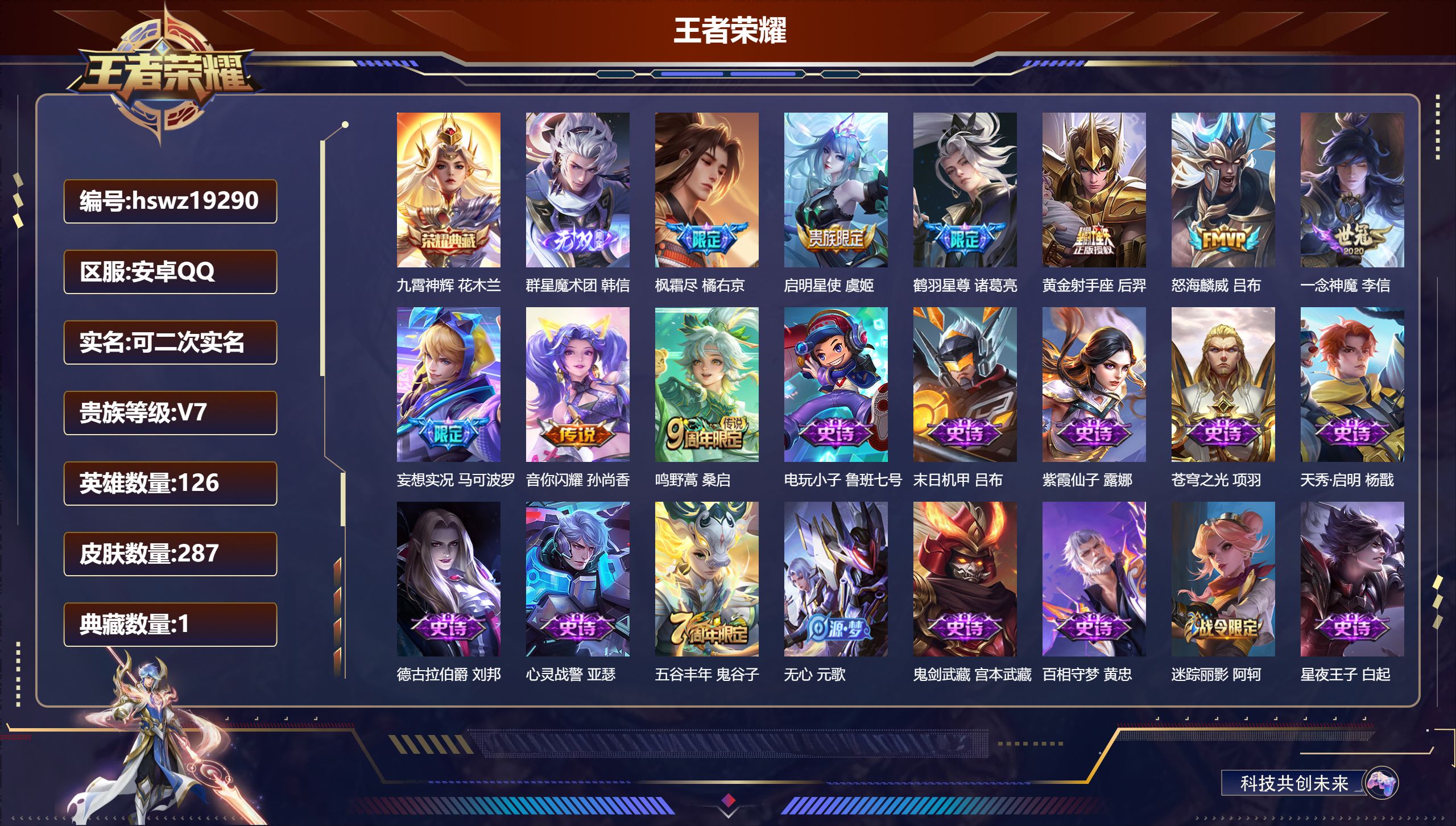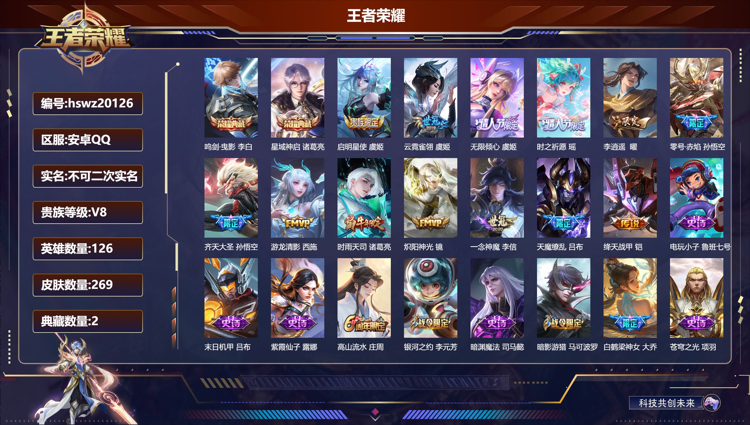 PX_2310554-Q/荣耀王者/287皮肤/126英雄/1典藏/0珍品无双/1无双/0珍品传说/9传说/77史诗/8稀有英雄 【1,典藏皮肤】九霄神辉,花木兰, 【1,无双皮肤】群星魔术团,韩信, 【9,传说皮肤】枫霜尽,橘右京,启明星使,虞姬,鹤羽星尊,诸葛亮,黄金射手座,后羿,怒海麟威,吕布,一念神魔,李信,妄想实况,马可波罗,音你闪耀,孙尚香,鸣野蒿,桑启, 【77,史诗皮肤】电玩小子,鲁班七号,末日机甲,吕布,紫霞仙子,露娜,苍穹之光,项羽,天秀·启明,杨戬,德古拉伯爵,刘邦,心灵战警,亚瑟,五谷丰年,鬼谷子,无心,元歌,鬼剑武藏,宫本武藏,百相守梦,黄忠,迷踪丽影,阿轲,星夜王子,白起,地狱燃心,司空震,摇滚巨星,嬴政,顽趣,梦奇,修罗,橘右京,拒霜思,嫦娥,魅力维加斯,妲己,偶像歌手,王昭君,荣光圣徽,蒙恬,女仆咖啡,妲己,星界游侠,暃,遇见神鹿,瑶,舞动绿茵,蔡文姬,繁星吟游,蔡文姬,鹰眼统帅,狄仁杰,大圣娶亲,孙悟空,孙行者,孙悟空,傩神司,兰陵王,光弋星穹,莱西奥,纤云弄巧,云中君,金属风暴,墨子,傲雪梅枪,韩信,特工魅影,百里守约,猫狗日记,孙策,原初追逐者,百里玄策,逐浪之夏,李元芳,奇幻香踪,扁鹊,黎明之约,雅典娜,石田雨龙,后羿,驭风魔法,戈娅,魔术师,狄仁杰,龙之律动,狂铁,唤灵魅影,貂蝉,皇家上将,赵云,冰冠公主,雅典娜,至尊宝,孙悟空,功夫厨神,程咬金,梁祝,上官婉儿,电玩·爆裂旋风,刘禅,天才门将,刘禅,圣诞恋歌,貂蝉,云间偶戏,元歌,水晶猎龙者,花木兰,青焰无极,镜,罗小黑战记,百里玄策,白龙吟,韩信,星界战将,牛魔,蔷薇恋人,孙尚香,冰雪圆舞曲,甄姬,航海奇遇记,老夫子,千年之狐,李白,节奏热浪,阿轲,梦圆繁星,盾山,曙光守护者,铠,万灵启世,女娲,乱世虎臣,张飞,百相守梦,周瑜,吟游魔法,明世隐,绅士熊喵,刘禅,时之恋人,孙尚香,水果甜心,孙尚香,江河有灵,阿古朵,幽灵船长,曹操,乘风破浪,夏侯惇,暗隐猎兽者,兰陵王, 【143,勇者皮肤】时空谍影,海诺,玲珑珍味,西施,胡桃夹子,干将莫邪,圆桌骑士,盾山,爱心护理,阿轲,太极少年,赵怀真,沙漠行僧,达摩,大漠名商,沈梦溪,暖冬絮语,程咬金,缤纷绘卷,张良,纽约教父,刘备,拳王,达摩,大发明家,达摩,龙舞盛年,沈梦溪,乐园追猎者,白起,丁香结,小乔,功夫炙烤,廉颇,铁甲之心,典韦,沉稳之力,孙尚香,海盐诗旅,桑启,幻泉雾影,海月,朔风刀,夏侯惇,醍醐杖,老夫子,归虚梦演,孙膑,白色死神,白起,黑桃队长,鲁班七号,黄金武士,典韦,王牌新星,海月,夺宝奇兵,刘邦,阴阳师,狄仁杰,次元突破,哪吒,古海寻踪,张良,牛运亨通,牛魔,科学大爆炸,项羽,戏梦巡演,空空儿,功夫老勺,老夫子,西部大镖客,牛魔,鲨炮海盗猫,沈梦溪,海滩派对,项羽,万华元夜,狄仁杰,无尽征程,廉颇,克喵,鬼谷子,踏浪烽翎,莱西奥,演武夺筹,程咬金,红桃皇后,芈月,奇妙博物学,庄周,西部游侠,莱西奥,美猴王,孙悟空,野性能量,吕布,哥特玫瑰,露娜,守护之力,大乔,无双福将,程咬金,瓷语鉴心,露娜,原初探秘者,鬼谷子,潮玩探月行,猪八戒,天穹祈灯,鬼谷子,决胜大满贯,曹操,疑决卦,明世隐,化身博士,扁鹊,阿尔法小队,后羿,无尽旅途,扁鹊,五福同心,张飞,夜都怪侠,白起,次元傲视,杨戬,星际陆战队,程咬金,幻乐之宴,鬼谷子,东方不败,武则天,霸王丸,宫本武藏,虹云星官,明世隐,潮玩牛仔,马可波罗,救世之瞳,扁鹊,潮玩骑兵,杨戬,死亡骑士,亚瑟,敏锐之力,李白,危途狂花,戈娅,破局者,亚连,玩偶对对碰,安琪拉,掌控之力,诸葛亮,海滩丽影,钟无艳,忍·炎影,赵云,雪境奇遇,西施,坚韧之力,苏烈,唤灵魔甲,刘禅,万事如意,刘备,擒涛扼浪,裴擒虎,乓乓大师,鲁班大师,探海日志,鲁班大师,雾都夜雨,干将莫邪,兔女郎,花木兰,龙腾万里,关羽,流音漫舞,艾琳,金庭之子,兰陵王,未来纪元,宫本武藏,罗小黑战记,哪吒,千军破阵,苏烈,往忆晖光,明世隐,零食大作战,姬小满,荣光之誓,亚瑟,花好人间,甄姬,万象初新,宫本武藏,聚星闪耀,钟无艳,时尚教父,姜子牙,秘密基地,刘禅,教廷特使,韩信,街头霸王,韩信,云中旅人,李元芳,妄想特派,李元芳,西部大镖客,孙悟空,神迹守卫,墨子,混沌棋,弈星,蔚蓝守将,蒙恬,契约魔法,米莱狄,布丁狗之约,阿古朵,暖冬·兔眠,嫦娥,命运加冕,露娜,灵野札记,张良,驱傩正仪,钟馗,命运角斗场,狂铁,特工战影,狂铁,白执事,赵云,劲辣红锅,太乙真人,罗小黑战记,张良,剑破天穹,刘邦,苍威无极,项羽,铁骨偃魂,典韦,熔金海岸,周瑜,苍林狼骑,苍,天穹之誓,姜子牙,长夏之忆,貂蝉,星梦巡礼,姜子牙,谧流熔炉,太乙真人,群星魔术团,程咬金,经纬探寻者,盘古,暗都幽影,大司命,夏日便利店,虞姬,鹤鸣心笺,艾琳,锦麟游梦,庄周,逆浪荇歌,甄姬,百相守梦,孙策,噬灭天穹,东皇太一,灵卦秘语,少司缘,敬我三分,盘古,玫蓝誓约,戈娅, 【56,其他皮肤】伊势巫女,大乔,前尘,金蝉,战争骑士,夏侯惇,圣殿之光,刘邦,芝加哥教父,黄忠,潮流仙人,老夫子,三太子,哪吒,棒球奇才,沈梦溪,极冰防御线,盾山,龙域领主,铠,生化警戒,钟无艳,超能战警,曹操,花见巫女,伽罗,爱与和平,苏烈,第七人偶,干将莫邪,万圣前夜,小乔,灼热之刃,李信,熊喵少女,阿古朵,海之征途,孙策,福禄兄弟,鲁班七号,绯红之刃,露娜,魇语军师,司马懿,午夜歌剧院,元歌,启蛰,司空震,隐刃,兰陵王,霓裳曲,杨玉环,异域舞娘,貂蝉,街头旋风,裴擒虎,范海辛,李白,维京掠夺者,苍,占星师,明世隐,激情绿茵,马可波罗,阿摩司公爵,鬼谷子,年年有余,猪八戒,锦衣卫,狄仁杰,一千零一夜,张良,归虚梦演,曜,幸存者,马