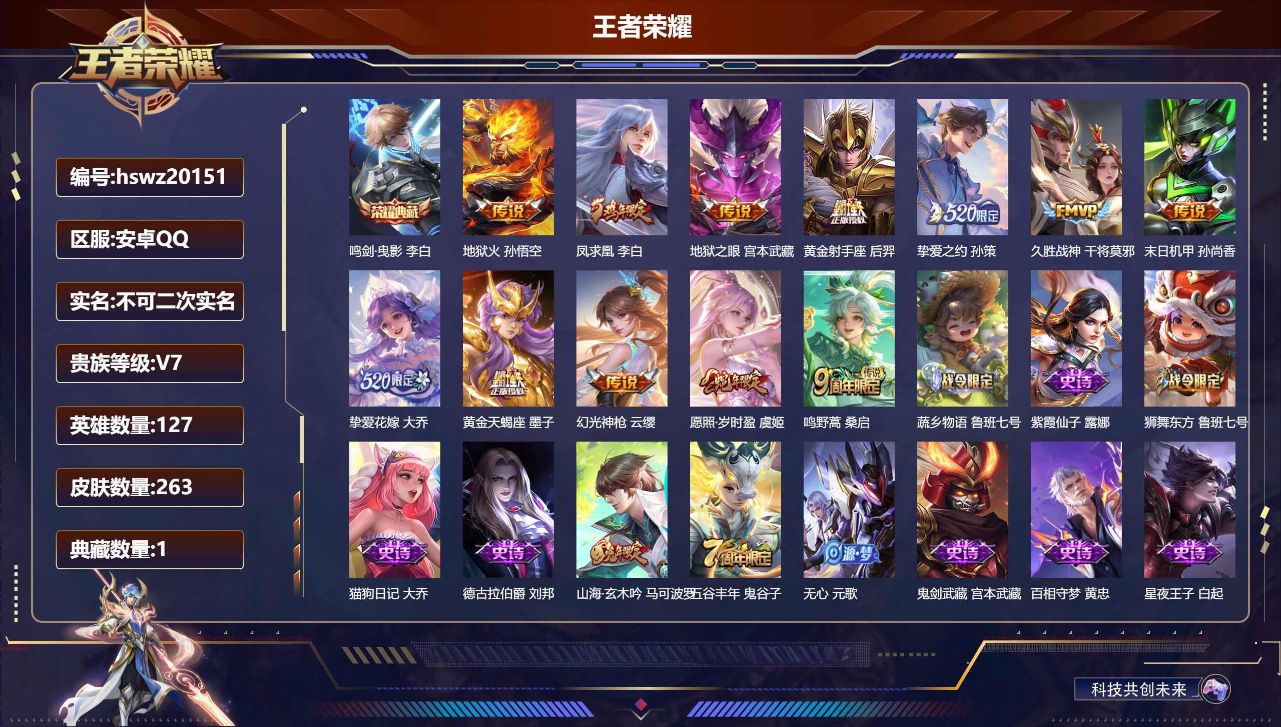 PX_2311796-Q/绝世王者/263皮肤/127英雄/1典藏/0珍品无双/0无双/0珍品传说/12传说/60史诗/9稀有英雄 【1,典藏皮肤】鸣剑·曳影,李白, 【12,传说皮肤】地狱火,孙悟空,凤求凰,李白,地狱之眼,宫本武藏,黄金射手座,后羿,挚爱之约,孙策,久胜战神,干将莫邪,末日机甲,孙尚香,挚爱花嫁,大乔,黄金天蝎座,墨子,幻光神枪,云缨,愿照·岁时盈,虞姬,鸣野蒿,桑启, 【60,史诗皮肤】蔬乡物语,鲁班七号,紫霞仙子,露娜,狮舞东方,鲁班七号,猫狗日记,大乔,德古拉伯爵,刘邦,山海·玄木吟,马可波罗,五谷丰年,鬼谷子,无心,元歌,鬼剑武藏,宫本武藏,百相守梦,黄忠,星夜王子,白起,摇滚巨星,嬴政,蜜橘之夏,公孙离,魅力维加斯,妲己,黄金分割率,诸葛亮,热情桑巴,妲己,偶像歌手,王昭君,梅西,裴擒虎,舞动绿茵,蔡文姬,鹰眼统帅,狄仁杰,李小龙,裴擒虎,金属风暴,墨子,逐梦之影,韩信,特工魅影,百里守约,原初追逐者,百里玄策,逐浪之夏,李元芳,未来纪元,赵云,引擎之心,赵云,石田雨龙,后羿,魔术师,狄仁杰,龙之律动,狂铁,皇家上将,赵云,至尊宝,孙悟空,功夫厨神,程咬金,梁祝,上官婉儿,天才门将,刘禅,圣诞恋歌,貂蝉,水晶猎龙者,花木兰,破空之剑,亚连,圣诞狂欢,吕布,魅语,不知火舞,白龙吟,韩信,地狱岩魂,廉颇,纯白花嫁,小乔,冰雪圆舞曲,甄姬,千年之狐,李白,节奏热浪,阿轲,暗夜猫娘,阿轲,游园惊梦,甄姬,瑞麟志,花木兰,心灵骇客,安琪拉,乱世虎臣,张飞,王者之锤,钟无艳,蓝屏警告,典韦,天狼狩猎者,裴擒虎,水果甜心,孙尚香,化蝶舞,阿轲,幽灵船长,曹操,乘风破浪,夏侯惇,暗隐猎兽者,兰陵王, 【127,勇者皮肤】胡桃夹子,干将莫邪,圆桌骑士,盾山,烛龙,曹操,太极少年,赵怀真,大漠名商,沈梦溪,缤纷绘卷,张良,纽约教父,刘备,拳王,达摩,大发明家,达摩,龙舞盛年,沈梦溪,丁香结,小乔,功夫炙烤,廉颇,沉稳之力,孙尚香,海盐诗旅,桑启,朔风刀,夏侯惇,醍醐杖,老夫子,朔望之晖,女娲,归虚梦演,孙膑,汉昭烈帝,刘备,白色死神,白起,黄金武士,典韦,王牌新星,海月,御旌,牛魔,阴阳师,狄仁杰,炼金王,扁鹊,致命风华,阿轲,次元突破,哪吒,古海寻踪,张良,牛运亨通,牛魔,功夫老勺,老夫子,西部大镖客,牛魔,鲨炮海盗猫,沈梦溪,海滩派对,项羽,万华元夜,狄仁杰,踏浪烽翎,莱西奥,演武夺筹,程咬金,蜃楼王,庄周,猎兽之王,吕布,野性能量,吕布,哥特玫瑰,露娜,守护之力,大乔,无双福将,程咬金,原初探秘者,鬼谷子,潮玩探月行,猪八戒,鸿运当头,亚瑟,天穹祈灯,鬼谷子,决胜大满贯,曹操,疑决卦,明世隐,如懿,安琪拉,化身博士,扁鹊,阿尔法小队,后羿,无尽旅途,扁鹊,五福同心,张飞,夜都怪侠,白起,狮心王,亚瑟,星际陆战队,程咬金,幻乐之宴,鬼谷子,东方不败,武则天,霸王丸,宫本武藏,虹云星官,明世隐,死亡骑士,亚瑟,敏锐之力,李白,危途狂花,戈娅,掌控之力,诸葛亮,海滩丽影,钟无艳,忍·炎影,赵云,狰,白起,雪境奇遇,西施,重明,芈月,炽热元素使,姜子牙,坚韧之力,苏烈,唤灵魔甲,刘禅,万事如意,刘备,乓乓大师,鲁班大师,死亡摇滚,高渐离,妖精王,孙膑,天使之翼,孙膑,兔女郎,花木兰,龙腾万里,关羽,金庭之子,兰陵王,未来纪元,宫本武藏,罗小黑战记,哪吒,零食大作战,姬小满,荣光之誓,亚瑟,花好人间,甄姬,万象初新,宫本武藏,御銮,盾山,时尚教父,姜子牙,春野之旅,钟无艳,秘密基地,刘禅,穷奇,典韦,教廷特使,韩信,街头霸王,韩信,云中旅人,李元芳,西部大镖客,孙悟空,凯尔特女王,虞姬,进击墨子号,墨子,蔬乡物语,李元芳,少女阿狸,妲己,混沌棋,弈星,御霄,米莱狄,布丁狗之约,阿古朵,暖冬·兔眠,嫦娥,命运加冕,露娜,小满鸭,姬小满,灵野札记,张良,驱傩正仪,钟馗,神迹守卫,钟馗,命运角斗场,狂铁,死霸装,白起,虚灵犬护,钟馗,御狮,狂铁,白执事,赵云,饕餮,太乙真人,神迹守卫,孙悟空,剑破天穹,刘邦,熔金海岸,周瑜,天穹之誓,姜子牙,星梦巡礼,姜子牙,破阵·退雄兵,杨戬,谧流熔炉,太乙真人,鹤鸣心笺,艾琳,逆浪荇歌,甄姬,噬灭天穹,东皇太一,灵卦秘语,少司缘,爆裂喵拳,达摩,玫蓝誓约,戈娅, 【63,其他皮肤】伊势巫女,大乔,前尘,金蝉,芝加哥教父,黄忠,潮流仙人,老夫子,三太子,哪吒,龙域领主,铠,生化警戒,钟无艳,死神来了,曹操,超能战警,曹操,花见巫女,伽罗,爱与和平,苏烈,未来旅行,孙膑,第七人偶,干将莫邪,灼热之刃,李信,熊喵少女,阿古朵,海之征途,孙策,帝国元帅,项羽,精灵王,后羿,绯红之刃,露娜,碧珀绯影,暃,海军大将,周瑜,星航指挥官,诸葛亮,魇语军师,司马懿,英喵野望,刘禅,午夜歌剧院,元歌,启蛰,司空震,霓裳曲,杨玉环,花间舞,公孙离,异域舞娘,貂蝉,东海龙王,东皇太一,修竹墨客,上官婉儿,剑舞者,花木兰,范海辛,李白,维京掠夺者,苍,占星师,明世隐,激情绿茵,马可波罗,埃及法老,杨戬,归虚梦演,西施,阿摩司公爵,鬼谷子,画中游,桑启,年年有余,猪八戒,锦衣卫,狄仁杰,一千零一夜,张良,归虚梦演,曜,威尼斯狂欢,百里玄策,幸存者,马超,战争女神,雅典娜,荷鲁斯之眼,云中君,创世神祝,盘古,特种部队,李元芳,绝影神枪,百里守约,森,瑶,孤猎,澜,加勒比小姐,虞姬,踏雪寻梅,弈星,仙境爱丽丝,妲己,秩序猎龙将,蒙恬,精灵公主,王昭君,赤焰之缨,云缨,地府判官,钟馗,美梦成真,梦奇,天启骑士,关羽,西部大镖客,孙悟空, 【9,稀有英雄】敖隐,嬴政,不知火舞,橘右京,夏洛特,娜可露露,韩信,艾琳,赵云, 营地ID:,