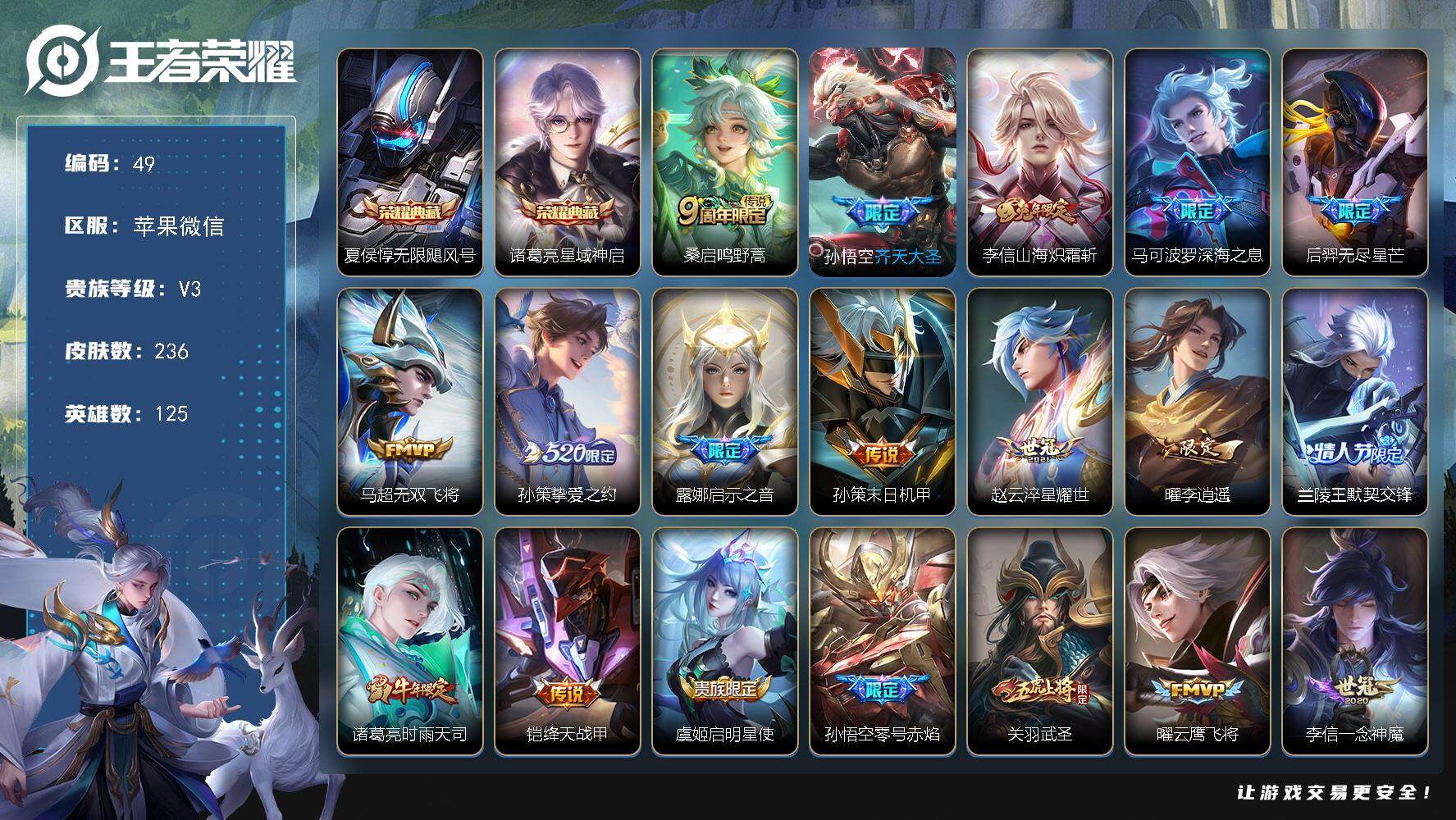 PX_2295043-WX-V9-社交限制-至尊星耀IV段位-123英雄-329皮肤-2典藏-0珍品无双-1无双-0珍品传说-27传说-91史诗 【英雄全皮】:刘邦全皮,蒙恬全皮 【荣耀典藏】:李白鸣剑曳影,花木兰九霄神辉 【无双皮肤】:李白碎月剑心 【传说皮肤】:桑启鸣野蒿,墨子黄金天蝎座,海月金乌负日,孙策乘龙淬吴钩,澜逐花归海,宫本武藏惊梅引,公孙离记忆之芯,吕布怒海麟威,百里守约碎云,后羿无尽星芒,孙尚香异界灵契,赵云淬星耀世,小乔音你心动,诸葛亮时雨天司,铠绛天战甲,镜炽阳神光,虞姬启明星使,孙悟空零号赤焰,关羽武圣,曜云鹰飞将,李信一念神魔,张良黄金白羊座,虞姬云霓雀翎,后羿黄金射手座,貂蝉仲夏夜之梦,孙尚香末日机甲,狄仁杰超时空战士 【限定皮肤】:白起狰,蒙犽顽岩魄,蔡文姬夏日便利店,大乔绒语心约,虞姬夏日便利店,姜子牙天穹之誓,杨戬破阵退雄兵,狄仁杰阴阳师,小乔纯白花嫁,赵云皇家上将,墨子神迹守卫,嬴政优雅恋人,孙尚香异界灵契,钟无艳超时空战士,扁鹊奇幻香踪,芈月幻夜卜梦,元歌无心,甄姬幽恒,甄姬女儿国国王,甄姬落雪兰心,典韦蓝屏警告,狄仁杰魔术师,狄仁杰万华元夜,达摩沙漠行僧,项羽海滩派对,老夫子醍醐杖,关羽武圣,程咬金演武夺筹,刘邦夺宝奇兵,韩信傲雪梅枪,王昭君午后时光,兰陵王金庭之子,花木兰青春决赛季,亚瑟潮玩骑士王,孙悟空大圣娶亲,孙悟空零号赤焰,孙悟空孙行者,后羿辉光之辰,后羿圣弓游侠,后羿无尽星芒,李元芳云中旅人,虞姬启明星使,杨戬潮玩骑兵,女娲朔望之晖,干将莫邪真爱魔法,雅典娜单词大作战,雅典娜黎明之约,鬼谷子原初探秘者,鬼谷子五谷丰年,诸葛亮时雨天司,黄忠火炮绅士,苏烈千军破阵,百里玄策原初追逐者,梦奇顽趣,沈梦溪大漠名商,裴擒虎李小龙,裴擒虎擒涛扼浪,狂铁电玩高手,云中君纤云弄巧,上官婉儿梁祝,嫦娥拒霜思,嫦娥暖冬兔眠,西施玲珑珍味,西施至美乘鲤谣,蒙犽狂想玩偶喵,鲁班大师探海日志,镜匿光追影者,桑启海盐诗旅,暃星界游侠,戈娅驭风魔法,艾琳流音漫舞,司空震地狱燃心,阿古朵江河有灵,张良古海寻踪,蒙犽百解令,蒙恬荣光圣徽,高渐离燃音魔法,妲己灵卜魔法,鬼谷子天穹祈灯,李白碎月剑心,伽罗琥珀纪元,姬小满妄想食味,安琪拉乘龙聚宝船,孙策乘龙淬吴钩,沈梦溪龙舞盛年,鲁班七号蔬乡物语,李元芳蔬乡物语,海月金乌负日,刘邦剑破天穹,程咬金群星魔术团,镜青焰无极,