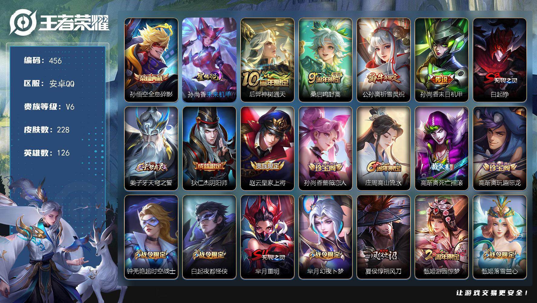 PX_2307750-Q-V6-最强王者段位-126英雄-228皮肤-1典藏皮肤-4传说-56史诗 【荣耀典藏】:孙悟空全息碎影 【传说皮肤】:后羿神树通天,桑启鸣野蒿,公孙离祈雪灵祝,孙尚香末日机甲 【限定皮肤】:白起狰,姜子牙天穹之誓,狄仁杰阴阳师,赵云皇家上将,孙尚香蔷薇恋人,庄周高山流水,高渐离死亡摇滚,高渐离玩趣恶龙,钟无艳超时空战士,白起夜都怪侠,芈月重明,芈月幻夜卜梦,夏侯惇朔风刀,甄姬游园惊梦,甄姬落雪兰心,曹操烛龙,典韦穷奇,狄仁杰魔术师,狄仁杰万华元夜,达摩沙漠行僧,项羽海滩派对,老夫子醍醐杖,程咬金演武夺筹,兰陵王金庭之子,牛魔御旌,后羿圣弓游侠,李元芳云中旅人,钟馗驱傩正仪,干将莫邪真爱魔法,雅典娜单词大作战,雅典娜黎明之约,太乙真人饕餮,太乙真人华丽摇滚,鬼谷子五谷丰年,黄忠火炮绅士,苏烈千军破阵,百里玄策原初追逐者,弈星混沌棋,梦奇顽趣,公孙离祈雪灵祝,沈梦溪大漠名商,明世隐疑决卦,明世隐吟游魔法,裴擒虎李小龙,狂铁御狮,米莱狄御霄,盾山御銮,上官婉儿梁祝,西施玲珑珍味,蒙犽狂想玩偶喵,鲁班大师探海日志,桑启海盐诗旅,戈娅驭风魔法,艾琳流音漫舞,司空震地狱燃心,阿古朵江河有灵,张良古海寻踪,蒙恬荣光圣徽,鬼谷子天穹祈灯,刘邦剑破天穹,镜青焰无极,项羽苍威无极,周瑜熔金海岸 【年限皮肤】:公孙离祈雪灵祝 【赛季限定】:白起狰,芈月重明,夏侯惇朔风刀,曹操烛龙,典韦穷奇,狄仁杰万华元夜,达摩沙漠行僧,老夫子醍醐杖,程咬金演武夺筹,兰陵王金庭之子,张良古海寻踪,牛魔御旌,李元芳云中旅人,钟馗驱傩正仪,雅典娜黎明之约,太乙真人饕餮,苏烈千军破阵,百里玄策原初追逐者,弈星混沌棋,梦奇顽趣,沈梦溪大漠名商,明世隐疑决卦,狂铁御狮,米莱狄御霄,盾山御銮,鲁班大师探海日志,桑启海盐诗旅,鬼谷子天穹祈灯,蒙恬荣光圣徽,刘邦剑破天穹,姜子牙天穹之誓 【战令限定】:钟无艳超时空战士,白起夜都怪侠,芈月幻夜卜梦,甄姬落雪兰心,艾琳流音漫舞,后羿圣弓游侠,干将莫邪真爱魔法,雅典娜单词大作战,黄忠火炮绅士,明世隐吟游魔法,西施玲珑珍味,蒙犽狂想玩偶喵,司空震地狱燃心,戈娅驭风魔法,镜青焰无极,项羽苍威无极 【史诗皮肤】:露娜紫霞仙子,赵云皇家上将,甄姬冰雪圆舞曲,王昭君偶像歌手,狄仁杰魔术师,廉颇地狱岩魂,宫本武藏鬼剑武藏,孙尚香蔷薇恋人,孙尚香水果甜心,嬴政摇滚巨星,妲己魅力维加