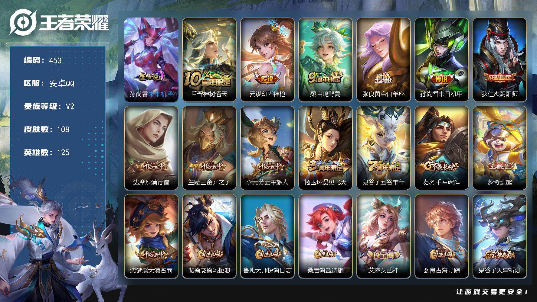 PX_2307746-Q-V2-最强王者段位-125英雄-108皮肤-5传说-25史诗-中路26段, 【传说皮肤】:后羿神树通天,云缨幻光神枪,桑启鸣野蒿,张良黄金白羊座,孙尚香末日机甲 【限定皮肤】:狄仁杰阴阳师,达摩沙漠行僧,兰陵王金庭之子,李元芳云中旅人,杨玉环遇见飞天,鬼谷子五谷丰年,苏烈千军破阵,梦奇顽趣,沈梦溪大漠名商,裴擒虎擒涛扼浪,鲁班大师探海日志,桑启海盐诗旅,艾琳女武神,张良古海寻踪,鬼谷子天穹祈灯,刘邦剑破天穹 【赛季限定】:达摩沙漠行僧,兰陵王金庭之子,张良古海寻踪,李元芳云中旅人,苏烈千军破阵,梦奇顽趣,沈梦溪大漠名商,裴擒虎擒涛扼浪,鲁班大师探海日志,桑启海盐诗旅,鬼谷子天穹祈灯,刘邦剑破天穹 【史诗皮肤】:貂蝉圣诞恋歌,宫本武藏鬼剑武藏,孙尚香水果甜心,嬴政摇滚巨星,妲己魅力维加斯,妲己女仆咖啡,吕布圣诞狂欢,小乔缤纷独角兽,亚瑟心灵战警,蔡文姬舞动绿茵,刘禅天才门将,李元芳逐浪之夏,阿轲节奏热浪,杨玉环遇见飞天,孙策猫狗日记,狄仁杰鹰眼统帅,西施诗语江南,鬼谷子五谷丰年,梦奇顽趣,弈星万物之道,后羿石田雨龙,黄忠百相守梦,西施织梦人,公孙离涂山容容,少司缘巫礼祀神 【其他皮肤】:韩信街头霸王,赵云白执事,赵云忍炎影,芈月红桃皇后,艾琳女武神,白起白色死神,扁鹊化身博士,安琪拉玩偶对对碰,姜子牙时尚教父,亚瑟死亡骑士,达摩拳王,花木兰兔女郎,甄姬花好人间,狄仁杰阴阳师,关羽龙腾万里,钟无艳海滩丽影,孙尚香沉稳之力,李白敏锐之力,小乔丁香结,沈梦溪鲨炮海盗猫,姜子牙炽热元素使,鲁班大师乓乓大师,苏烈千军破阵,达摩沙漠行僧,兰陵王金庭之子,刘禅唤灵魔甲,沈梦溪大漠名商,李元芳云中旅人,桑启海盐诗旅,海月幻泉雾影,猪八戒潮玩探月行,赵怀真太极少年,裴擒虎擒涛扼浪,太乙真人劲辣红锅,鲁班大师探海日志,李元芳妄想特派,张良古海寻踪,鬼谷子天穹祈灯,钟无艳春野之旅,刘邦剑破天穹,苍苍林狼骑,太乙真人谧流熔炉,西施雪境奇遇,姜子牙星梦巡礼,明世隐景韶洛都,戈娅玫蓝誓约,刘备浪漫序章,钟馗虚灵犬护,苏烈春野闲踪,张良灵野札记,阿古朵布丁狗之约,露娜命运加冕,姬小满小满鸭,白起死霸装,甄姬逆浪荇歌,庄周锦麟游梦,莱西奥踏浪烽翎,鬼谷子克喵,亚瑟荣光之誓,艾琳鹤鸣心笺,露娜绯红之刃,貂蝉异域舞娘,花木兰剑舞者,王昭君精灵公主,蔡文姬蔷薇王座,马可波罗激情绿茵,杨戬埃及法老