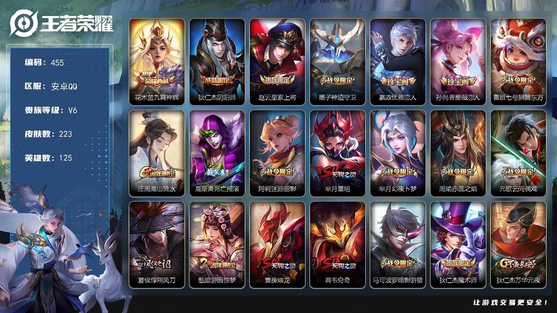 PX_2307747-Q-V6-最强王者段位-125英雄-223皮肤-1典藏皮肤-52史诗 【英雄全皮】:影全皮 【荣耀典藏】:花木兰九霄神辉 【限定皮肤】:狄仁杰阴阳师,赵云皇家上将,墨子神迹守卫,嬴政优雅恋人,孙尚香蔷薇恋人,鲁班七号狮舞东方,庄周高山流水,高渐离死亡摇滚,阿轲迷踪丽影,芈月重明,芈月幻夜卜梦,周瑜赤莲之焰,元歌云间偶戏,夏侯惇朔风刀,甄姬游园惊梦,曹操烛龙,典韦穷奇,马可波罗暗影游猎,狄仁杰魔术师,狄仁杰万华元夜,达摩沙漠行僧,项羽海滩派对,老夫子醍醐杖,程咬金演武夺筹,刘邦夺宝奇兵,韩信飞衡,兰陵王驯魔猎人,兰陵王金庭之子,亚瑟潮玩骑士王,孙悟空大圣娶亲,牛魔御旌,后羿如梦令,后羿圣弓游侠,李元芳银河之约,李元芳云中旅人,钟馗神迹守卫,钟馗驱傩正仪,干将莫邪真爱魔法,雅典娜单词大作战,蔡文姬繁星吟游,太乙真人饕餮,鬼谷子原初探秘者,黄忠火炮绅士,苏烈千军破阵,弈星混沌棋,沈梦溪星空之诺,沈梦溪大漠名商,明世隐疑决卦,裴擒虎李小龙,裴擒虎擒涛扼浪,米莱狄御霄,云中君纤云弄巧,盾山御銮,猪八戒西部大镖客,上官婉儿梁祝,嫦娥拒霜思,蒙犽狂想玩偶喵,鲁班大师探海日志,桑启海盐诗旅,张良古海寻踪,鬼谷子天穹祈灯,刘邦剑破天穹,程咬金群星魔术团,刘备异域游侠 【年限皮肤】:韩信飞衡 【赛季限定】:芈月重明,夏侯惇朔风刀,曹操烛龙,典韦穷奇,狄仁杰万华元夜,达摩沙漠行僧,老夫子醍醐杖,程咬金演武夺筹,兰陵王金庭之子,张良古海寻踪,牛魔御旌,李元芳云中旅人,钟馗驱傩正仪,太乙真人饕餮,鬼谷子原初探秘者,苏烈千军破阵,弈星混沌棋,沈梦溪大漠名商,明世隐疑决卦,裴擒虎擒涛扼浪,米莱狄御霄,盾山御銮,鲁班大师探海日志,桑启海盐诗旅,鬼谷子天穹祈灯,刘邦剑破天穹 【战令限定】:墨子神迹守卫,鲁班七号狮舞东方,阿轲迷踪丽影,芈月幻夜卜梦,周瑜赤莲之焰,元歌云间偶戏,马可波罗暗影游猎,刘邦夺宝奇兵,兰陵王驯魔猎人,亚瑟潮玩骑士王,后羿圣弓游侠,李元芳银河之约,钟馗神迹守卫,干将莫邪真爱魔法,雅典娜单词大作战,黄忠火炮绅士,沈梦溪星空之诺,猪八戒西部大镖客,蒙犽狂想玩偶喵 【史诗皮肤】:项羽苍穹之光,赵云皇家上将,貂蝉圣诞恋歌,狄仁杰魔术师,宫本武藏鬼剑武藏,孙尚香蔷薇恋人,嬴政优雅恋人,嬴政摇滚巨星,妲己女仆咖啡,墨子金属风暴,吕布圣诞狂欢,吕布末日机甲,张飞乱世虎臣,花木兰水晶猎龙者