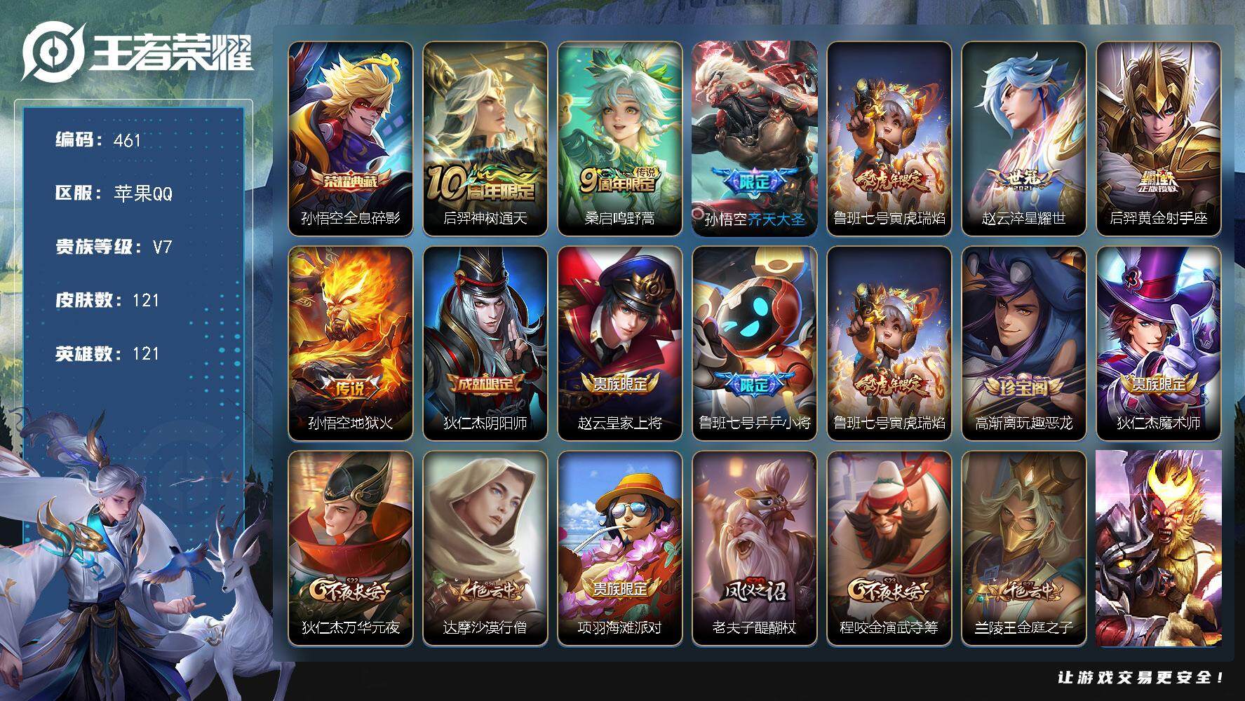 PX_2307707-实名:,可修改,贵族等级:,V7,英雄数:,127,皮肤数:,261,荣耀水晶:,鸣剑·曳影,九霄神辉,传说皮:,零号·赤焰,无双飞将,山海·炽霜斩,幻光神枪,限定皮:,朱雀志,高山流水,孙行者,傲雪梅枪,百木心枪,匿光决锋者,五谷丰年,神器·万象笔,鸣野蒿,逐霄战戟,愿照·九州拓