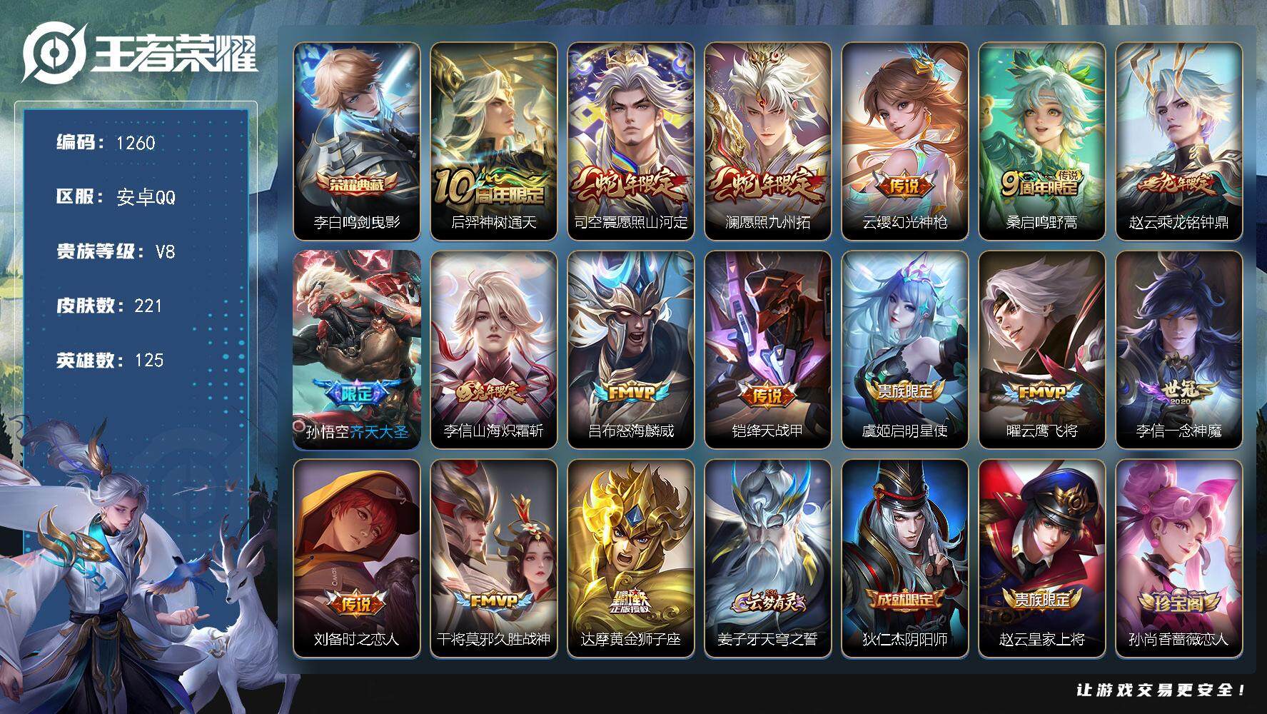 PX_2295023--安卓Q-V7-至尊星耀II段位-124英雄-293皮肤-1典藏--14传说-87史诗 【英雄全皮】:李信全皮,猪八戒全皮,蒙恬全皮 【荣耀典藏】:韩信弑枪猎影 【传说皮肤】:云缨幻光神枪,桑启鸣野蒿,吕布曦玄引,李信山海炽霜斩,马超无双飞将,镜炽阳神光,虞姬启明星使,曜云鹰飞将,李信一念神魔,刘备时之恋人,花木兰冠军飞将,诸葛亮武陵仙君,孙悟空地狱火,狄仁杰超时空战士 【限定皮肤】:蔡文姬夏日便利店,虞姬夏日便利店,姜子牙天穹之誓,李白谪仙醉月,狄仁杰阴阳师,赵云皇家上将,赵云百木心枪,墨子神迹守卫,庄周高山流水,高渐离死亡摇滚,高渐离玩趣恶龙,钟无艳超时空战士,扁鹊奇幻香踪,白起夜都怪侠,芈月幻夜卜梦,元歌云间偶戏,元歌无心,甄姬落雪兰心,马可波罗暗影游猎,马可波罗山海玄木吟,狄仁杰魔术师,狄仁杰万华元夜,达摩星际陆战队,达摩沙漠行僧,项羽海滩派对,老夫子醍醐杖,老夫子航海奇遇记,关羽冰锋战神,程咬金演武夺筹,王昭君凤凰于飞,王昭君午后时光,兰陵王金庭之子,亚瑟潮玩骑士王,孙悟空孙行者,李元芳匿光侦查者,李元芳云中旅人,虞姬启明星使,钟馗驱傩正仪,杨玉环遇见飞天,杨戬潮玩骑兵,干将莫邪胡桃夹子,雅典娜单词大作战,太乙真人华丽摇滚,鬼谷子原初探秘者,鬼谷子五谷丰年,诸葛亮武陵仙君,黄忠火炮绅士,百里守约朱雀志,公孙离玉兔公主,沈梦溪大漠名商,明世隐疑决卦,明世隐吟游魔法,裴擒虎李小龙,裴擒虎擒涛扼浪,狂铁电玩高手,米莱狄胡桃异想国,云中君纤云弄巧,李信山海炽霜斩,猪八戒西部大镖客,猪八戒猪悟能,嫦娥暖冬兔眠,西施玲珑珍味,蒙犽狂想玩偶喵,鲁班大师探海日志,桑启海盐诗旅,暃星界游侠,戈娅驭风魔法,艾琳流音漫舞,司空震地狱燃心,阿古朵江河有灵,张良古海寻踪,蒙犽百解令,蒙恬荣光圣徽,高渐离燃音魔法,妲己灵卜魔法,鬼谷子天穹祈灯,姬小满妄想食味,吕布曦玄引,沈梦溪龙舞盛年,鲁班七号蔬乡物语,李元芳蔬乡物语,刘邦剑破天穹,程咬金群星魔术团,周瑜熔金海岸 【年限皮肤】:百里守约朱雀志,王昭君凤凰于飞,马可波罗山海玄木吟,李信山海炽霜斩 【赛季限定】:狄仁杰万华元夜,达摩沙漠行僧,老夫子醍醐杖,程咬金演武夺筹,兰陵王金庭之子,张良古海寻踪,李元芳云中旅人,钟馗驱傩正仪,鬼谷子原初探秘者,沈梦溪大漠名商,明世隐疑决卦,裴擒虎擒涛扼浪,鲁班大师探海日志,桑启海盐诗旅