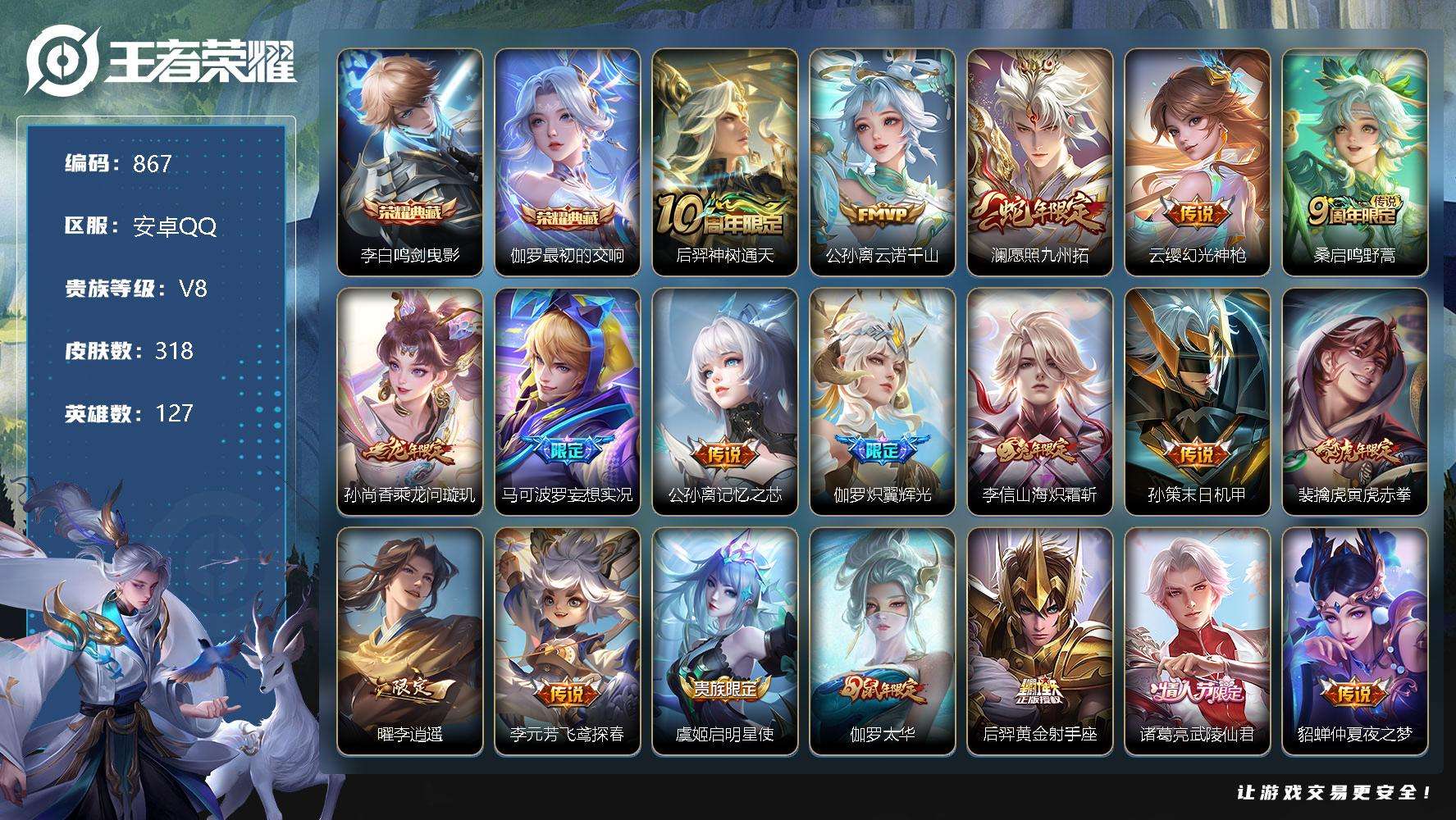 PX_2309673-贵族8/皮肤318/典藏2/传说21/史诗93/英雄127/刘禅全皮/孙权全皮/鬼谷子全皮/狂铁全皮/蒙恬全皮/莱西奥全皮/空空儿全皮/鸣剑·曳影/Z初的交响/后羿神树通天/公孙离云诺千山/愿照·九州拓/幻光神枪/鸣野蒿/乘龙·问璇玑/妄想实况/记忆之芯/炽翼辉光/山海·炽霜斩/孙策-末日机甲/寅虎·赤拳/李逍遥/飞鸢探春/启明星使/太华/黄金射手座/武陵仙君/仲夏夜之梦/地狱之眼/狄仁杰-超