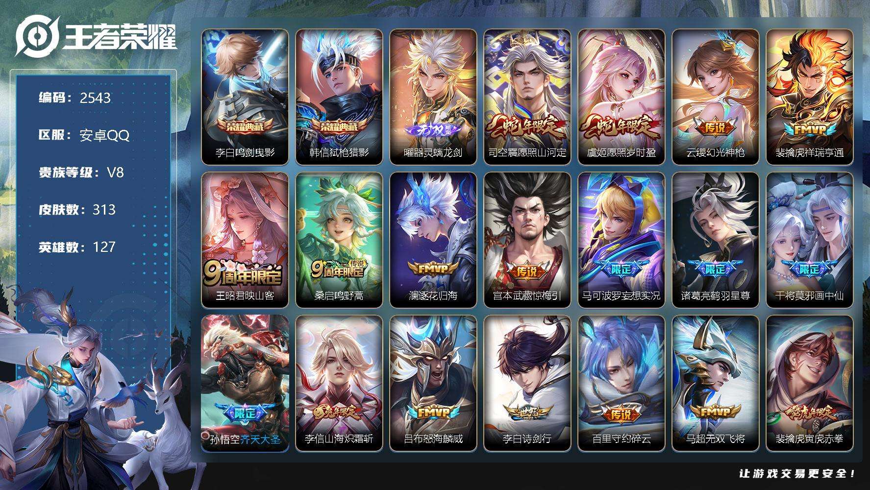 PX_2309672-贵族8/皮肤313/典藏2/传说30/史诗90/英雄127/狂铁全皮/司空震全皮/戈娅全皮/空空儿全皮/鸣剑·曳影/弑枪猎影/器灵·螭龙剑/愿照·山河定/愿照·岁时盈/幻光神枪/祥瑞亨通/映山客/鸣野蒿/逐花归海/惊梅引/妄想实况/鹤羽星尊/画中仙/齐天大圣/山海·炽霜斩/怒海麟威/诗剑行/碎云/无双飞将/寅虎·赤拳/淬星耀世/周瑜-音你心动/绛天战甲/启明星使/云鹰飞将/太华/云霓雀翎/黄金