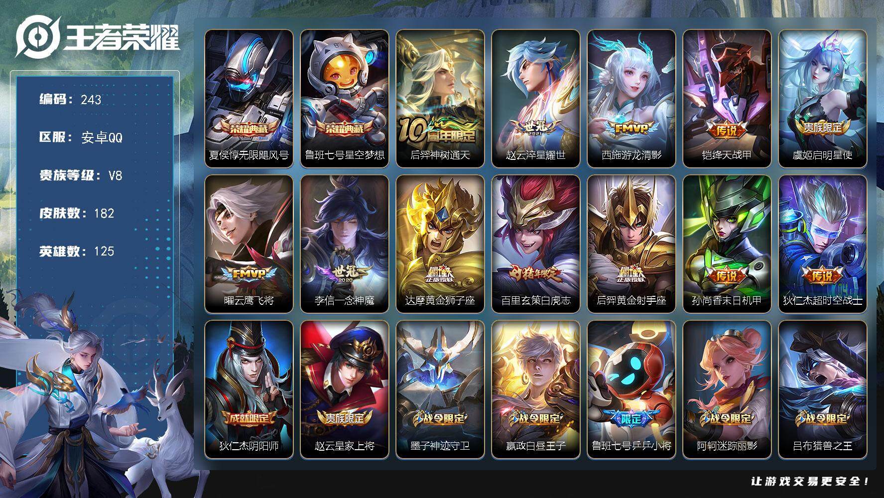 PX_2294894-Q-V8-永恒钻石I段位--发育路16段-125英雄-182皮肤-2典藏皮肤-12传说-48史诗 【荣耀典藏】:夏侯惇无限飓风号,鲁班七号星空梦想 【传说皮肤】:后羿神树通天,赵云淬星耀世,西施游龙清影,铠绛天战甲,虞姬启明星使,曜云鹰飞将,李信一念神魔,达摩黄金狮子座,百里玄策白虎志,后羿黄金射手座,孙尚香末日机甲,狄仁杰超时空战士 【限定皮肤】:狄仁杰阴阳师,赵云皇家上将,墨子神迹守卫,嬴政白昼王子,鲁班七号乒乒小将,阿轲迷踪丽影,吕布猎兽之王,周瑜赤莲之焰,夏侯惇朔风刀,马可波罗暗影游猎,狄仁杰魔术师,狄仁杰万华元夜,项羽海滩派对,老夫子醍醐杖,老夫子航海奇遇记,程咬金演武夺筹,露娜一生所爱,刘邦夺宝奇兵,兰陵王驯魔猎人,孙悟空大圣娶亲,李元芳银河之约,虞姬启明星使,钟馗驱傩正仪,女娲朔望之晖,干将莫邪冰霜恋舞曲,鬼谷子原初探秘者,百里玄策白虎志,百里守约朱雀志,弈星混沌棋,公孙离蜜橘之夏,沈梦溪星空之诺,明世隐疑决卦,米莱狄御霄,云中君纤云弄巧,盾山御銮,猪八戒西部大镖客,上官婉儿梁祝 【年限皮肤】:百里玄策白虎志,百里守约朱雀志 【赛季限定】:夏侯惇朔风刀,狄仁杰万华元夜,老夫子醍醐杖,程咬金演武夺筹,钟馗驱傩正仪,鬼谷子原初探秘者,弈星混沌棋,明世隐疑决卦,米莱狄御霄,盾山御銮 【战令限定】:墨子神迹守卫,嬴政白昼王子,阿轲迷踪丽影,吕布猎兽之王,周瑜赤莲之焰,马可波罗暗影游猎,老夫子航海奇遇记,刘邦夺宝奇兵,兰陵王驯魔猎人,李元芳银河之约,女娲朔望之晖,沈梦溪星空之诺,猪八戒西部大镖客 【史诗皮肤】:赵云皇家上将,赵云未来纪元,王昭君偶像歌手,狄仁杰魔术师,廉颇地狱岩魂,宫本武藏鬼剑武藏,孙尚香水果甜心,嬴政暗夜贵公子,妲己魅力维加斯,墨子龙骑士,吕布圣诞狂欢,李白千年之狐,韩信白龙吟,花木兰水晶猎龙者,刘邦德古拉伯爵,夏侯惇乘风破浪,小乔缤纷独角兽,诸葛亮黄金分割率,亚瑟心灵战警,雅典娜冰冠公主,蔡文姬舞动绿茵,公孙离蜜橘之夏,李元芳逐浪之夏,程咬金功夫厨神,阿轲节奏热浪,嬴政白昼王子,孙策猫狗日记,百里守约朱雀志,干将莫邪冰霜恋舞曲,露娜一生所爱,孙悟空大圣娶亲,伽罗箭羽风息,狄仁杰鹰眼统帅,兰陵王驯魔猎人,上官婉儿梁祝,李元芳银河之约,娜可露露晚萤,阿轲迷踪丽影,马可波罗暗影游猎,云中君纤云弄巧,蒙犽龙鼓争鸣,老夫子航海奇遇记,鲁班七号乒乒