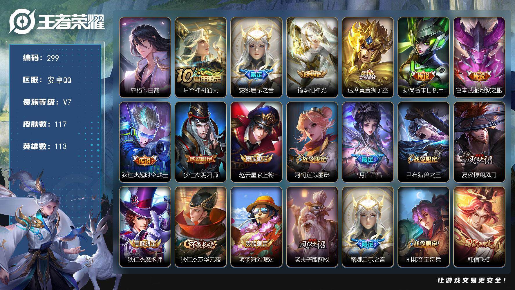 PX_2295117-Q-V9-最强王者段位-128英雄-380皮肤-2典藏皮肤-1典藏英雄-33传说-118史诗 【英雄全皮】:娜可露露全皮,橘右京全皮,猪八戒全皮,空空儿全皮 【荣耀典藏】:武则天英雄,小乔天鹅之梦,孙尚香杀手不太冷 【传说皮肤】:桑启鸣野蒿,吕布怒海麟威,橘右京枫霜尽,娜可露露前尘镜,露娜启示之音,女娲补天,裴擒虎寅虎赤拳,鲁班七号寅虎瑞焰,孙尚香异界灵契,貂蝉遇见胡旋,赵云淬星耀世,王昭君乞巧织情,西施游龙清影,周瑜音你心动,李元芳飞鸢探春,公孙离祈雪灵祝,虞姬启明星使,关羽武圣,曜云鹰飞将,伽罗太华,张良黄金白羊座,干将莫邪久胜战神,虞姬云霓雀翎,达摩黄金狮子座,花木兰冠军飞将,后羿黄金射手座,诸葛亮武陵仙君,貂蝉仲夏夜之梦,李白凤求凰,孙尚香末日机甲,孙悟空地狱火,武则天海洋之心,狄仁杰超时空战士 【限定皮肤】:白起狰,狄仁杰阴阳师,赵云皇家上将,墨子神迹守卫,妲己时之奇旅,嬴政优雅恋人,嬴政白昼王子,孙尚香异界灵契,鲁班七号狮舞东方,鲁班七号寅虎瑞焰,庄周高山流水,高渐离死亡摇滚,阿轲迷踪丽影,钟无艳超时空战士,孙膑寅虎展翼,芈月重明,芈月幻夜卜梦,吕布猎兽之王,周瑜赤莲之焰,元歌云间偶戏,元歌无心,夏侯惇朔风刀,夏侯惇匿光决锋者,甄姬女儿国国王,甄姬落雪兰心,曹操烛龙,典韦穷奇,典韦蓝屏警告,马可波罗逐梦之星,马可波罗暗影游猎,狄仁杰魔术师,狄仁杰万华元夜,达摩星际陆战队,达摩沙漠行僧,项羽海滩派对,老夫子醍醐杖,老夫子航海奇遇记,关羽冰锋战神,关羽武圣,貂蝉遇见胡旋,程咬金演武夺筹,露娜一生所爱,露娜启示之音,韩信飞衡,韩信傲雪梅枪,王昭君午后时光,兰陵王驯魔猎人,兰陵王金庭之子,花木兰青春决赛季,娜可露露前尘镜,橘右京枫霜尽,亚瑟潮玩骑士王,孙悟空至尊宝,孙悟空孙行者,牛魔御旌,后羿圣弓游侠,李元芳银河之约,李元芳云中旅人,虞姬启明星使,钟馗神迹守卫,钟馗驱傩正仪,杨玉环遇见飞天,杨玉环寅虎心曲,女娲朔望之晖,女娲补天,哪吒逐梦之翼,干将莫邪冰霜恋舞曲,干将莫邪胡桃夹子,干将莫邪真爱魔法,雅典娜单词大作战,雅典娜黎明之约,蔡文姬繁星吟游,太乙真人饕餮,太乙真人华丽摇滚,鬼谷子原初探秘者,鬼谷子五谷丰年,诸葛亮武陵仙君,大乔白鹤梁神女,黄忠火炮绅士,苏烈千军破阵,百里玄策原初追逐者,百里守约朱雀志,弈星混沌棋,梦奇顽趣,公孙离祈雪灵祝,公孙离玉兔公