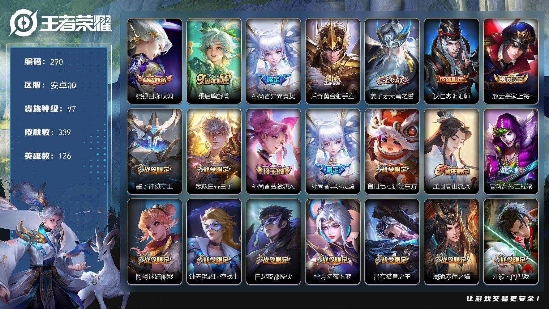 PX_2295111-Q-V7-荣耀黄金III段位-两个荣耀水晶-126英雄-339皮肤-1典藏皮肤-3传说-88史诗 【英雄全皮】:猪八戒全皮,影全皮 【荣耀典藏】:铠银白咏叹调 【传说皮肤】:桑启鸣野蒿,孙尚香异界灵契,后羿黄金射手座 【限定皮肤】:姜子牙天穹之誓,狄仁杰阴阳师,赵云皇家上将,墨子神迹守卫,嬴政白昼王子,孙尚香蔷薇恋人,孙尚香异界灵契,鲁班七号狮舞东方,庄周高山流水,高渐离死亡摇滚,阿轲迷踪丽影,钟无艳超时空战士,白起夜都怪侠,芈月幻夜卜梦,吕布猎兽之王,周瑜赤莲之焰,元歌云间偶戏,元歌无心,夏侯惇朔风刀,甄姬游园惊梦,甄姬落雪兰心,曹操天狼征服者,典韦蓝屏警告,马可波罗暗影游猎,狄仁杰魔术师,狄仁杰万华元夜,达摩星际陆战队,达摩沙漠行僧,项羽海滩派对,老夫子醍醐杖,老夫子航海奇遇记,程咬金演武夺筹,刘邦夺宝奇兵,王昭君凤凰于飞,王昭君午后时光,兰陵王驯魔猎人,兰陵王金庭之子,亚瑟潮玩骑士王,孙悟空至尊宝,孙悟空孙行者,牛魔御旌,后羿圣弓游侠,李元芳银河之约,李元芳云中旅人,钟馗神迹守卫,钟馗驱傩正仪,女娲朔望之晖,干将莫邪胡桃夹子,干将莫邪真爱魔法,雅典娜单词大作战,蔡文姬繁星吟游,太乙真人华丽摇滚,鬼谷子原初探秘者,鬼谷子五谷丰年,黄忠火炮绅士,铠青龙志,苏烈千军破阵,百里玄策原初追逐者,弈星混沌棋,沈梦溪星空之诺,沈梦溪大漠名商,明世隐疑决卦,明世隐吟游魔法,裴擒虎天狼狩猎者,裴擒虎李小龙,狂铁御狮,狂铁电玩高手,米莱狄御霄,米莱狄胡桃异想国,云中君纤云弄巧,盾山御銮,猪八戒西部大镖客,猪八戒猪悟能,上官婉儿梁祝,嫦娥拒霜思,蒙犽狂想玩偶喵,鲁班大师探海日志,桑启海盐诗旅,艾琳女武神,阿古朵江河有灵,张良古海寻踪,鬼谷子天穹祈灯,沈梦溪龙舞盛年,刘邦剑破天穹,程咬金群星魔术团,刘备异域游侠,周瑜熔金海岸 【年限皮肤】:铠青龙志,王昭君凤凰于飞 【赛季限定】:夏侯惇朔风刀,狄仁杰万华元夜,达摩沙漠行僧,老夫子醍醐杖,程咬金演武夺筹,兰陵王金庭之子,张良古海寻踪,牛魔御旌,李元芳云中旅人,钟馗驱傩正仪,鬼谷子原初探秘者,苏烈千军破阵,百里玄策原初追逐者,弈星混沌棋,沈梦溪大漠名商,明世隐疑决卦,狂铁御狮,米莱狄御霄,盾山御銮,鲁班大师探海日志,桑启海盐诗旅,鬼谷子天穹祈灯,刘邦剑破天穹,姜子牙天穹之誓 【战令限定】:墨子神迹守卫,嬴政白昼王子,鲁班七号狮舞东方