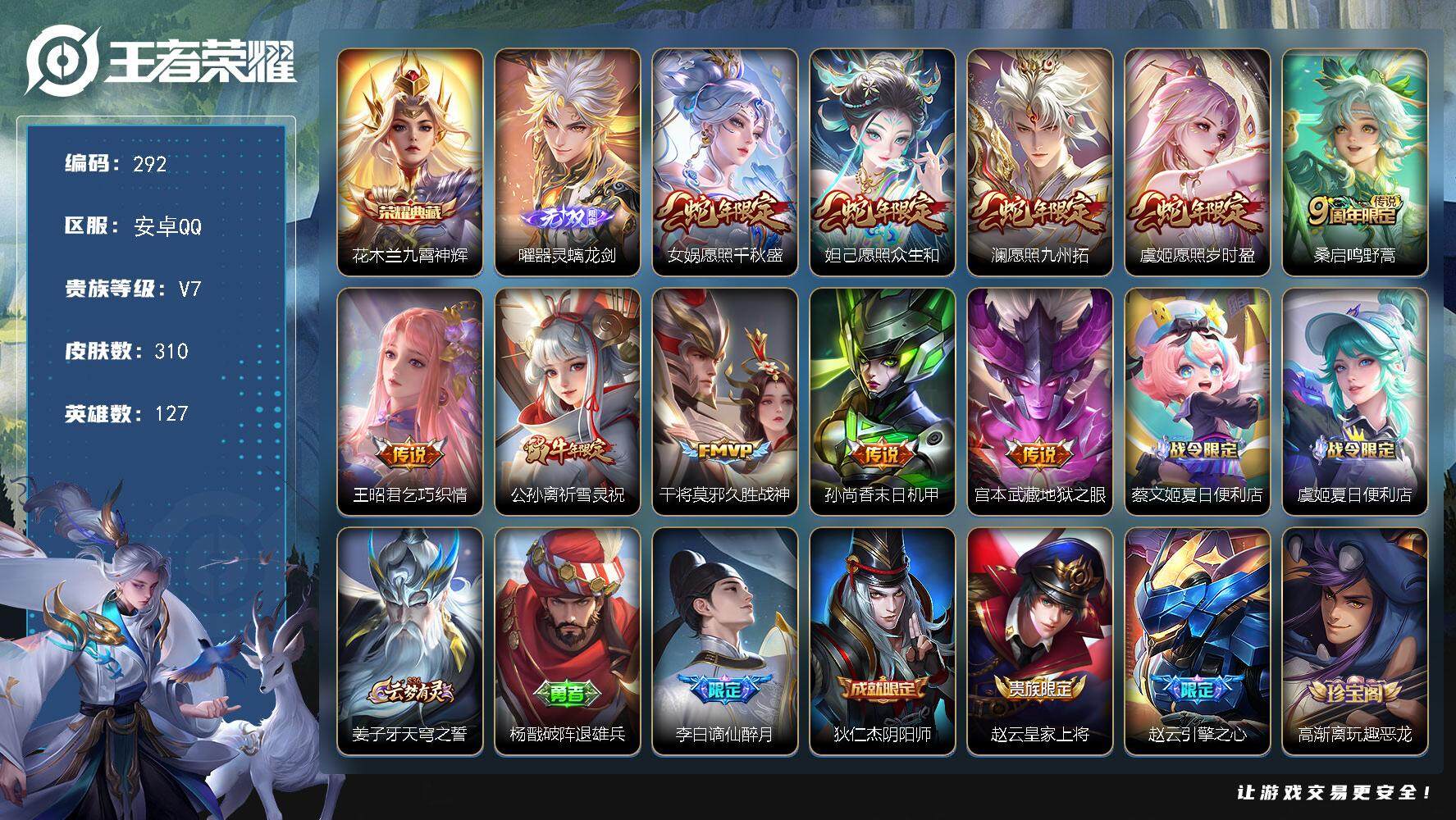 PX_2295112-Q-V7-最强王者段位-发育路13段-2星元宫本地狱之眼-孙尚香末日机甲-127英雄-310皮肤-1典藏皮肤-1无双-10传说-84史诗 【英雄全皮】:苍全皮,鬼谷子全皮,蒙恬全皮,影全皮 【荣耀典藏】:花木兰九霄神辉 【无双皮肤】:曜器灵螭龙剑 【传说皮肤】:女娲愿照千秋盛,妲己愿照众生和,澜愿照九州拓,虞姬愿照岁时盈,桑启鸣野蒿,王昭君乞巧织情,公孙离祈雪灵祝,干将莫邪久胜战神,孙尚香末日机甲,宫本武藏地狱之眼 【限定皮肤】:蔡文姬夏日便利店,虞姬夏日便利店,姜子牙天穹之誓,杨戬破阵退雄兵,李白谪仙醉月,狄仁杰阴阳师,赵云皇家上将,赵云引擎之心,高渐离玩趣恶龙,周瑜赤莲之焰,元歌云间偶戏,元歌无心,甄姬游园惊梦,马可波罗暗影游猎,狄仁杰魔术师,狄仁杰万华元夜,达摩沙漠行僧,项羽海滩派对,老夫子醍醐杖,关羽冰锋战神,貂蝉逐梦之音,程咬金演武夺筹,韩信逐梦之影,韩信飞衡,兰陵王金庭之子,花木兰青春决赛季,亚瑟潮玩骑士王,孙悟空至尊宝,牛魔御旌,李元芳银河之约,李元芳云中旅人,钟馗驱傩正仪,蔡文姬繁星吟游,鬼谷子原初探秘者,鬼谷子五谷丰年,苏烈千军破阵,弈星混沌棋,梦奇顽趣,公孙离祈雪灵祝,沈梦溪星空之诺,沈梦溪大漠名商,明世隐疑决卦,裴擒虎李小龙,裴擒虎擒涛扼浪,狂铁御狮,米莱狄御霄,云中君纤云弄巧,盾山御銮,猪八戒西部大镖客,上官婉儿梁祝,嫦娥拒霜思,嫦娥暖冬兔眠,西施玲珑珍味,鲁班大师探海日志,桑启海盐诗旅,暃星界游侠,艾琳女武神,艾琳流音漫舞,阿古朵江河有灵,张良古海寻踪,蒙犽百解令,蒙恬荣光圣徽,鬼谷子天穹祈灯,刘邦剑破天穹,程咬金群星魔术团,镜青焰无极,项羽苍威无极,刘备异域游侠,芈月浮光幕影,周瑜熔金海岸 【年限皮肤】:公孙离祈雪灵祝,韩信飞衡 【赛季限定】:狄仁杰万华元夜,达摩沙漠行僧,老夫子醍醐杖,程咬金演武夺筹,兰陵王金庭之子,张良古海寻踪,牛魔御旌,李元芳云中旅人,钟馗驱傩正仪,鬼谷子原初探秘者,苏烈千军破阵,弈星混沌棋,梦奇顽趣,沈梦溪大漠名商,明世隐疑决卦,裴擒虎擒涛扼浪,狂铁御狮,米莱狄御霄,盾山御銮,鲁班大师探海日志,桑启海盐诗旅,鬼谷子天穹祈灯,蒙恬荣光圣徽,刘邦剑破天穹,姜子牙天穹之誓 【战令限定】:蔡文姬夏日便利店,虞姬夏日便利店,周瑜赤莲之焰,元歌云间偶戏,马可波罗暗影游猎,艾琳流音漫舞,亚瑟潮玩骑士王,李元芳银河之约,沈梦