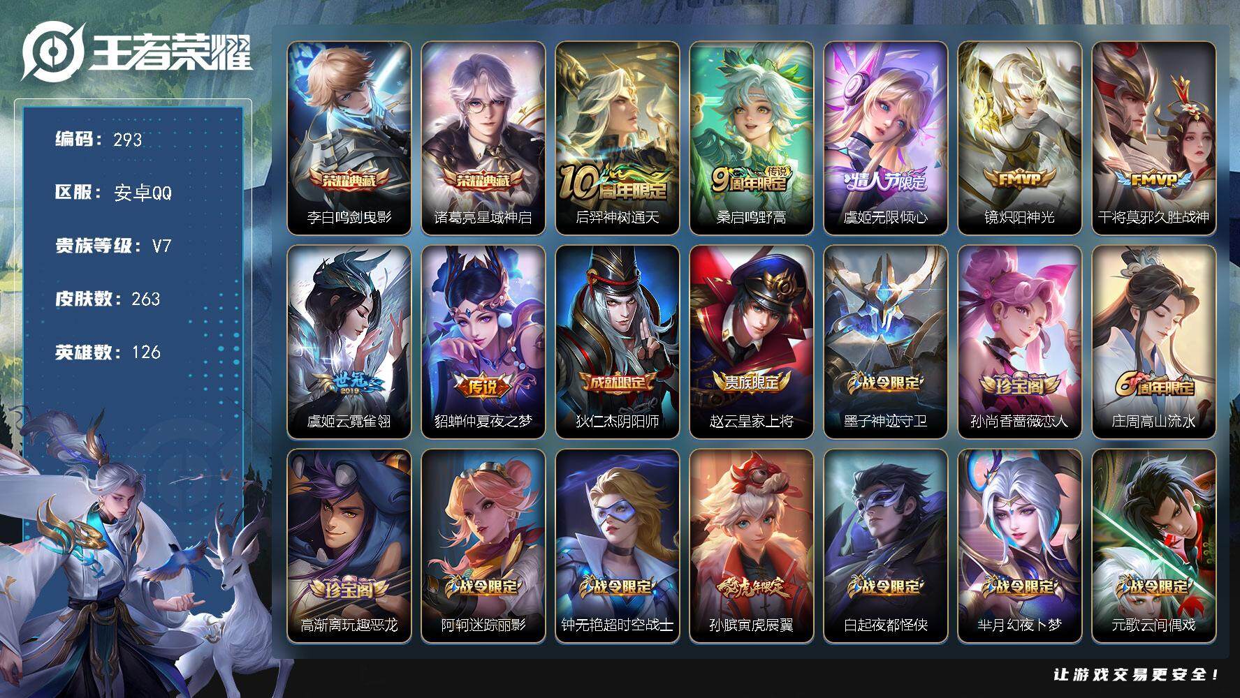 PX_2295060-Q-V7-最强王者段位-发育路21段-2星元虞姬无限倾心-貂蝉金色仲夏夜-126英雄-263皮肤-2典藏皮肤-7传说-89史诗 【英雄全皮】:刘邦全皮 【荣耀典藏】:李白鸣剑曳影,诸葛亮星域神启 【传说皮肤】:后羿神树通天,桑启鸣野蒿,虞姬无限倾心,镜炽阳神光,干将莫邪久胜战神,虞姬云霓雀翎,貂蝉仲夏夜之梦 【限定皮肤】:狄仁杰阴阳师,赵云皇家上将,墨子神迹守卫,孙尚香蔷薇恋人,庄周高山流水,高渐离玩趣恶龙,阿轲迷踪丽影,钟无艳超时空战士,孙膑寅虎展翼,白起夜都怪侠,芈月幻夜卜梦,元歌云间偶戏,元歌无心,甄姬落雪兰心,马可波罗暗影游猎,马可波罗山海玄木吟,狄仁杰魔术师,狄仁杰万华元夜,达摩星际陆战队,达摩沙漠行僧,项羽海滩派对,老夫子醍醐杖,老夫子航海奇遇记,程咬金演武夺筹,刘邦夺宝奇兵,王昭君午后时光,兰陵王金庭之子,亚瑟潮玩骑士王,孙悟空孙行者,后羿如梦令,后羿圣弓游侠,李元芳银河之约,李元芳云中旅人,虞姬霸王别姬,虞姬无限倾心,钟馗驱傩正仪,杨玉环遇见飞天,干将莫邪真爱魔法,雅典娜单词大作战,雅典娜黎明之约,蔡文姬奇迹圣诞,蔡文姬繁星吟游,太乙真人华丽摇滚,鬼谷子原初探秘者,鬼谷子五谷丰年,大乔白鹤梁神女,黄忠火炮绅士,苏烈千军破阵,百里玄策原初追逐者,弈星混沌棋,梦奇顽趣,公孙离蜜橘之夏,沈梦溪星空之诺,沈梦溪大漠名商,明世隐疑决卦,明世隐吟游魔法,裴擒虎李小龙,裴擒虎擒涛扼浪,狂铁电玩高手,米莱狄胡桃异想国,瑶山海碧波行,云中君纤云弄巧,伽罗天狼溯光者,猪八戒西部大镖客,上官婉儿梁祝,嫦娥拒霜思,嫦娥暖冬兔眠,蒙犽狂想玩偶喵,鲁班大师探海日志,桑启海盐诗旅,暃星界游侠,阿古朵江河有灵,张良古海寻踪,鬼谷子天穹祈灯,姬小满妄想食味,刘邦剑破天穹 【年限皮肤】:孙膑寅虎展翼,瑶山海碧波行,马可波罗山海玄木吟 【赛季限定】:狄仁杰万华元夜,达摩沙漠行僧,老夫子醍醐杖,程咬金演武夺筹,兰陵王金庭之子,张良古海寻踪,李元芳云中旅人,钟馗驱傩正仪,雅典娜黎明之约,鬼谷子原初探秘者,苏烈千军破阵,百里玄策原初追逐者,弈星混沌棋,梦奇顽趣,沈梦溪大漠名商,明世隐疑决卦,裴擒虎擒涛扼浪,鲁班大师探海日志,桑启海盐诗旅,鬼谷子天穹祈灯,刘邦剑破天穹 【战令限定】:墨子神迹守卫,阿轲迷踪丽影,钟无艳超时空战士,白起夜都怪侠,芈月幻夜卜梦,元歌云间偶戏,甄姬落雪兰心,马可波