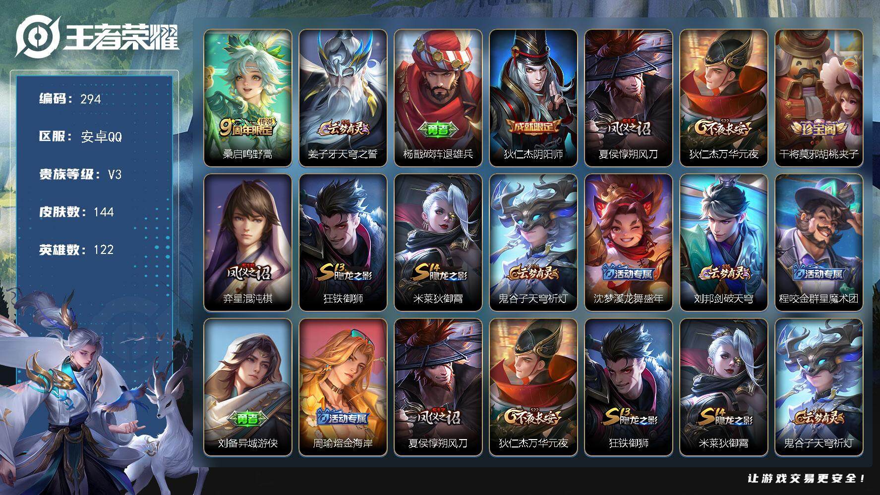 PX_2295055-Q-V3-荣耀黄金II段位-122英雄-144皮肤-1传说-16史诗 【英雄全皮】:影全皮 【传说皮肤】:桑启鸣野蒿 【限定皮肤】:姜子牙天穹之誓,杨戬破阵退雄兵,狄仁杰阴阳师,夏侯惇朔风刀,狄仁杰万华元夜,干将莫邪胡桃夹子,弈星混沌棋,狂铁御狮,米莱狄御霄,鬼谷子天穹祈灯,沈梦溪龙舞盛年,刘邦剑破天穹,程咬金群星魔术团,刘备异域游侠,周瑜熔金海岸 【赛季限定】:夏侯惇朔风刀,狄仁杰万华元夜,弈星混沌棋,狂铁御狮,米莱狄御霄,鬼谷子天穹祈灯,刘邦剑破天穹,姜子牙天穹之誓 【史诗皮肤】:露娜紫霞仙子,赵云未来纪元,甄姬冰雪圆舞曲,宫本武藏鬼剑武藏,孙尚香水果甜心,嬴政摇滚巨星,妲己魅力维加斯,吕布圣诞狂欢,吕布末日机甲,张飞乱世虎臣,花木兰水晶猎龙者,兰陵王暗隐猎兽者,安琪拉心灵骇客,铠曙光守护者,程咬金功夫厨神,狄仁杰鹰眼统帅 【其他皮肤】:韩信教廷特使,韩信街头霸王,露娜哥特玫瑰,阿轲爱心护理,赵云白执事,赵云忍炎影,芈月红桃皇后,白起白色死神,武则天东方不败,安琪拉玩偶对对碰,孙膑天使之翼,妲己少女阿狸,典韦黄金武士,亚瑟死亡骑士,花木兰兔女郎,张飞五福同心,甄姬花好人间,宫本武藏万象初新,狄仁杰阴阳师,关羽龙腾万里,钟无艳海滩丽影,宫本武藏霸王丸,王昭君幻想奇妙夜,狂铁命运角斗场,老夫子功夫老勺,鬼谷子幻乐之宴,狂铁御狮,苏烈坚韧之力,米莱狄御霄,明世隐虹云星官,张良幽兰居士,沈梦溪鲨炮海盗猫,夏侯惇朔风刀,弈星混沌棋,哪吒次元突破,鲁班七号黑桃队长,狂铁特工战影,狄仁杰万华元夜,刘禅秘密基地,张良缤纷绘卷,鲁班大师乓乓大师,干将莫邪胡桃夹子,程咬金无双福将,蒙恬蔚蓝守将,猪八戒潮玩探月行,太乙真人劲辣红锅,后羿完美运算,鬼谷子天穹祈灯,朵莉亚金色潮汐,廉颇功夫炙烤,沈梦溪龙舞盛年,钟无艳春野之旅,扁鹊无尽旅途,刘邦剑破天穹,盘古经纬探寻者,程咬金群星魔术团,大司命暗都幽影,刘备异域游侠,杨戬破阵退雄兵,姜子牙天穹之誓,周瑜熔金海岸,盘古敬我三分,东皇太一噬灭天穹,干将莫邪雾都夜雨,吕布逐霄战戟,苍苍林狼骑,太乙真人谧流熔炉,典韦铁骨偃魂,影魅影绮裳,西施雪境奇遇,姜子牙星梦巡礼,明世隐景韶洛都,戈娅玫蓝誓约,刘备浪漫序章,苏烈春野闲踪,小乔秘证寻踪,张良灵野札记,阿古朵布丁狗之约,露娜命运加冕,姬小满小满鸭,白起死霸装,庄周锦麟游梦,鲁班七号福禄兄弟,