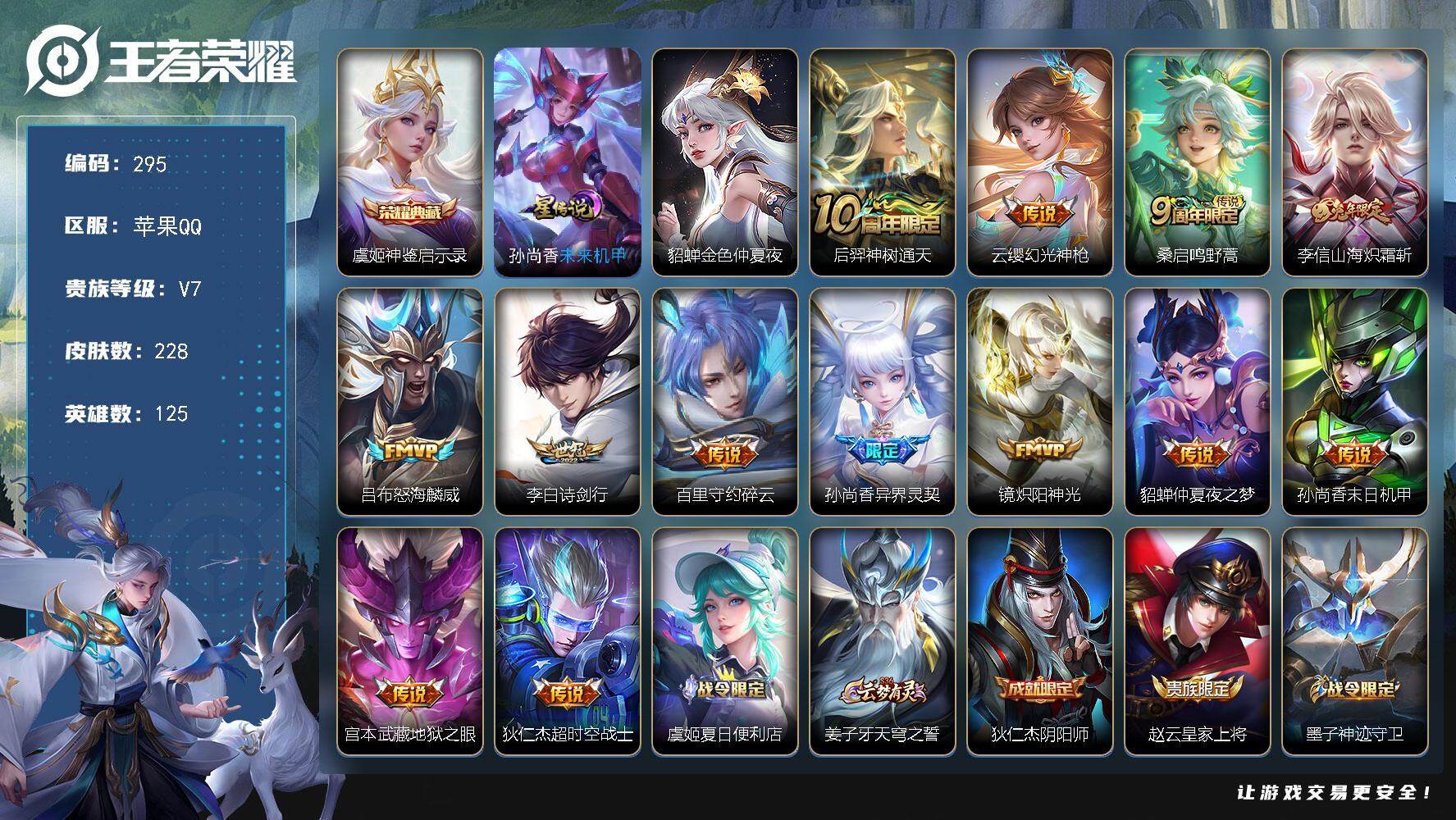 PX_2295139-Q-V7-最强王者段位-125英雄-228皮肤-1典藏皮肤-13传说-69史诗 【英雄全皮】:蒙恬全皮 【荣耀典藏】:虞姬神鉴启示录 【传说皮肤】:后羿神树通天,云缨幻光神枪,桑启鸣野蒿,李信山海炽霜斩,吕布怒海麟威,李白诗剑行,百里守约碎云,孙尚香异界灵契,镜炽阳神光,貂蝉仲夏夜之梦,孙尚香末日机甲,宫本武藏地狱之眼,狄仁杰超时空战士 【限定皮肤】:虞姬夏日便利店,姜子牙天穹之誓,狄仁杰阴阳师,赵云皇家上将,墨子神迹守卫,孙尚香异界灵契,庄周高山流水,高渐离死亡摇滚,高渐离玩趣恶龙,钟无艳超时空战士,白起夜都怪侠,芈月幻夜卜梦,元歌无心,甄姬落雪兰心,马可波罗逐梦之星,马可波罗暗影游猎,马可波罗山海玄木吟,狄仁杰魔术师,狄仁杰万华元夜,达摩沙漠行僧,项羽海滩派对,老夫子航海奇遇记,程咬金演武夺筹,韩信逐梦之影,兰陵王金庭之子,后羿圣弓游侠,李元芳云中旅人,钟馗驱傩正仪,干将莫邪真爱魔法,雅典娜黎明之约,太乙真人华丽摇滚,鬼谷子五谷丰年,黄忠火炮绅士,苏烈千军破阵,百里玄策原初追逐者,梦奇顽趣,沈梦溪大漠名商,明世隐吟游魔法,裴擒虎擒涛扼浪,李信山海炽霜斩,伽罗天狼溯光者,上官婉儿梁祝,上官婉儿神器万象笔,嫦娥拒霜思,嫦娥暖冬兔眠,蒙犽狂想玩偶喵,鲁班大师探海日志,镜匿光追影者,桑启海盐诗旅,暃星界游侠,艾琳女武神,张良古海寻踪,蒙恬荣光圣徽,鬼谷子天穹祈灯,沈梦溪龙舞盛年 【年限皮肤】:马可波罗山海玄木吟,李信山海炽霜斩 【赛季限定】:狄仁杰万华元夜,达摩沙漠行僧,程咬金演武夺筹,兰陵王金庭之子,张良古海寻踪,李元芳云中旅人,钟馗驱傩正仪,雅典娜黎明之约,苏烈千军破阵,百里玄策原初追逐者,梦奇顽趣,沈梦溪大漠名商,裴擒虎擒涛扼浪,鲁班大师探海日志,桑启海盐诗旅,鬼谷子天穹祈灯,蒙恬荣光圣徽,姜子牙天穹之誓 【战令限定】:墨子神迹守卫,虞姬夏日便利店,钟无艳超时空战士,白起夜都怪侠,芈月幻夜卜梦,甄姬落雪兰心,马可波罗暗影游猎,老夫子航海奇遇记,后羿圣弓游侠,干将莫邪真爱魔法,黄忠火炮绅士,明世隐吟游魔法,嫦娥暖冬兔眠,蒙犽狂想玩偶喵,暃星界游侠 【史诗皮肤】:鲁班七号电玩小子,露娜紫霞仙子,赵云皇家上将,赵云未来纪元,貂蝉圣诞恋歌,狄仁杰魔术师,宫本武藏鬼剑武藏,孙尚香水果甜心,嬴政暗夜贵公子,嬴政摇滚巨星,妲己魅力维加斯,墨子金属风暴,吕布圣诞狂欢,李白千