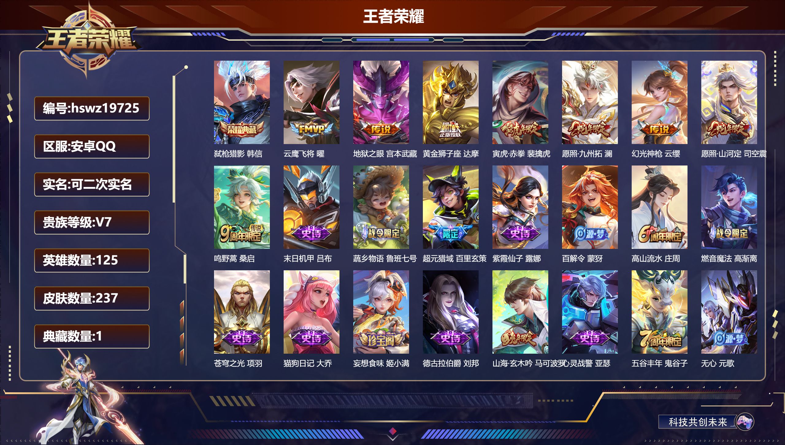 PX_2300165-Q/无双王者/237皮肤/125英雄/1典藏/0珍品无双/0无双/0珍品传说/8传说/72史诗/9稀有英雄 【1,典藏皮肤】弑枪猎影,韩信, 【8,传说皮肤】云鹰飞将,曜,地狱之眼,宫本武藏,黄金狮子座,达摩,寅虎·赤拳,裴擒虎,愿照·九州拓,澜,幻光神枪,云缨,愿照·山河定,司空震,鸣野蒿,桑启, 【72,史诗皮肤】末日机甲,吕布,蔬乡物语,鲁班七号,超元猎域,百里玄策,紫霞仙子,露娜,百解令,蒙犽,高山流水,庄周,燃音魔法,高渐离,苍穹之光,项羽,猫狗日记,大乔,妄想食味,姬小满,德古拉伯爵,刘邦,山海·玄木吟,马可波罗,心灵战警,亚瑟,五谷丰年,鬼谷子,无心,元歌,巫礼祀神,少司缘,鬼剑武藏,宫本武藏,百相守梦,黄忠,星夜王子,白起,摇滚巨星,嬴政,顽趣,梦奇,修罗,橘右京,拒霜思,嫦娥,魅力维加斯,妲己,黄金分割率,诸葛亮,乐园奇幻夜,钟馗,女仆咖啡,妲己,晚萤,娜可露露,猪悟能,猪八戒,舞动绿茵,蔡文姬,暗夜贵公子,嬴政,鹰眼统帅,狄仁杰,飞衡,韩信,李小龙,裴擒虎,光弋星穹,莱西奥,纤云弄巧,云中君,如梦令,后羿,金属风暴,墨子,傲雪梅枪,韩信,匿光侦查者,李元芳,特工魅影,百里守约,猫狗日记,孙策,逐浪之夏,李元芳,未来纪元,赵云,魔术师,狄仁杰,龙之律动,狂铁,皇家上将,赵云,梁祝,上官婉儿,天才门将,刘禅,云间偶戏,元歌,水晶猎龙者,花木兰,圣诞狂欢,吕布,青焰无极,镜,器灵·浮梦炉,赵怀真,白龙吟,韩信,永昼,夏洛特,地狱岩魂,廉颇,茶境仙,孙膑,蔷薇恋人,孙尚香,冰雪圆舞曲,甄姬,千年之狐,李白,节奏热浪,阿轲,心灵骇客,安琪拉,箭羽风息,伽罗,乱世虎臣,张飞,缤纷独角兽,小乔,水果甜心,孙尚香,化蝶舞,阿轲,江河有灵,阿古朵,幽灵船长,曹操,乘风破浪,夏侯惇,暗隐猎兽者,兰陵王, 【127,勇者皮肤】时空谍影,海诺,圆桌骑士,盾山,星际陆战队,达摩,沙漠行僧,达摩,暖冬絮语,程咬金,缤纷绘卷,张良,纽约教父,刘备,拳王,达摩,大发明家,达摩,龙舞盛年,沈梦溪,丁香结,小乔,功夫炙烤,廉颇,沉稳之力,孙尚香,海盐诗旅,桑启,醍醐杖,老夫子,归虚梦演,孙膑,汉昭烈帝,刘备,热血海滩,哪吒,白色死神,白起,黑桃队长,鲁班七号,黄金武士,典韦,阴阳师,狄仁杰,次元突破,哪吒,古海寻踪,张良,功夫老勺,老夫子,鲨炮海盗猫,沈梦溪,虎啸剑宗,刘邦,海滩派对,项羽,完美运算,后羿,万华元夜,狄仁杰,踏浪烽翎,莱西奥,演武夺筹,程咬金,红桃皇后,芈月,西部游侠,莱西奥,野性能量,吕布,哥特玫瑰,露娜,守护之力,大乔,无双福将,程咬金,瓷语鉴心,露娜,原初探秘者,鬼谷子,星空之诺,沈梦溪,潮玩探月行,猪八戒,鸿运当头,亚瑟,天穹祈灯,鬼谷子,决胜大满贯,曹操,疑决卦,明世隐,化身博士,扁鹊,潮玩骑士王,亚瑟,次元傲视,杨戬,幻乐之宴,鬼谷子,虹云星官,明世隐,死亡骑士,亚瑟,浪漫序章,刘备,敏锐之力,李白,危途狂花,戈娅,胡桃狂想曲,蒙犽,破局者,亚连,掌控之力,诸葛亮,海滩丽影,钟无艳,忍·炎影,赵云,雪境奇遇,西施,炽热元素使,姜子牙,坚韧之力,苏烈,擒涛扼浪,裴擒虎,乓乓大师,鲁班大师,探海日志,鲁班大师,天使之翼,孙膑,雾都夜雨,干将莫邪,兔女郎,花木兰,龙腾万里,关羽,金庭之子,兰陵王,未来纪元,宫本武藏,千军破阵,苏烈,往忆晖光,明世隐,荣光之誓,亚瑟,花好人间,甄姬,万象初新,宫本武藏,聚星闪耀,钟无艳,时尚教父,姜子牙,春野之旅,钟无艳,秘密基地,刘禅,教廷特使,韩信,街头霸王,韩信,云中旅人,李元芳,妄想特派,李元芳,西部大镖客,孙悟空,重装意志,盘古,蔬乡物语,李元芳,少女阿狸,妲己,灵卜魔法,妲己,混沌棋,弈星,蔚蓝守将,蒙恬,春野闲踪,苏烈,布丁狗之约,阿古朵,命运加冕,露娜,小满鸭,姬小满,幻想奇妙夜,王昭君,灵野札记,张良,驱傩正仪,钟馗,命运角斗场,狂铁,死霸装,白起,特工战影,狂铁,虚灵犬护,钟馗,白执事,赵云,华丽摇滚,太乙真人,劲辣红锅,太乙真人,剑破天穹,刘邦,苍威无极,项羽,铁骨偃魂,典韦,熔金海岸,周瑜,苍林狼骑,苍,天穹之誓,姜子牙,访茗客,马超,星梦巡礼,姜子牙,破阵·退雄兵,杨戬,谧流熔炉,太乙真人,群星魔术团,程咬金,鹤鸣心笺,艾琳,锦麟游梦,庄周,云械蓝图,云中君,逆浪荇歌,甄姬,噬灭天穹,东皇太一,灵卦秘语,少司缘,敬我三分,盘古,爆裂喵拳,达摩,玫蓝誓约,戈娅,景韶洛都,明世隐, 【29,其他皮肤】前尘,金蝉,潮流仙人,老夫子,灼热之刃,李信,精灵王,后羿,冰刃幻境,镜,午夜歌剧院,元歌,启蛰,司空震,花间舞,公孙离,街头旋风,裴擒虎,激情绿茵,马可波罗,埃及法老,杨戬,阿摩司公爵,鬼谷子,画中游,桑启,年年有余,猪八戒,尼罗河女神,女娲,一千零一夜,张良,归虚梦演,曜,威尼斯狂欢,百里玄策,战争女神,雅典娜,特种部队,李元芳,绝影神枪,百里守约,孤猎,澜,加勒比小姐,虞姬,踏雪寻梅,弈星,赤焰之缨,云缨,露花倒影,嫦娥,美梦成真,梦奇,天启骑士,关羽,西部大镖客,孙悟空, 【9,稀有英雄】敖隐,嬴政,不知火舞,橘右京,夏洛特,娜可露露,韩信,艾琳,赵云, 营地ID:,,