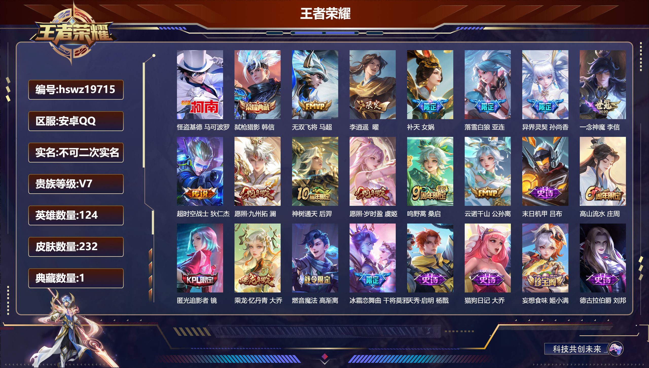 PX_2300120-Q/绝世王者/232皮肤/124英雄/1典藏/0珍品无双/0无双/1珍品传说/12传说/78史诗/9稀有英雄 【1,珍品传说】怪盗基德,马可波罗, 【1,典藏皮肤】弑枪猎影,韩信, 【12,传说皮肤】无双飞将,马超,李逍遥,,曜,补天,女娲,落雪白狼,亚连,异界灵契,孙尚香,一念神魔,李信,超时空战士,狄仁杰,愿照·九州拓,澜,神树通天,后羿,愿照·岁时盈,虞姬,鸣野蒿,桑启,云诺千山,公孙离, 【78,史诗皮肤】末日机甲,吕布,高山流水,庄周,匿光追影者,镜,乘龙·忆丹青,大乔,燃音魔法,高渐离,冰霜恋舞曲,干将莫邪,天秀·启明,杨戬,猫狗日记,大乔,妄想食味,姬小满,德古拉伯爵,刘邦,山海·玄木吟,马可波罗,心灵战警,亚瑟,五谷丰年,鬼谷子,无心,元歌,鬼剑武藏,宫本武藏,百相守梦,黄忠,星夜王子,白起,无限星赏官,公孙离,摇滚巨星,嬴政,电玩高手,狂铁,顽趣,梦奇,修罗,橘右京,拒霜思,嫦娥,魅力维加斯,妲己,黄金分割率,诸葛亮,苍鳞隐世,白起,荣光圣徽,蒙恬,女仆咖啡,妲己,赏金猎手,澜,星界游侠,暃,暗夜贵公子,嬴政,鹰眼统帅,狄仁杰,匿光启智者,鲁班大师,李小龙,裴擒虎,金属风暴,墨子,特工魅影,百里守约,猫狗日记,孙策,原初追逐者,百里玄策,逐浪之夏,李元芳,真我赫兹,百里守约,未来纪元,赵云,黎明之约,雅典娜,魔术师,狄仁杰,龙之律动,狂铁,顽岩魄,蒙犽,皇家上将,赵云,冰冠公主,雅典娜,功夫厨神,程咬金,东方月初,大司命,天才门将,刘禅,圣诞恋歌,貂蝉,水晶猎龙者,花木兰,涂山容容,公孙离,破空之剑,亚连,心动手记,海诺,器灵·浮梦炉,赵怀真,星界战将,牛魔,地狱岩魂,廉颇,虎魄,张飞,蔷薇恋人,孙尚香,冰雪圆舞曲,甄姬,青蛇,小乔,月团寄思,沈梦溪,航海奇遇记,老夫子,节奏热浪,阿轲,寅虎·展翼,孙膑,心灵骇客,安琪拉,箭羽风息,伽罗,乱世虎臣,张飞,万物之道,弈星,王者之锤,钟无艳,陌上桑,艾琳,真爱魔法,干将莫邪,水果甜心,孙尚香,化蝶舞,阿轲,绮世丹青,狄仁杰,幽灵船长,曹操,乘风破浪,夏侯惇, 【110,勇者皮肤】圆桌骑士,盾山,太极少年,赵怀真,沙漠行僧,达摩,大漠名商,沈梦溪,缤纷绘卷,张良,纽约教父,刘备,龙舞盛年,沈梦溪,丁香结,小乔,功夫炙烤,廉颇,沉稳之力,孙尚香,海盐诗旅,桑启,醍醐杖,老夫子,白色死神,白起,黄金武士,典韦,王牌新星,海月,阴阳师,狄仁杰,次元突破,哪吒,古海寻踪,张良,牛运亨通,牛魔,功夫老勺,老夫子,鲨炮海盗猫,沈梦溪,海滩派对,项羽,万华元夜,狄仁杰,制霸全明星,牛魔,踏浪烽翎,莱西奥,演武夺筹,程咬金,西部游侠,莱西奥,野性能量,吕布,哥特玫瑰,露娜,守护之力,大乔,无双福将,程咬金,瓷语鉴心,露娜,原初探秘者,鬼谷子,潮玩探月行,猪八戒,天穹祈灯,鬼谷子,阿尔法小队,后羿,金色潮汐,朵莉亚,星际陆战队,程咬金,幻乐之宴,鬼谷子,霸王丸,宫本武藏,虹云星官,明世隐,救世之瞳,扁鹊,死亡骑士,亚瑟,敏锐之力,李白,危途狂花,戈娅,破局者,亚连,玩偶对对碰,安琪拉,掌控之力,诸葛亮,海滩丽影,钟无艳,圣弓游侠,后羿,忍·炎影,赵云,雪境奇遇,西施,坚韧之力,苏烈,唤灵魔甲,刘禅,擒涛扼浪,裴擒虎,乓乓大师,鲁班大师,死亡摇滚,高渐离,探海日志,鲁班大师,天使之翼,孙膑,雾都夜雨,干将莫邪,兔女郎,花木兰,龙腾万里,关羽,金庭之子,兰陵王,未来纪元,宫本武藏,千军破阵,苏烈,零食大作战,姬小满,荣光之誓,亚瑟,花好人间,甄姬,万象初新,宫本武藏,潮玩造梦师,刘备,时尚教父,姜子牙,秘密基地,刘禅,教廷特使,韩信,街头霸王,韩信,云中旅人,李元芳,神迹守卫,墨子,灵卜魔法,妲己,蔚蓝守将,蒙恬,春野闲踪,苏烈,布丁狗之约,阿古朵,暖冬·兔眠,嫦娥,命运加冕,露娜,午后时光,王昭君,幻想奇妙夜,王昭君,灵野札记,张良,驱傩正仪,钟馗,死霸装,白起,虚灵犬护,钟馗,华丽摇滚,太乙真人,劲辣红锅,太乙真人,神迹守卫,孙悟空,剑破天穹,刘邦,异域游侠,刘备,铁骨偃魂,典韦,熔金海岸,周瑜,苍林狼骑,苍,天穹之誓,姜子牙,魅影绮裳,影,长夏之忆,貂蝉,星梦巡礼,姜子牙,谧流熔炉,太乙真人,暗都幽影,大司命,鹤鸣心笺,艾琳,锦麟游梦,庄周,逆浪荇歌,甄姬,噬灭天穹,东皇太一,灵卦秘语,少司缘,敬我三分,盘古,玫蓝誓约,戈娅,景韶洛都,明世隐, 【31,其他皮肤】前尘,金蝉,三太子,哪吒,棒球奇才,沈梦溪,极冰防御线,盾山,爱与和平,苏烈,第七人偶,干将莫邪,灼热之刃,李信,精灵王,后羿,碧珀绯影,暃,海军大将,周瑜,午夜歌剧院,元歌,归虚梦演,鲁班大师,东海龙王,东皇太一,修竹墨客,上官婉儿,范海辛,李白,维京掠夺者,苍,占星师,明世隐,激情绿茵,马可波罗,归虚梦演,西施,阿摩司公爵,鬼谷子,尼罗河女神,女娲,归虚梦演,曜,幸存者,马超,绝影神枪,百里守约,蔷薇王座,蔡文姬,加勒比小姐,虞姬,踏雪寻梅,弈星,赤焰之缨,云缨,美梦成真,梦奇,圆桌骑士,太乙真人,怪盗基德,马可波罗, 【9,稀有英雄】敖隐,嬴政,不知火舞,橘右京,夏洛特,娜可露露,韩信,艾琳,赵云, 营地ID:,