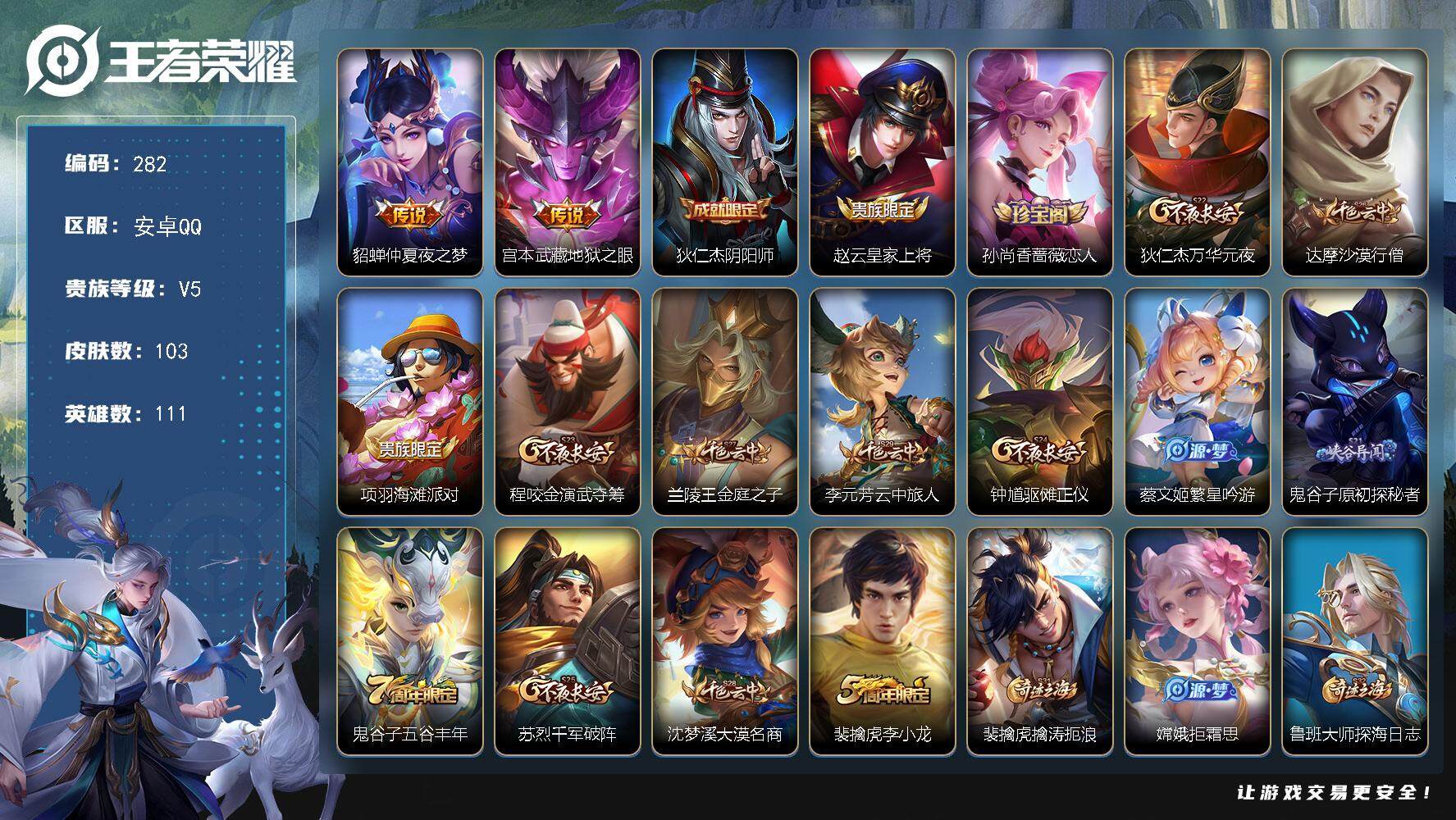 PX_2295072-Q-V5-永恒钻石V段位-111英雄-103皮肤-2传说-22史诗 【英雄全皮】:孙权全皮 【传说皮肤】:貂蝉仲夏夜之梦,宫本武藏地狱之眼 【限定皮肤】:狄仁杰阴阳师,赵云皇家上将,孙尚香蔷薇恋人,狄仁杰万华元夜,达摩沙漠行僧,项羽海滩派对,程咬金演武夺筹,兰陵王金庭之子,李元芳云中旅人,钟馗驱傩正仪,蔡文姬繁星吟游,鬼谷子原初探秘者,鬼谷子五谷丰年,苏烈千军破阵,沈梦溪大漠名商,裴擒虎李小龙,裴擒虎擒涛扼浪,嫦娥拒霜思,鲁班大师探海日志,桑启海盐诗旅,张良古海寻踪,鬼谷子天穹祈灯,周瑜熔金海岸 【赛季限定】:狄仁杰万华元夜,达摩沙漠行僧,程咬金演武夺筹,兰陵王金庭之子,张良古海寻踪,李元芳云中旅人,钟馗驱傩正仪,鬼谷子原初探秘者,苏烈千军破阵,沈梦溪大漠名商,裴擒虎擒涛扼浪,鲁班大师探海日志,桑启海盐诗旅,鬼谷子天穹祈灯 【史诗皮肤】:赵云皇家上将,貂蝉圣诞恋歌,孙尚香蔷薇恋人,孙尚香水果甜心,妲己魅力维加斯,妲己女仆咖啡,墨子金属风暴,吕布圣诞狂欢,李白千年之狐,安琪拉心灵骇客,蔡文姬舞动绿茵,程咬金功夫厨神,蔡文姬繁星吟游,瑶遇见神鹿,裴擒虎李小龙,嫦娥拒霜思,貂蝉唤灵魅影,鬼谷子五谷丰年,弈星万物之道,狂铁龙之律动,公孙离涂山容容,女娲万灵启世 【其他皮肤】:项羽海滩派对,韩信教廷特使,露娜哥特玫瑰,赵云忍炎影,白起白色死神,牛魔西部大镖客,武则天东方不败,安琪拉玩偶对对碰,姜子牙时尚教父,妲己少女阿狸,亚瑟死亡骑士,达摩拳王,花木兰兔女郎,宫本武藏万象初新,后羿阿尔法小队,狄仁杰阴阳师,刘备汉昭烈帝,王昭君幻想奇妙夜,明世隐虹云星官,孙膑归虚梦演,鲁班七号黑桃队长,鬼谷子原初探秘者,狄仁杰万华元夜,刘禅秘密基地,程咬金演武夺筹,张良缤纷绘卷,钟馗驱傩正仪,鲁班大师乓乓大师,苏烈千军破阵,达摩沙漠行僧,程咬金无双福将,兰陵王金庭之子,沈梦溪大漠名商,李元芳云中旅人,戈娅危途狂花,桑启海盐诗旅,海月幻泉雾影,赵怀真太极少年,裴擒虎擒涛扼浪,太乙真人劲辣红锅,鲁班大师探海日志,张良古海寻踪,鬼谷子天穹祈灯,廉颇功夫炙烤,周瑜熔金海岸,东皇太一噬灭天穹,苍苍林狼骑,太乙真人谧流熔炉,典韦铁骨偃魂,西施雪境奇遇,少司缘灵卦秘语,钟馗虚灵犬护,阿古朵布丁狗之约,莱西奥踏浪烽翎,哪吒罗小黑战记,亚瑟荣光之誓,孙权径山谋武,艾琳鹤鸣心笺,鲁班七号木偶奇遇记,貂蝉异域